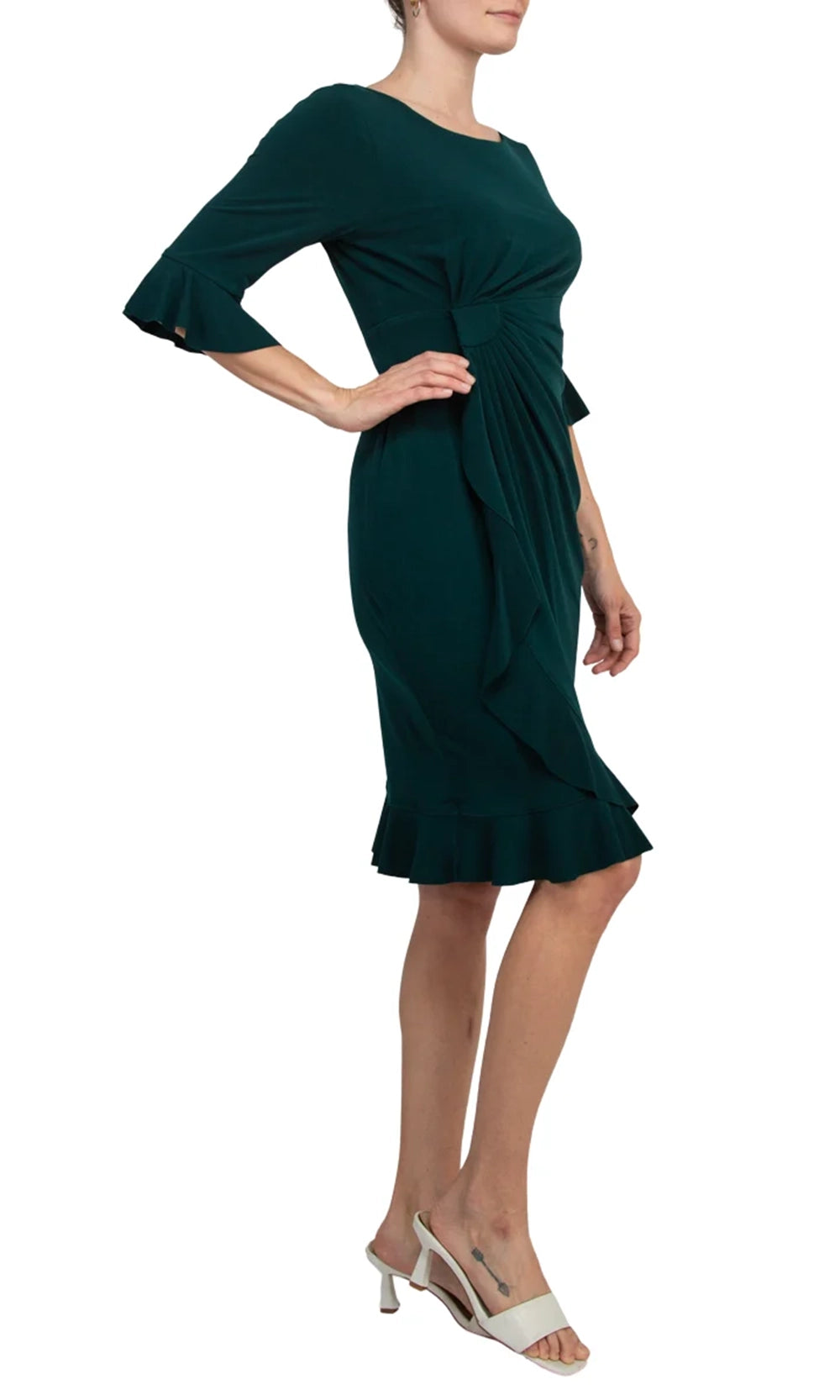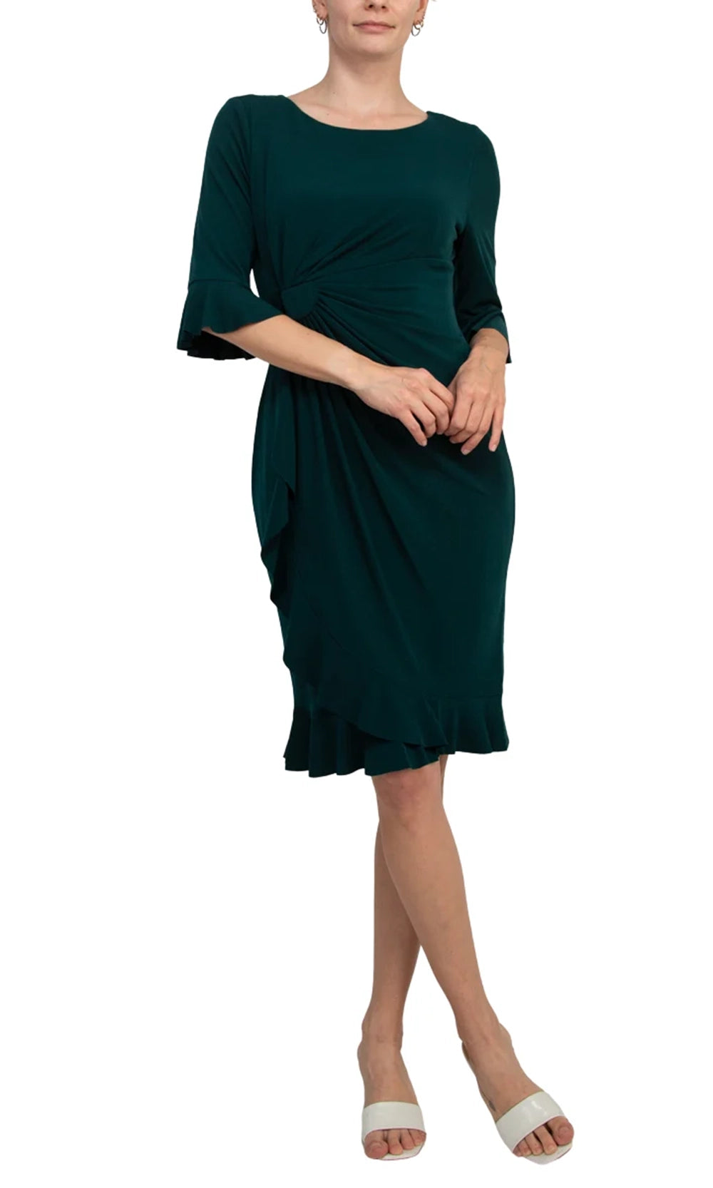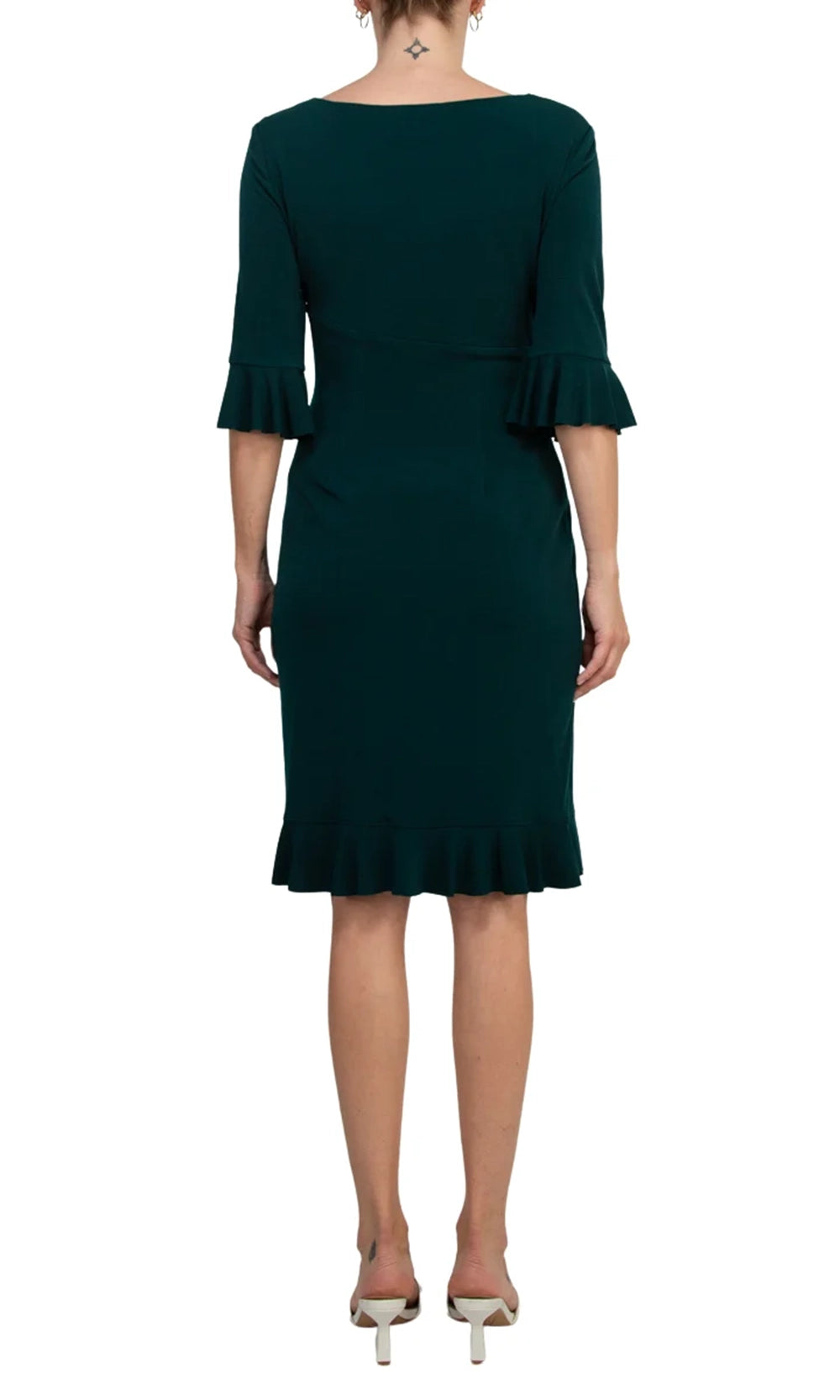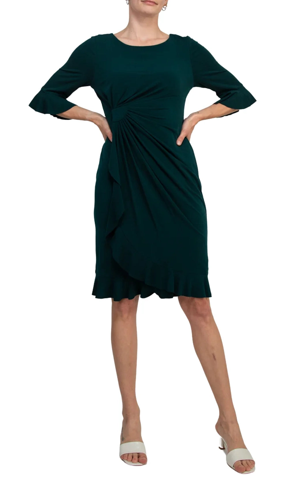 A timeless silhouette meets thoughtful detailing in the Connected Apparel T1317138M1 dress. This piece offers a figure-flattering design with its gathered front drape that draws attention to the waistline while maintaining fluidity through the sheath skirt. The three-quarter bell sleeves feature delicate ruffle cuffs that add a feminine touch without overpowering the clean lines of the bodice. Finished with a knee-length hem trimmed with subtle ruffles, this dress strikes the perfect balance of elegance and modern charm. The Connected Apparel T1317138M1 is a polished choice for versatile styling. Model is wearing Hunter color.