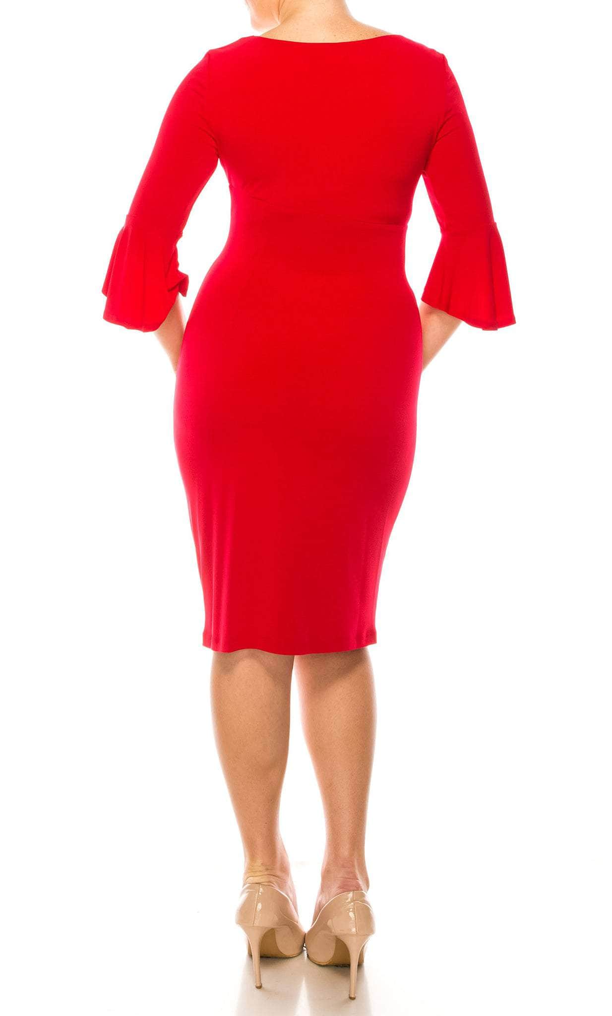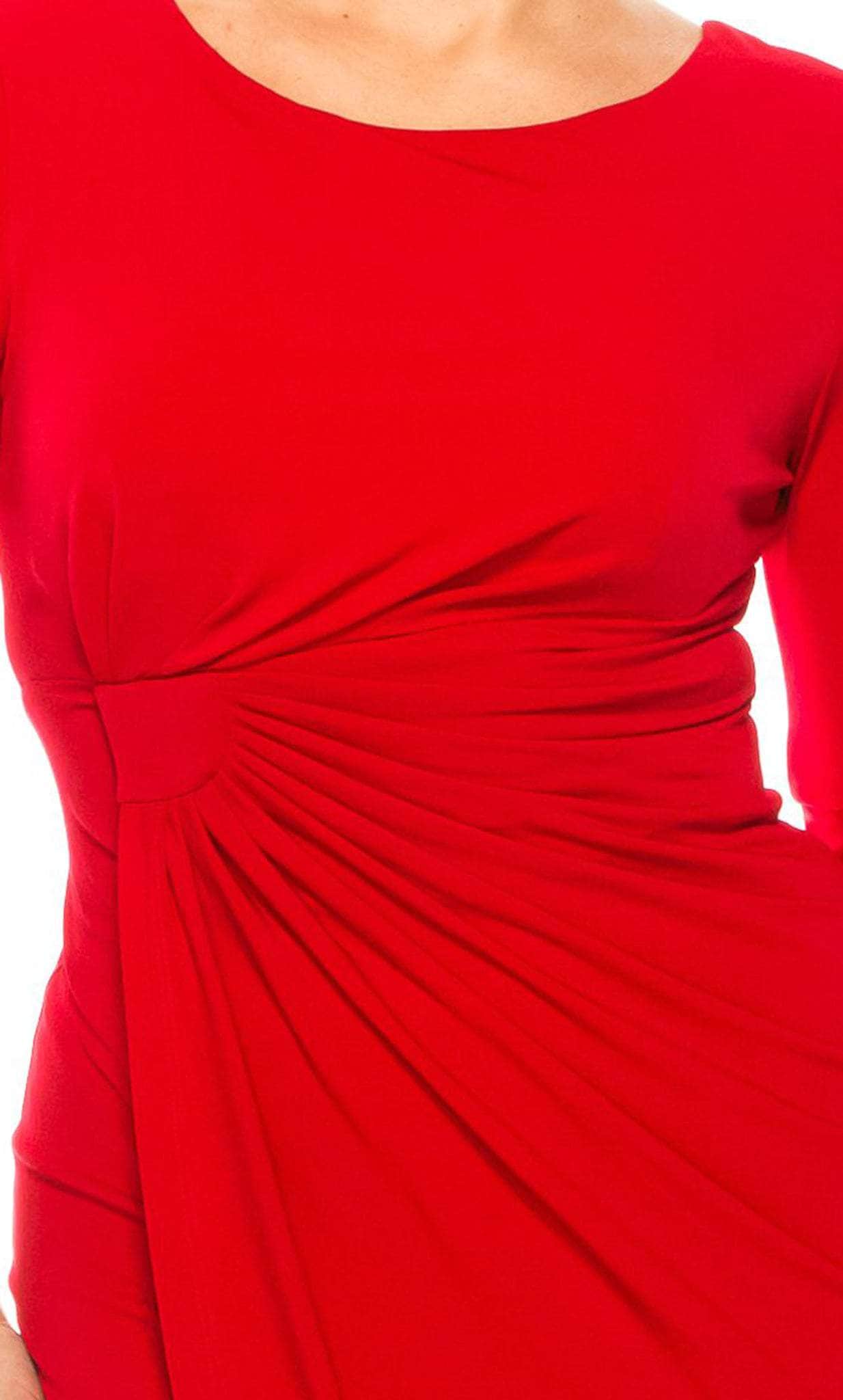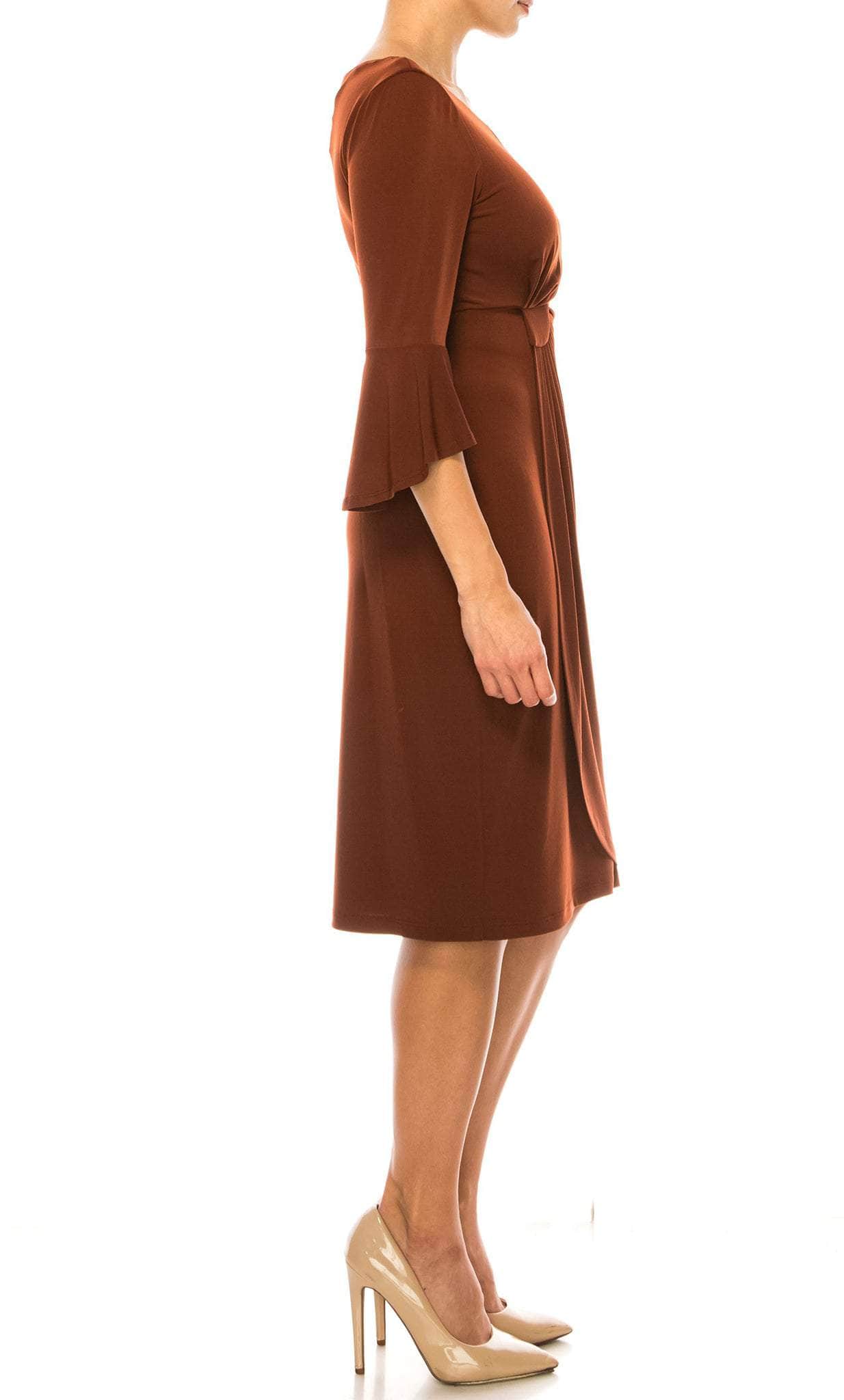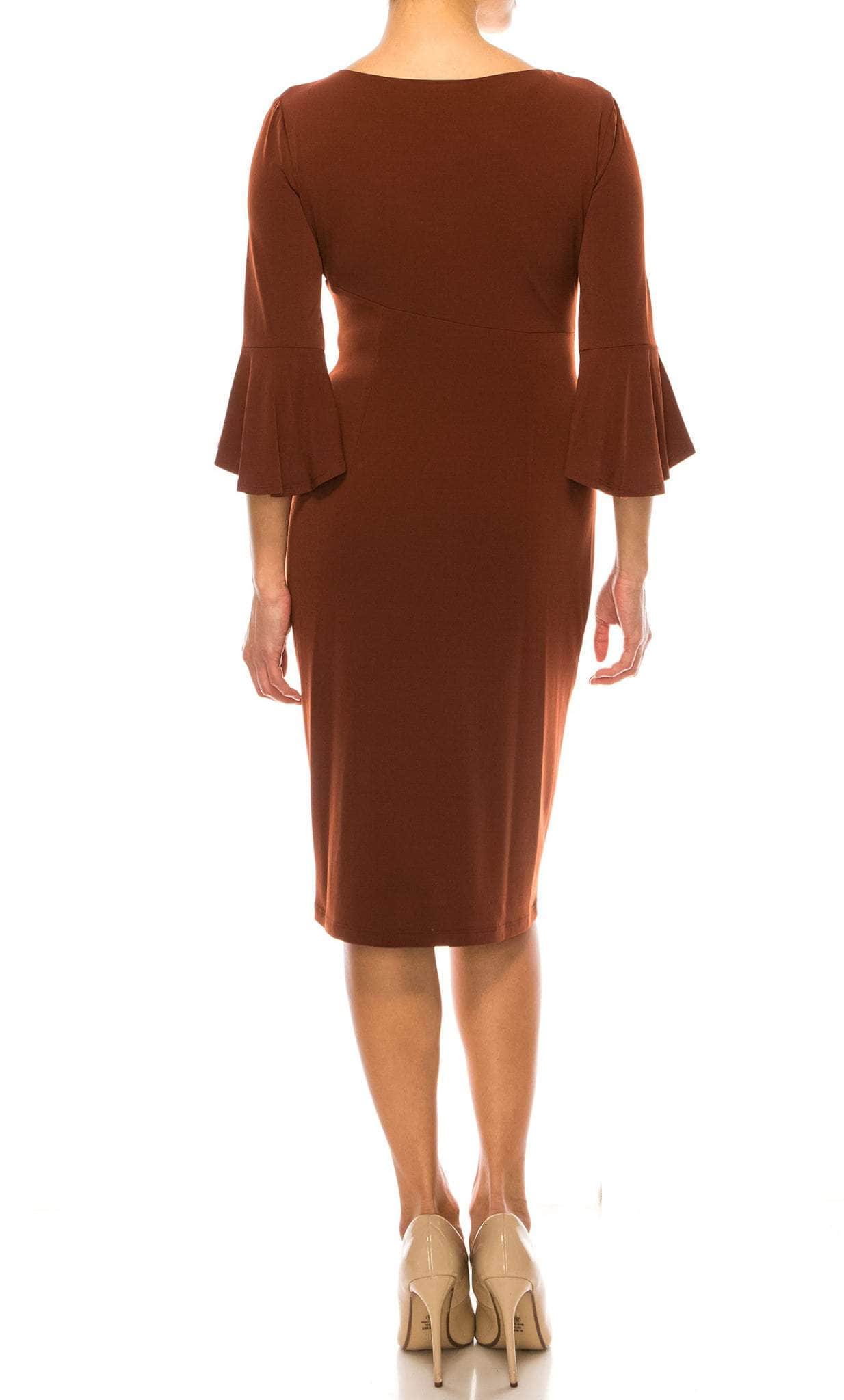 Be ready to charm everyone in this creation by Connected Apparel T1317971. This simple yet classy dress is made of soft jersey fabric with ruched faux wrap details for a figure-flattering look. It offers a scoop neckline, closed back and quarter length bell sleeves. The skirt tailors into a sheath silhouette and runs in a knee length hemline. This Connected Apparel T1317971 cocktail dress is sure to be both comfy and fashionable. Models are wearing the Cinnamon, Red and Hunter Green colors.