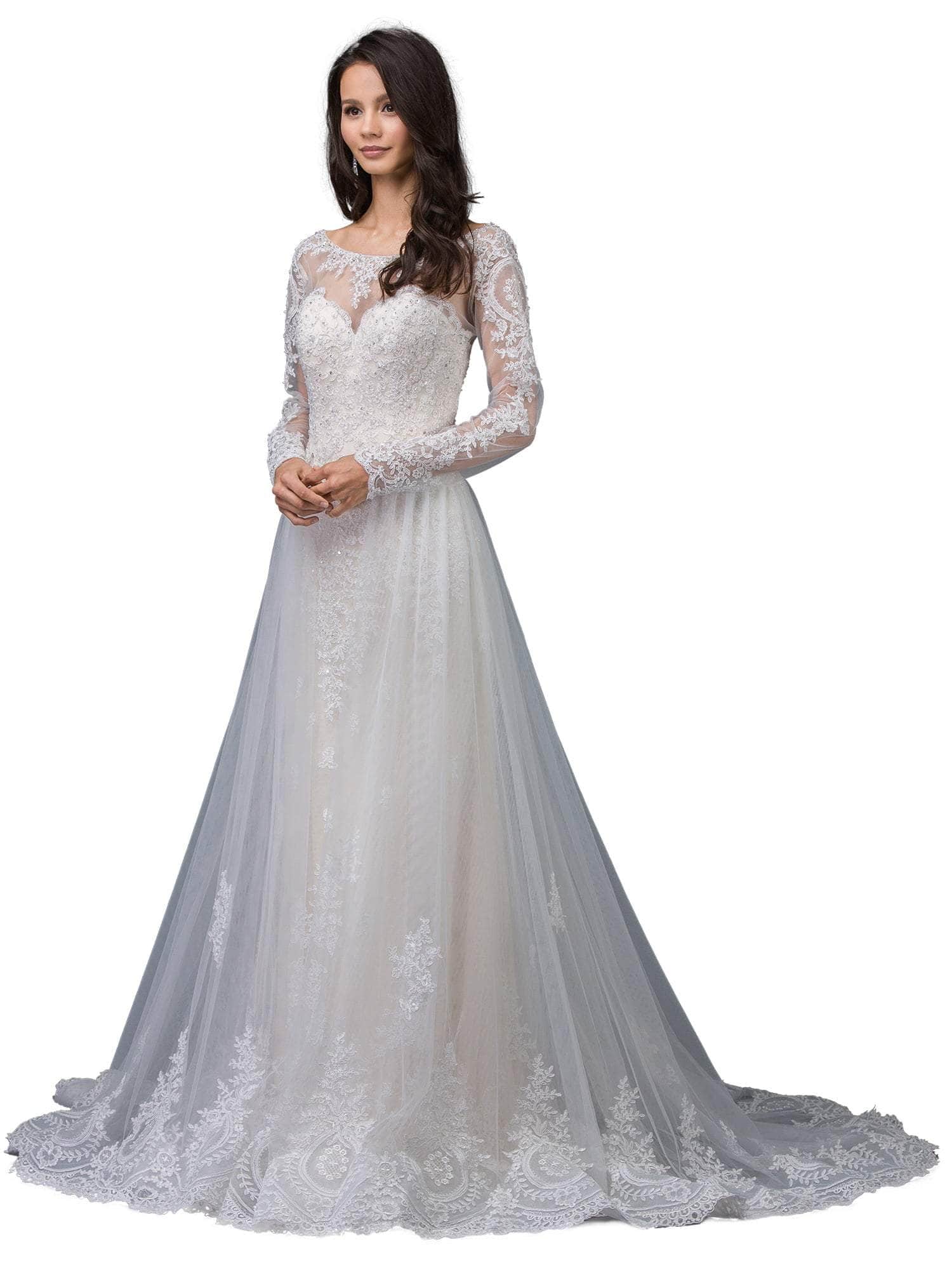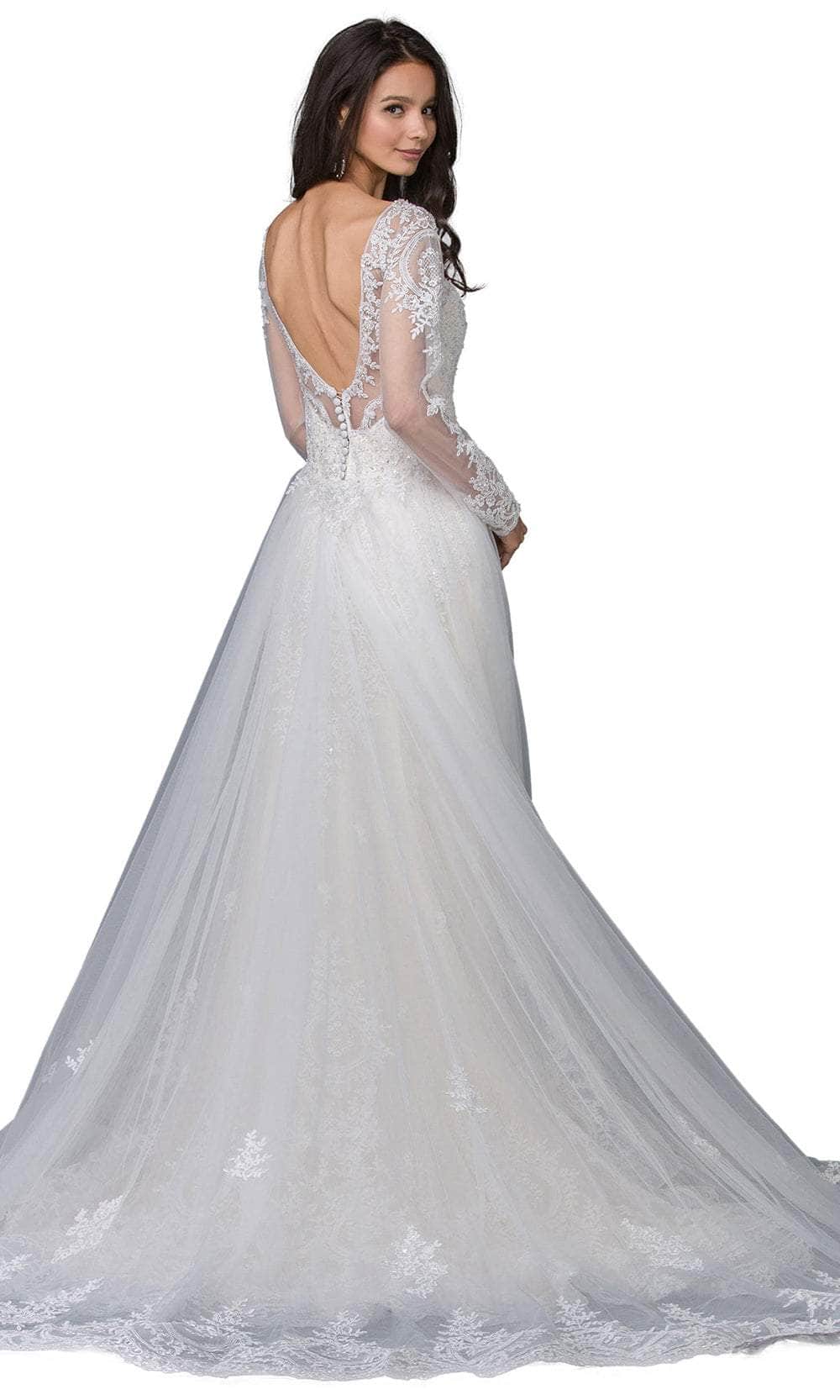 Enter a world of luxury with the captivating Dancing Queen 0009 gown, created to leave a lasting impression on your wedding day. The dress is framed with sheer long sleeves and a fitted bodice, and it has sparkling decorations and delicate lace appliqué. The V-shaped open back, fastened with buttons, is complemented by an illusion neck featuring a sweetheart notch. The floor-length skirt culminates in a lovely train and parades in an A-line silhouette. With the Dancing Queen 0009, a couture masterpiece that guarantees you sparkle with timeless elegance on your wedding day, you will radiate beauty and charm. Model is wearing Ivory/Champagne color.