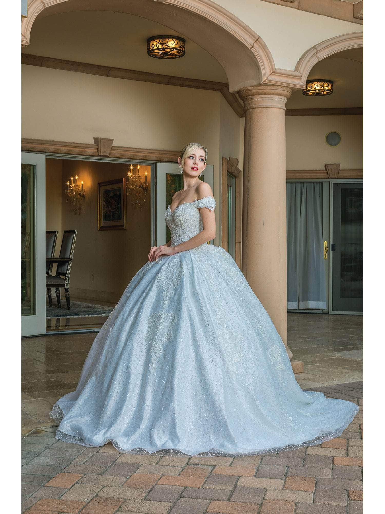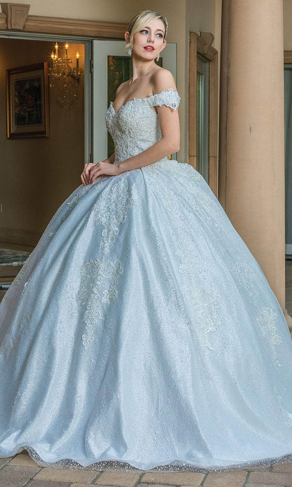 With the stunning Dancing Queen 0169 ballgown, you may enter an opulent universe that is sure to make your special day one to remember. The captivating ball gown has a sweetheart neckline, an off-the-shoulder fitted bodice, and sparkling embellishments. An ideal fit is guaranteed by a lace-up back. The skirt cascades to the floor and ends in a train. Dancing Queen 0169 is a couture masterpiece that will make you seem stunning and graceful on your big day. It guarantees that you will radiate beauty and grace. Model is wearing Off-White color.