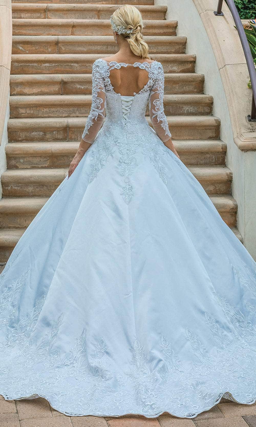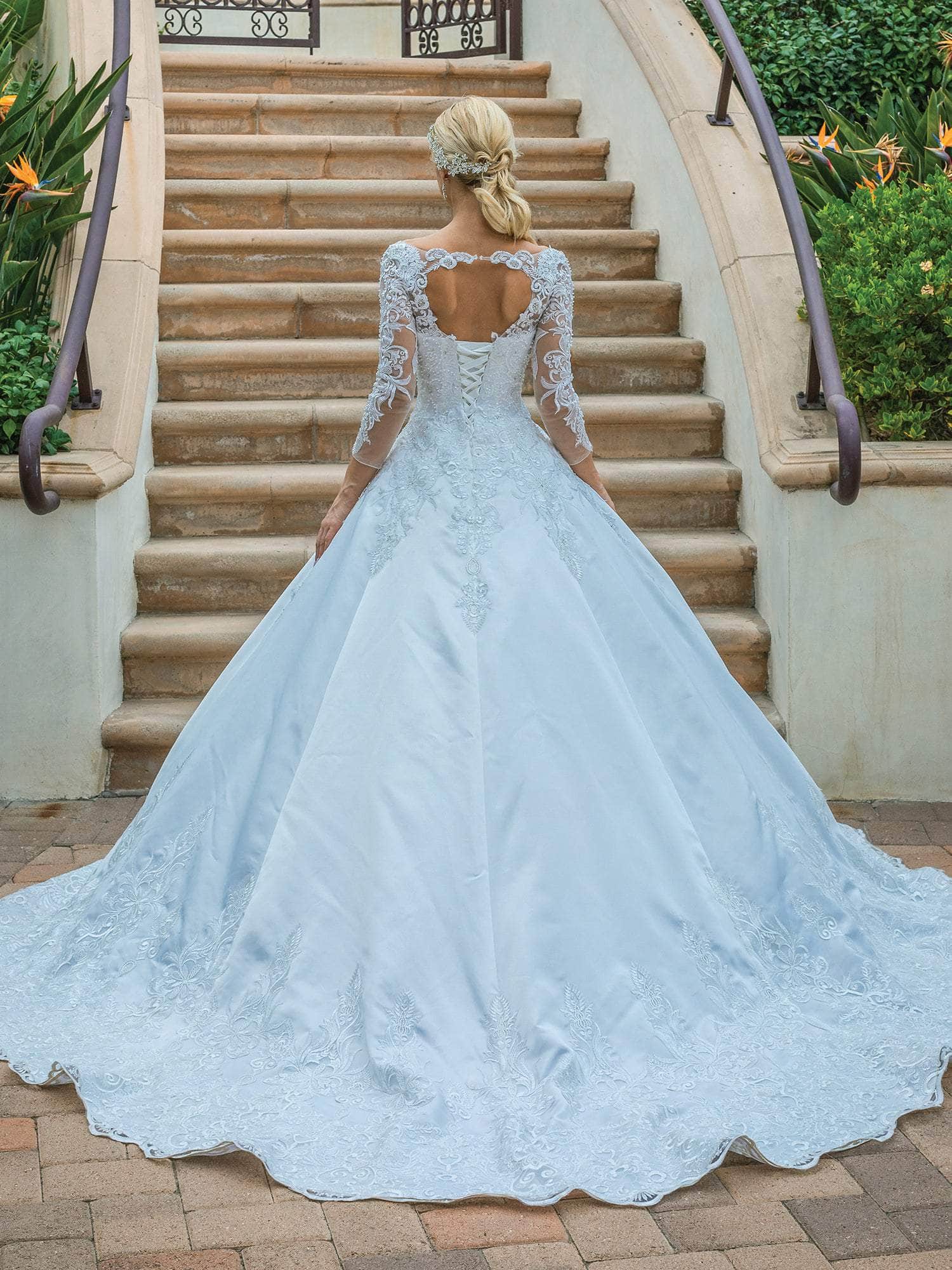 Transform your special day into a fairytale with the enchanting Dancing Queen 0172 ballgown, designed to captivate and enchant. The Dancing Queen 0172 ballgown features intricate lace appliqué and sheer long sleeves framing a fitted bodice, crowned with a sweetheart neckline. A back cut-out, lace-up back, and center zipper closure ensure a perfect fit. The floor-length skirt flows beautifully, ending with a graceful train. Radiate elegance and charm with the Dancing Queen 0172, a couture masterpiece that guarantees you shine with timeless beauty on your special day. Model is wearing Off-White color.