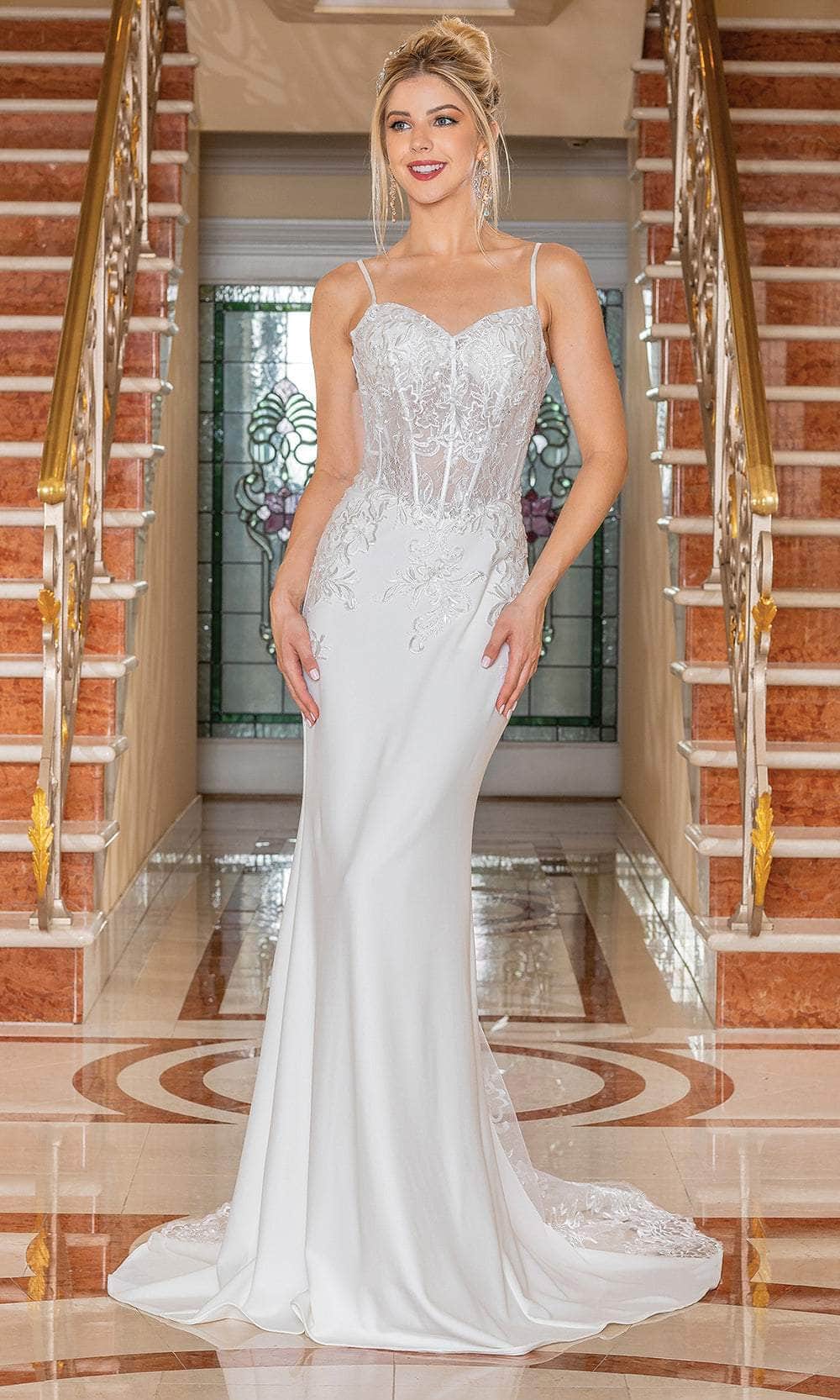 Embrace timeless romance with the enchanting Dancing Queen 0204 bridal gown, designed to make your special day unforgettable. This gown features intricate embroideries on a sleeveless corset bodice, crowned with a sweetheart neckline and supported by delicate spaghetti straps. The crisscross lace-up back ensures a perfect fit. The floor-length skirt parades in a sheath silhouette, highlighted by a back slit with a sheer insert and finishing with a graceful train. Shine with elegance and beauty in the Dancing Queen 0204. Model is wearing Off-White color.