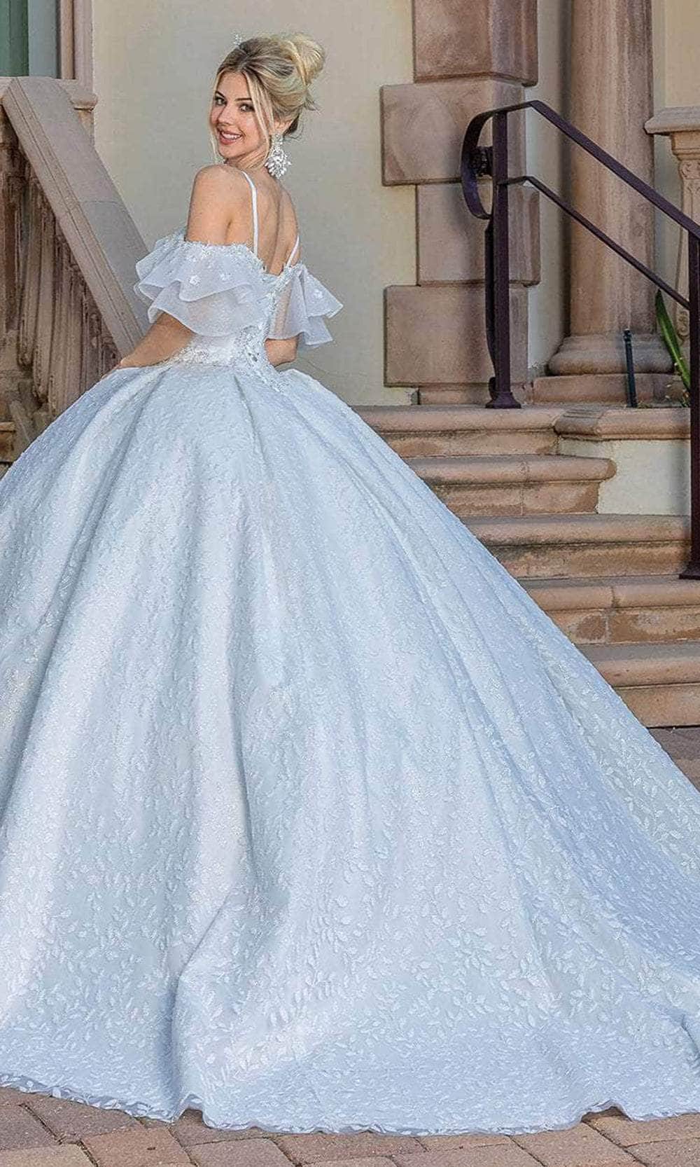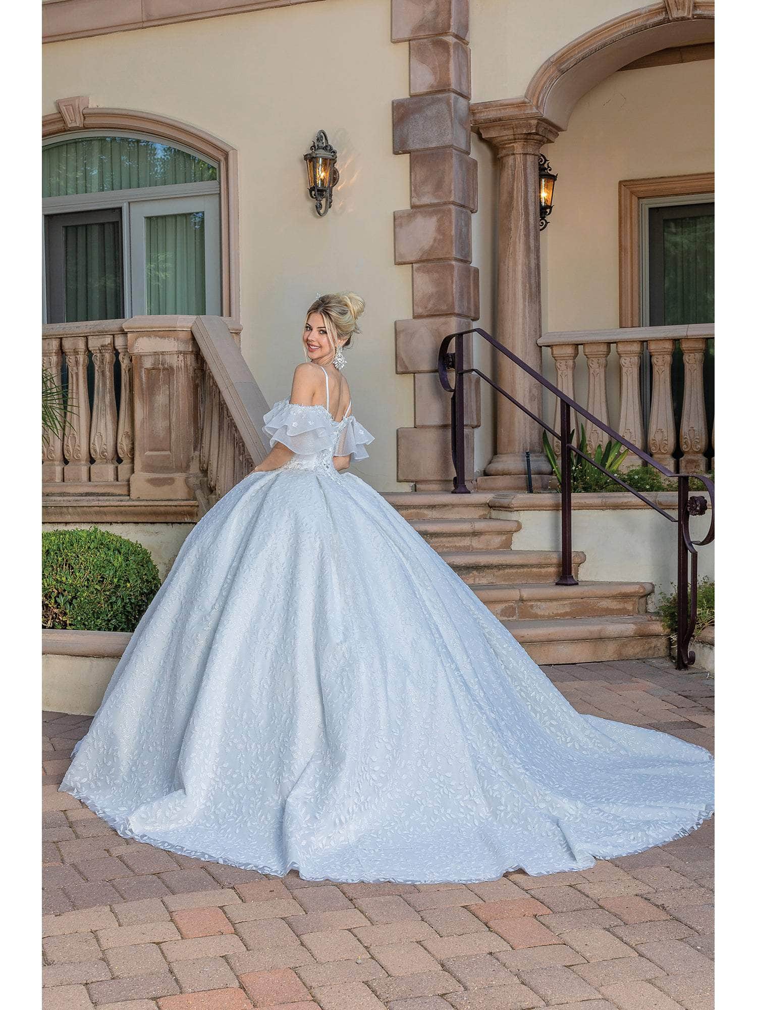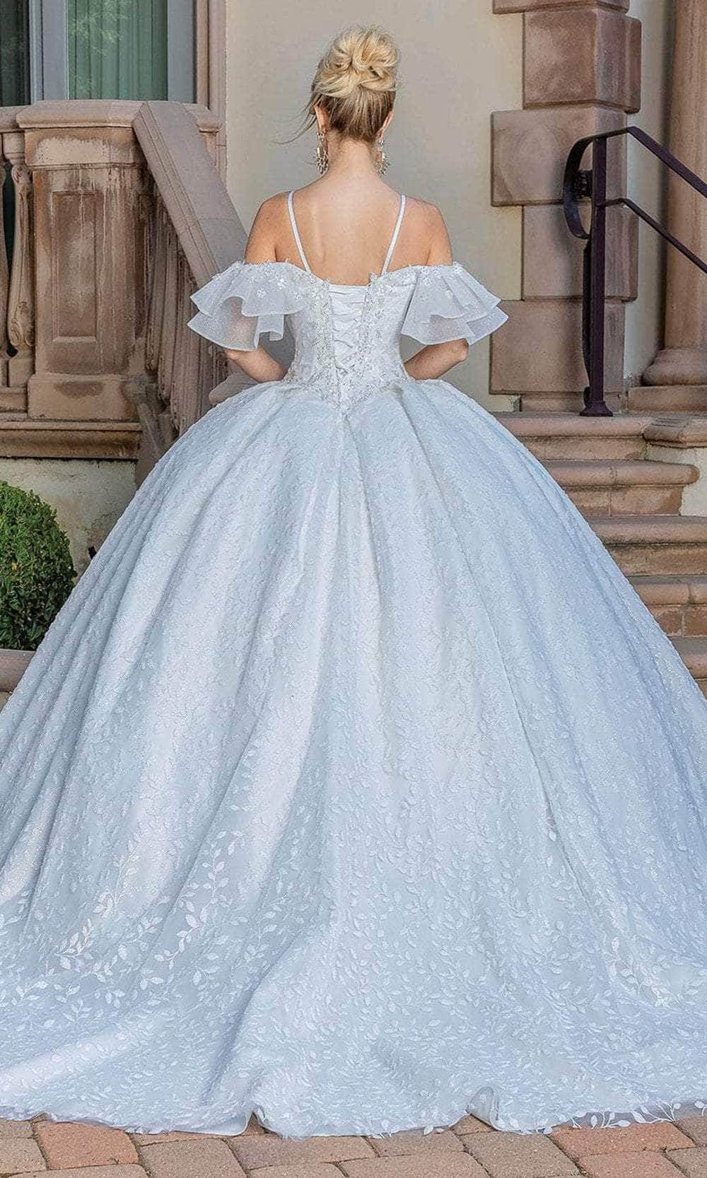 Unveil your inner princess with the captivating Dancing Queen 0228 ballgown, designed to enchant and dazzle at any grand occasion. The ballgown features a cold shoulder and ruffle off-shoulder fitted bodice adorned with intricate embroidery. It is crowned with a sweetheart neckline and includes a lace-up tie for a perfect fit. The gown is finished with an elegant train, creating a stunning and graceful silhouette. Step into the spotlight and make an unforgettable entrance with the Dancing Queen 0228, a masterpiece of elegance and charm that ensures you shine all night long. Model is wearing Off-White color.
