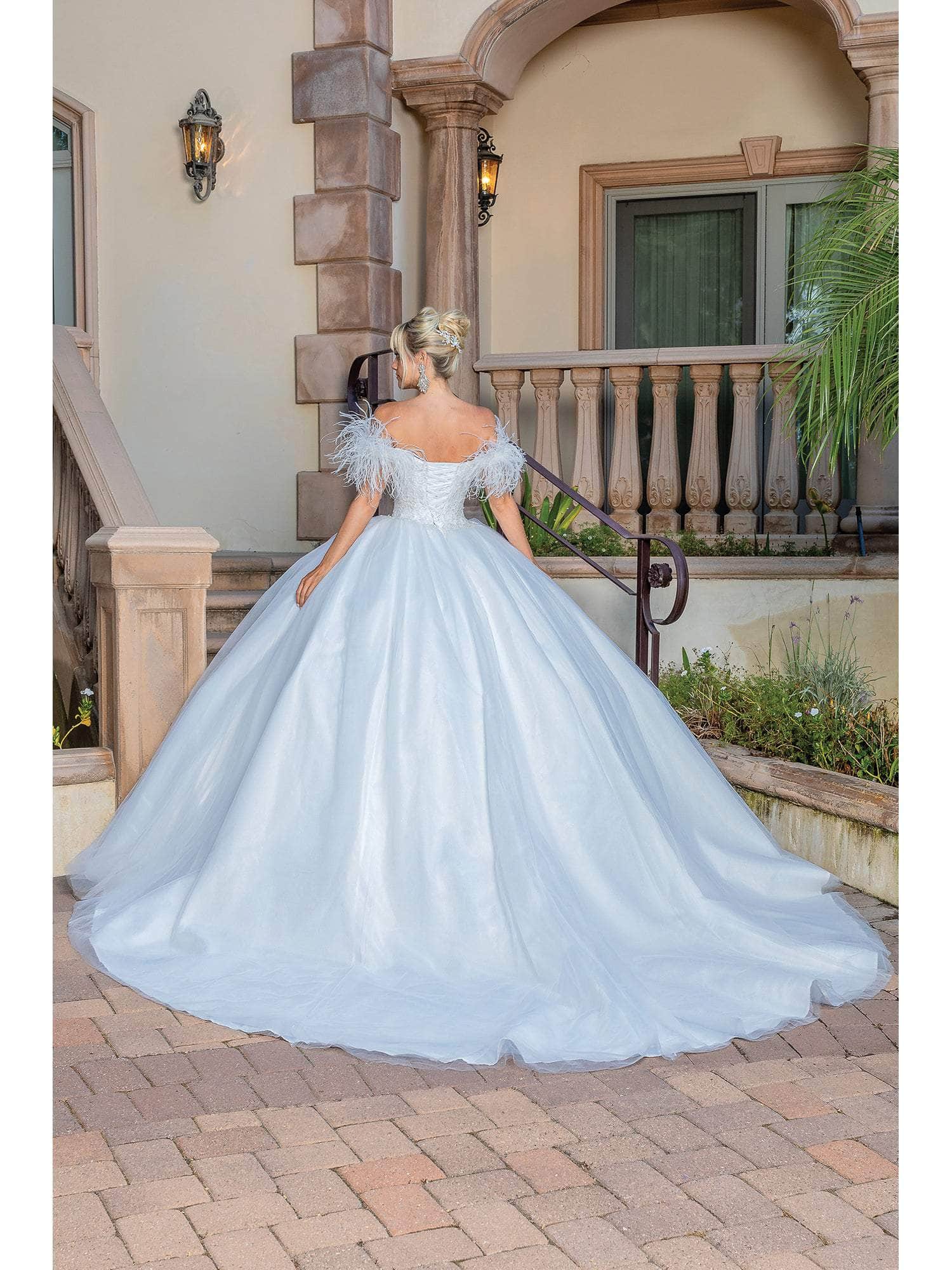 | Details: | Feather Details, Embroidered, Fitted Bodice, Lace-Up Back, Train |