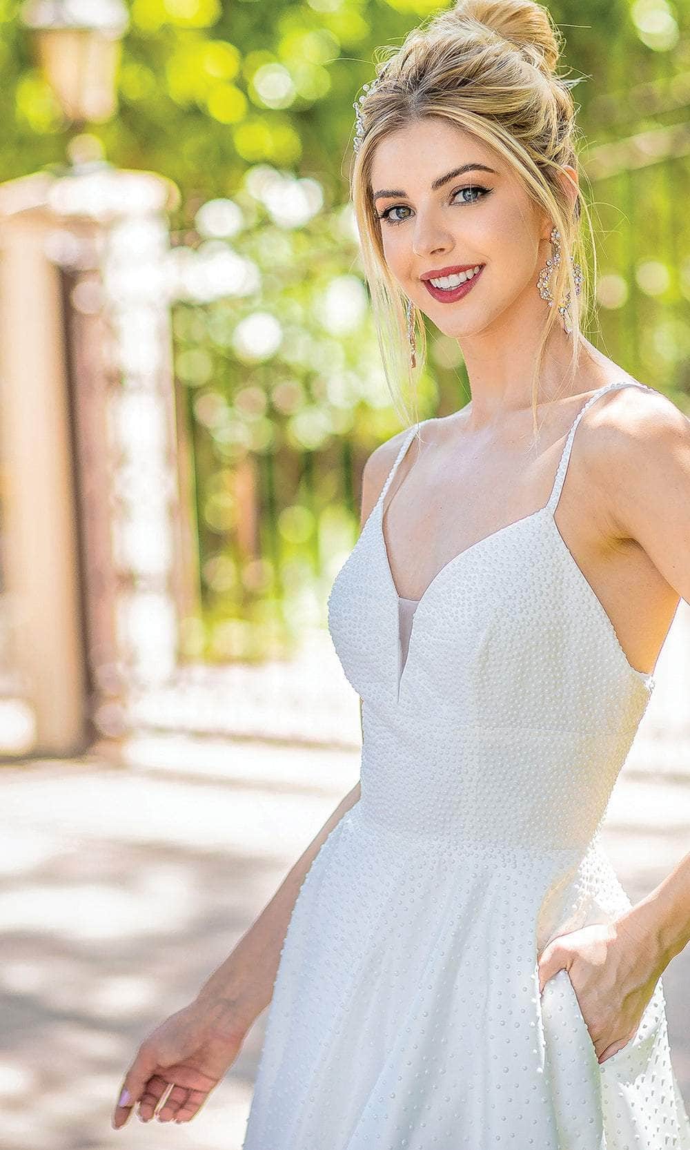 Be the epitome of sophistication and passion with the chic Dancing Queen 0244 bridal dress, a stunning ensemble tailored to elevate your special day with grace and style. The A-line silhouette boasts a textured bodice adorned with delicate spaghetti straps, exuding understated elegance. Accentuated with convenient side pockets, this dress combines fashion and functionality seamlessly. Finish your look with a graceful train, ensuring you make an unforgettable entrance. Embrace timeless charm with Dancing Queen 0244, epitomizing bridal elegance with finesse. Model is wearing Off-White color.