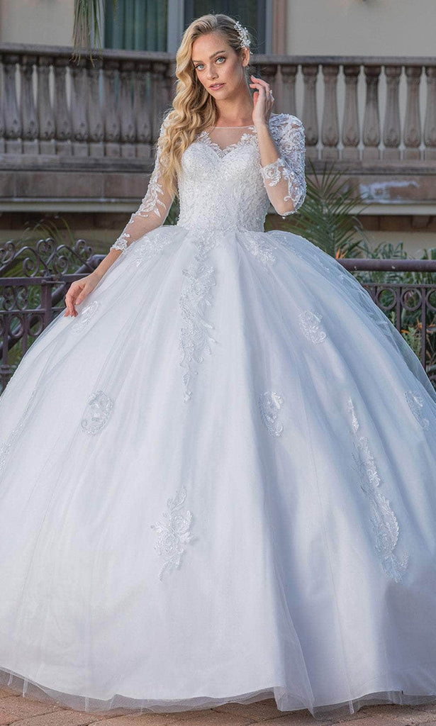Experience the outstanding effect of the enchanting Dancing Queen 0264 bridal gown, designed to make your special day unforgettable. This romantic gown features sparkling embellishments and intricate embroideries on a fitted bodice with an illusion bateau neckline, framed by sheer long sleeves. The lace-up tie at the back ensures a perfect fit. The floor-length skirt flows beautifully in a ballgown silhouette, finishing with a graceful train. Shine with unparalleled beauty and grace in the Dancing Queen 0264. Model is wearing Off-White color.
