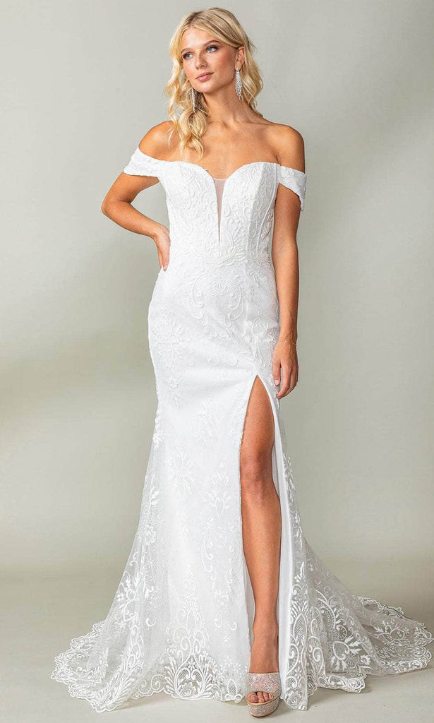 The mesmerizing Dancing Queen 0273 bridal gown, is a testament to elegance and grace. Adorned with embroideries, the off-the-shoulder fitted bodice features a captivating plunging V-neckline complemented by a sheer insert. A natural waistline accentuates your silhouette, while the back has a lace-up tie for a perfect fit, and adds a touch of allure. Glide gracefully in the floor-length sheath silhouette, ensuring an unforgettable entrance. Illuminate your special day with Dancing Queen 0273. Model is wearing Off-White color.