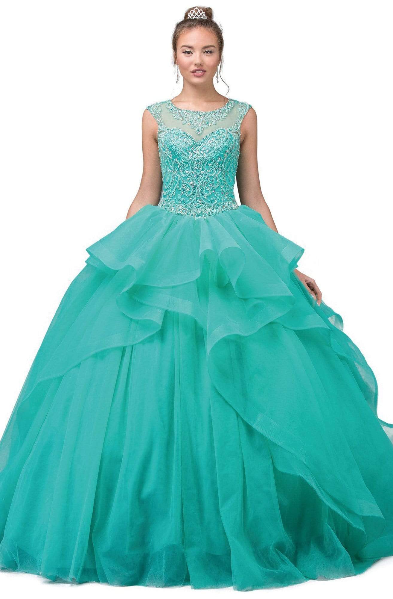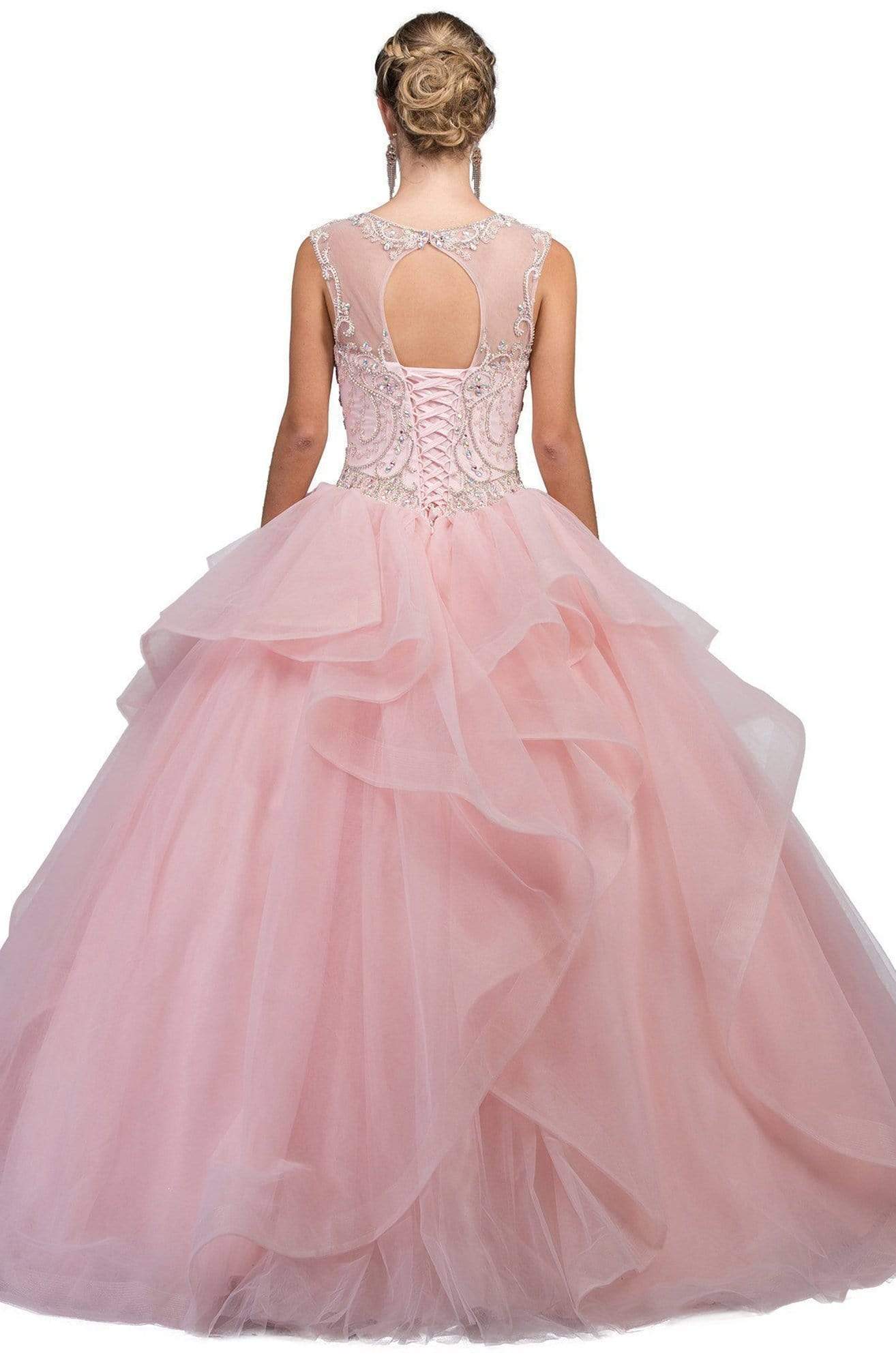 Look impossibly feminine in this exceptionally made Dancing Queen 1198 creation. Intricately embellished with jewels along with its sheer embroidered bodice, this gown reveals an illusion scoop neckline with dainty cap sleeves. A sweetheart lining complements the illusion keyhole cutout on its corset back. Shimmering details ornate the basque waist as tiers of gossamer layers drape its ballgown silhouette. Make everyone swoon in this Dancing Queen masterpiece.