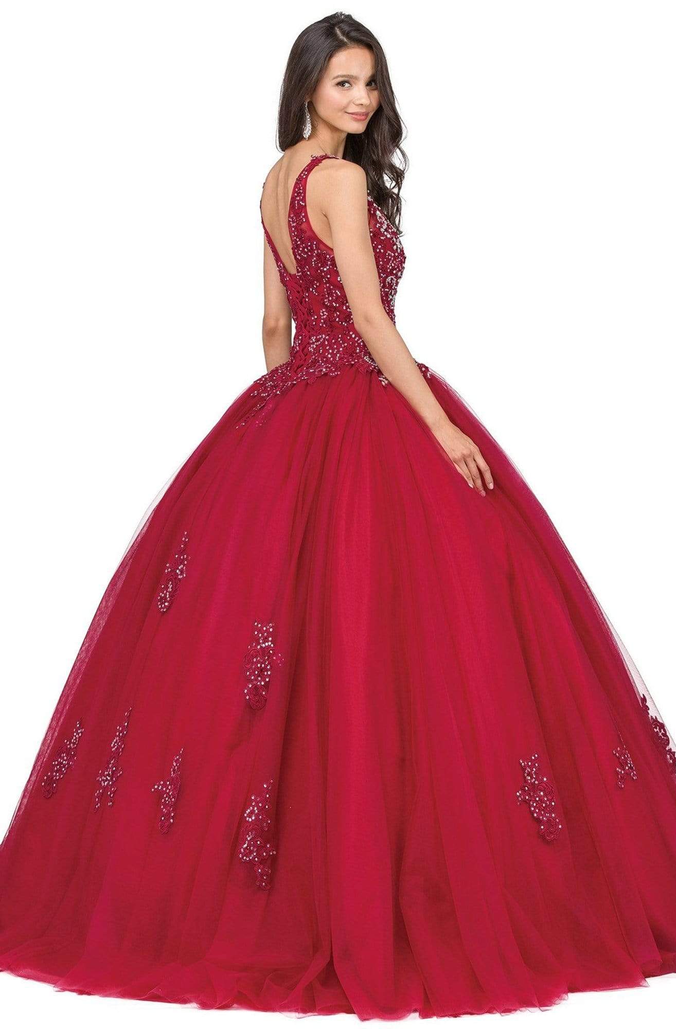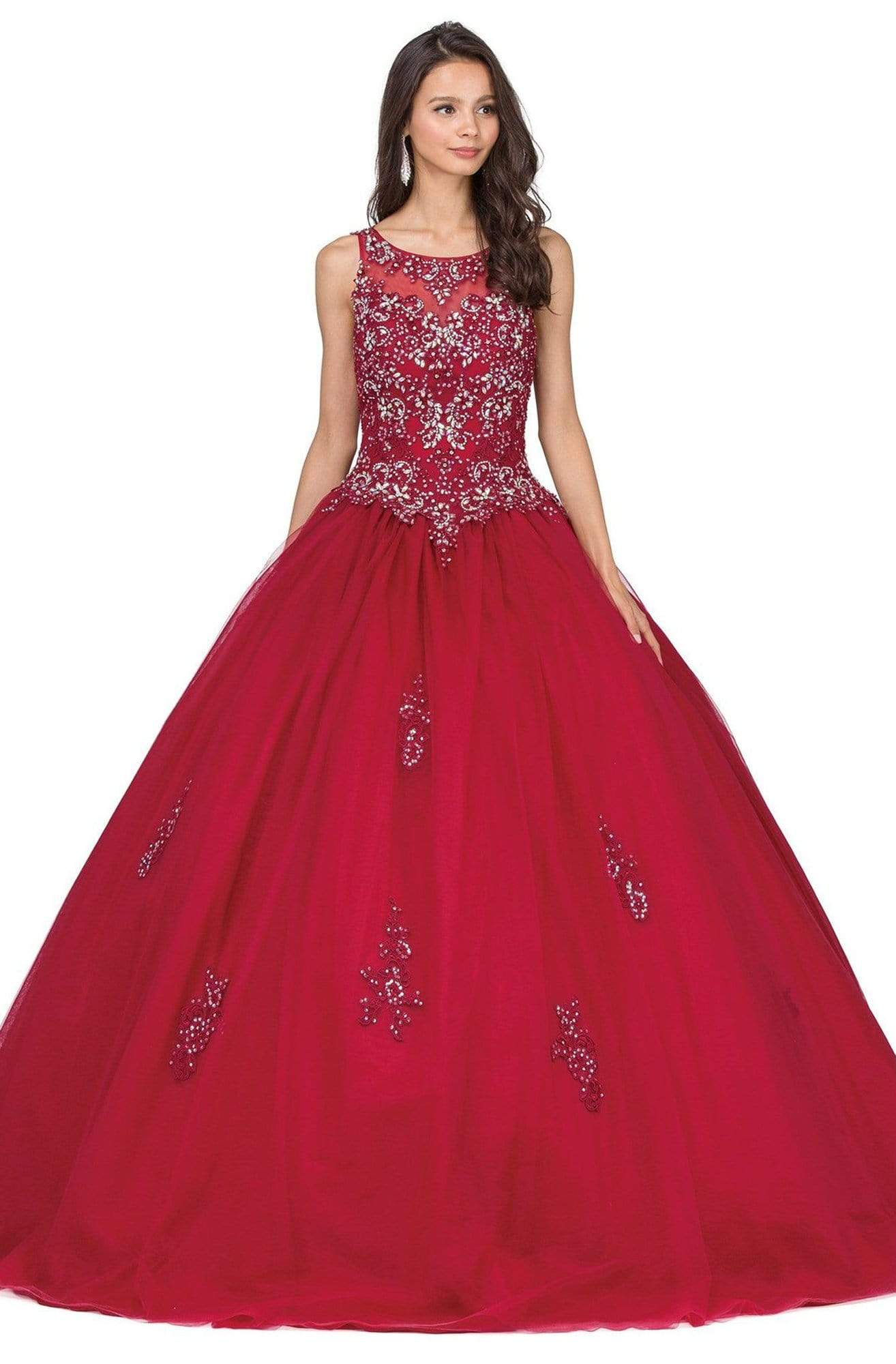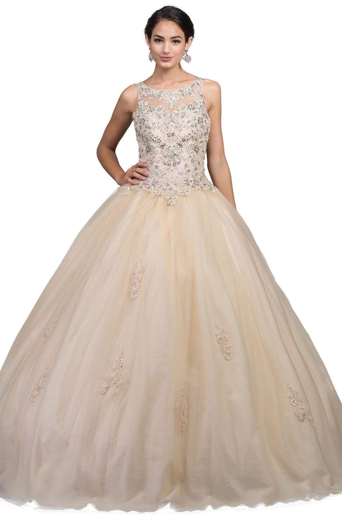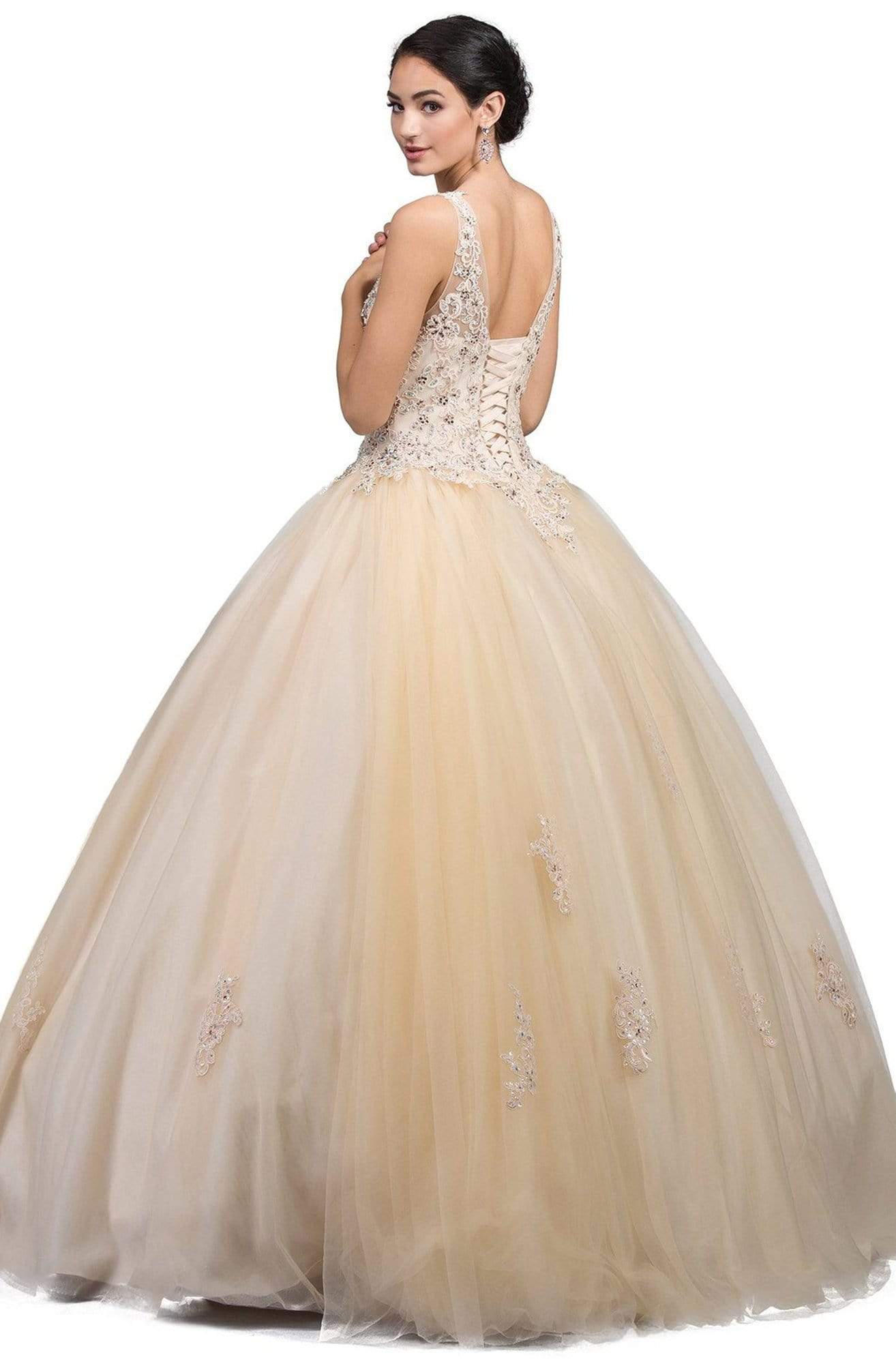 Appear like a modern princess with the exquisite beadwork of Dancing Queen 1228 Quinceanera Gown. The gown brandishes in sleeveless bateau neckline with sheer yoke, features with beaded lace bodice and corset style lace-up back. The skirt runs in full length hem and flares a ballgown silhouette. This Dancing Queen Quinceanera gown is an absolute breathtaking look waiting to be revealed on your special day.