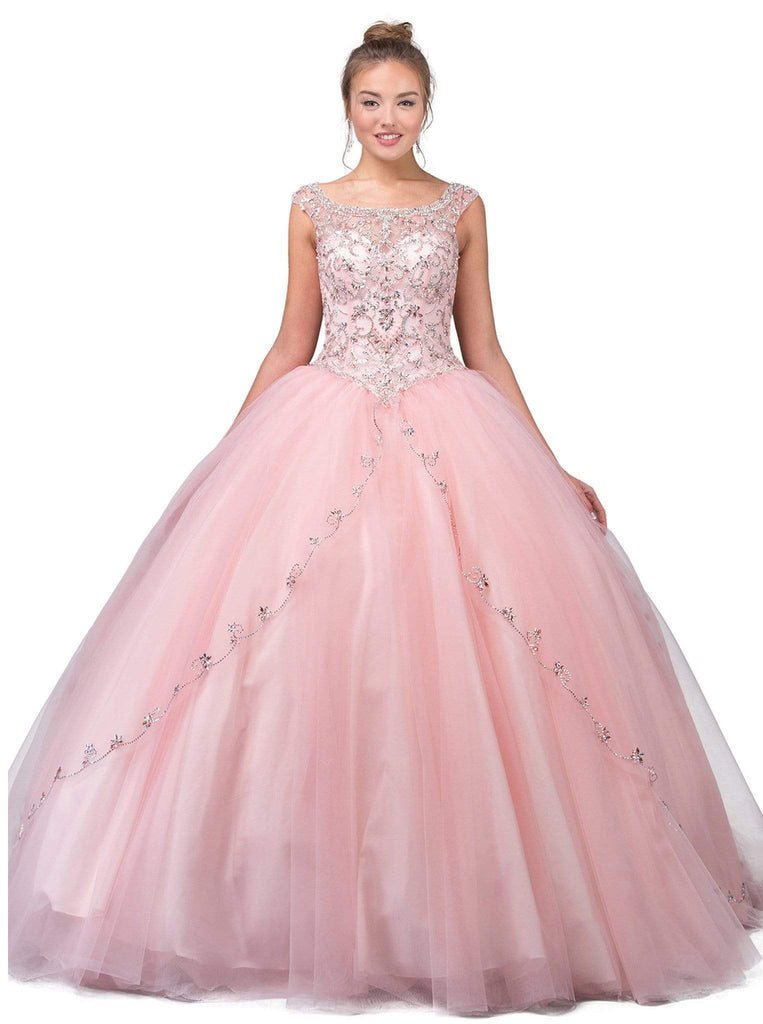 Draw out the princess in you with this amazing evening gown. The fitted bodice boasts a bateau neckline with cap sleeves. Shimmering embellishment highlights the bodice and back. Full ball skirt is made of tulle fabric with matching beads sashed from the waist down the full length hemline. Captivate everyone in this exquisite creation.