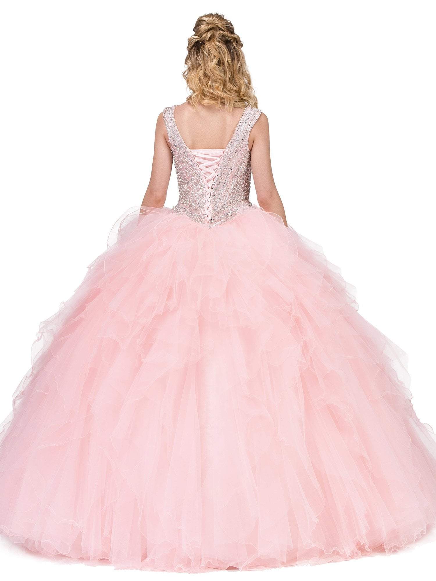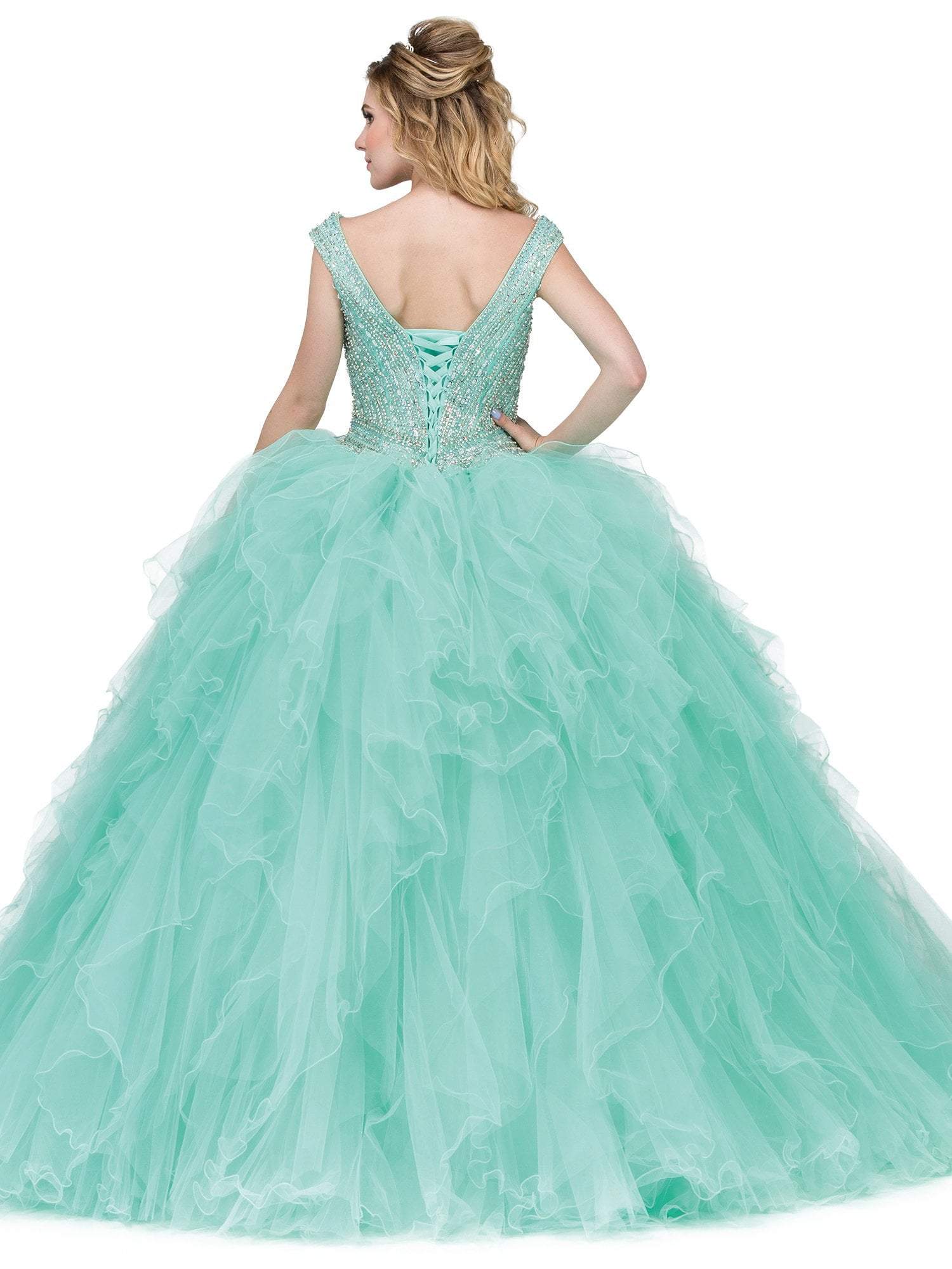 Make your presence known as all eyes navigate towards you in this enthralling Dancing Queen 1273 creation. Dazzling with crystals revealing a converging diagonal pattern, this exquisite piece flaunts a modified sweetheart neckline accented with cap sleeves. Fabricated with a modified square-cut back cinched with a lace-up corset detail, the layered ballgown skirt lushly cascades in ethereal tiers as it creates a mesmerizing full length hem. Have yourself crowned as the belle of the ball in this fascinatingly ornate Dancing Queen masterpiece. Model is wearing the Blush, Champagne and Mint colors.