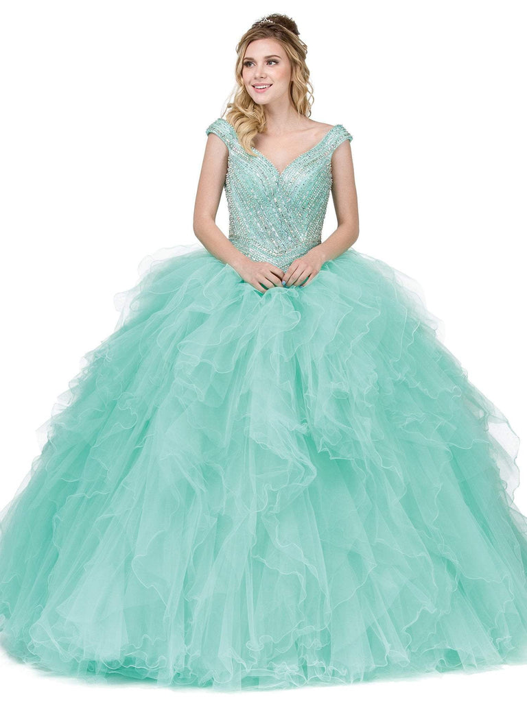 Make your presence known as all eyes navigate towards you in this enthralling Dancing Queen 1273 creation. Dazzling with crystals revealing a converging diagonal pattern, this exquisite piece flaunts a modified sweetheart neckline accented with cap sleeves. Fabricated with a modified square-cut back cinched with a lace-up corset detail, the layered ballgown skirt lushly cascades in ethereal tiers as it creates a mesmerizing full length hem. Have yourself crowned as the belle of the ball in this fascinatingly ornate Dancing Queen masterpiece. Model is wearing the Blush, Champagne and Mint colors.