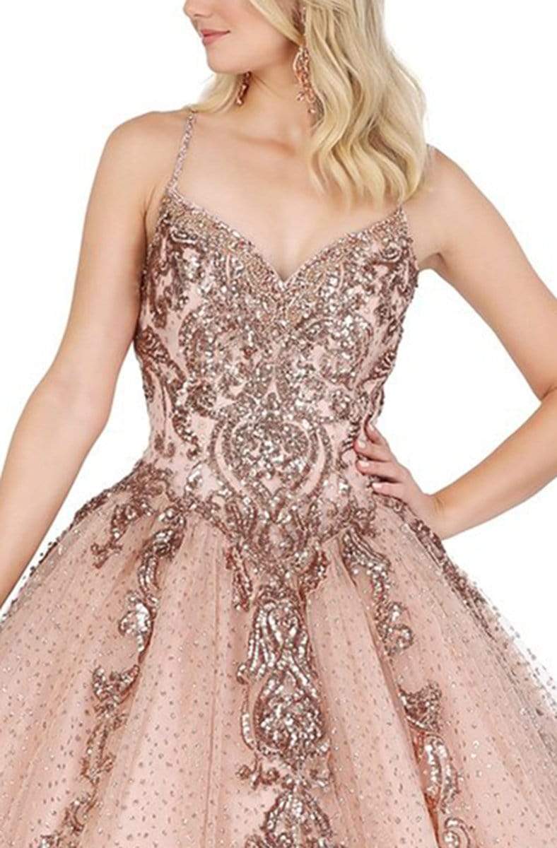 You will be an enchanting beauty in this glamorous Dancing Queen 1437 masterpiece. Striking glitter embellishments beautify the fitted bodice and trail down the ballgown skirt. A classic V neckline crowns the fitted bodice supported with spaghetti straps which lead to the sheer cutout back, secured with lace up closure. Look immaculately gorgeous in this Dancing Queen creation.