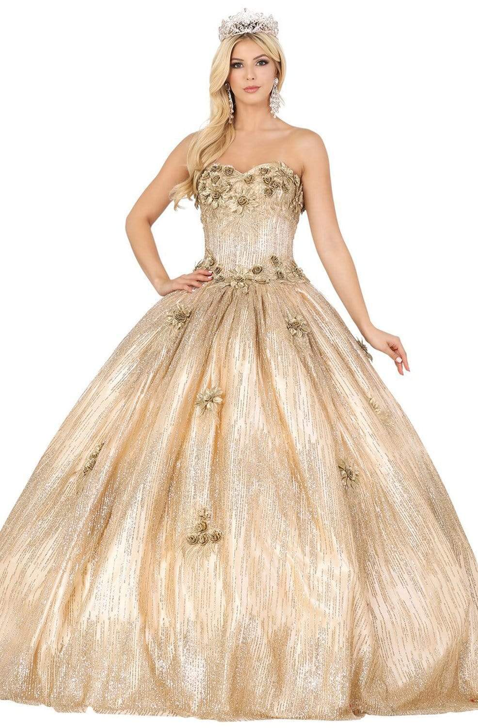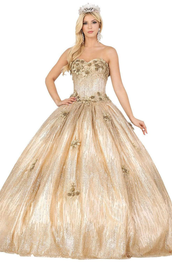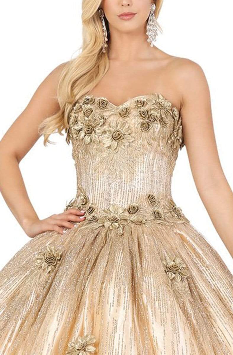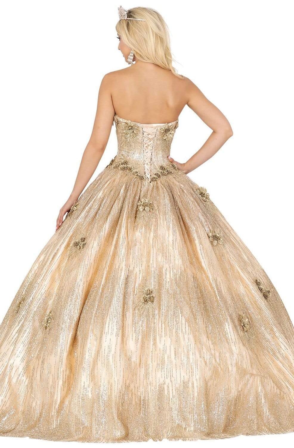Brave the evening with temptress beauty and grace wearing this design from Dancing Queen 1533. This gown delights in a strapless, sweetheart neckline with a fitted bodice and a lace up back. The gown is adorned with floral appliques and scattered throughout the ballgown skirt. Flatter your shape with a sculpted style from Dancing Queen.