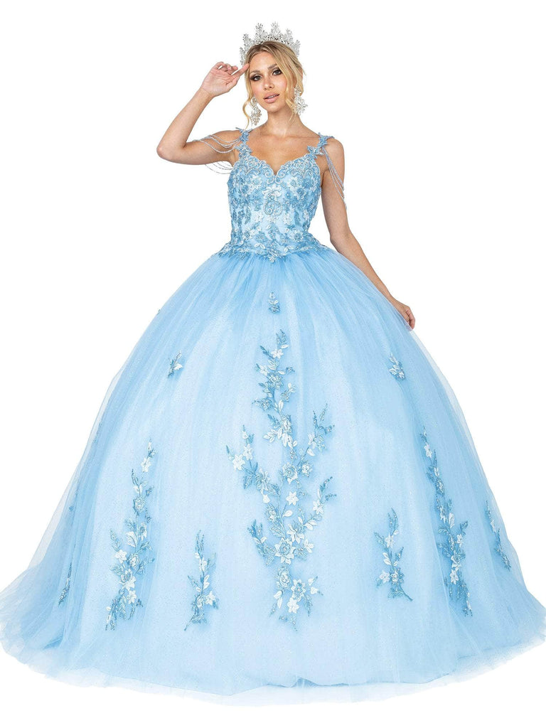 Walk into a ballroom and be the center of everyone’s attention in this Dancing Queen 1546 creation. Exquisitely appliqued with beaded lace design, this gown is flourishing a v-neckline with ornamented shoulder straps. Draping beaded garlands accent the arms. A corset design cinches the back. The voluminous ballgown skirt cascade into a floral appliqued silhouette and train. Reap compliments like clockwork in this Dancing Queen masterpiece.  Dress is pictured in Bahama Blue, and Lilac variants. Find more ball gowns.