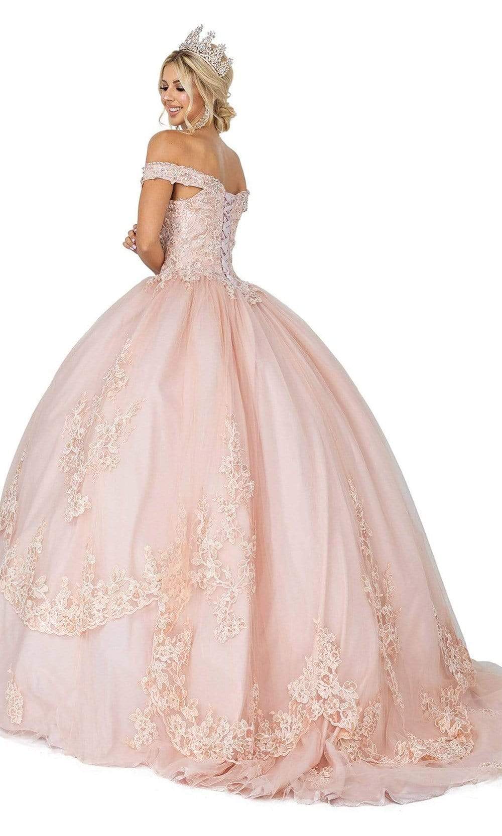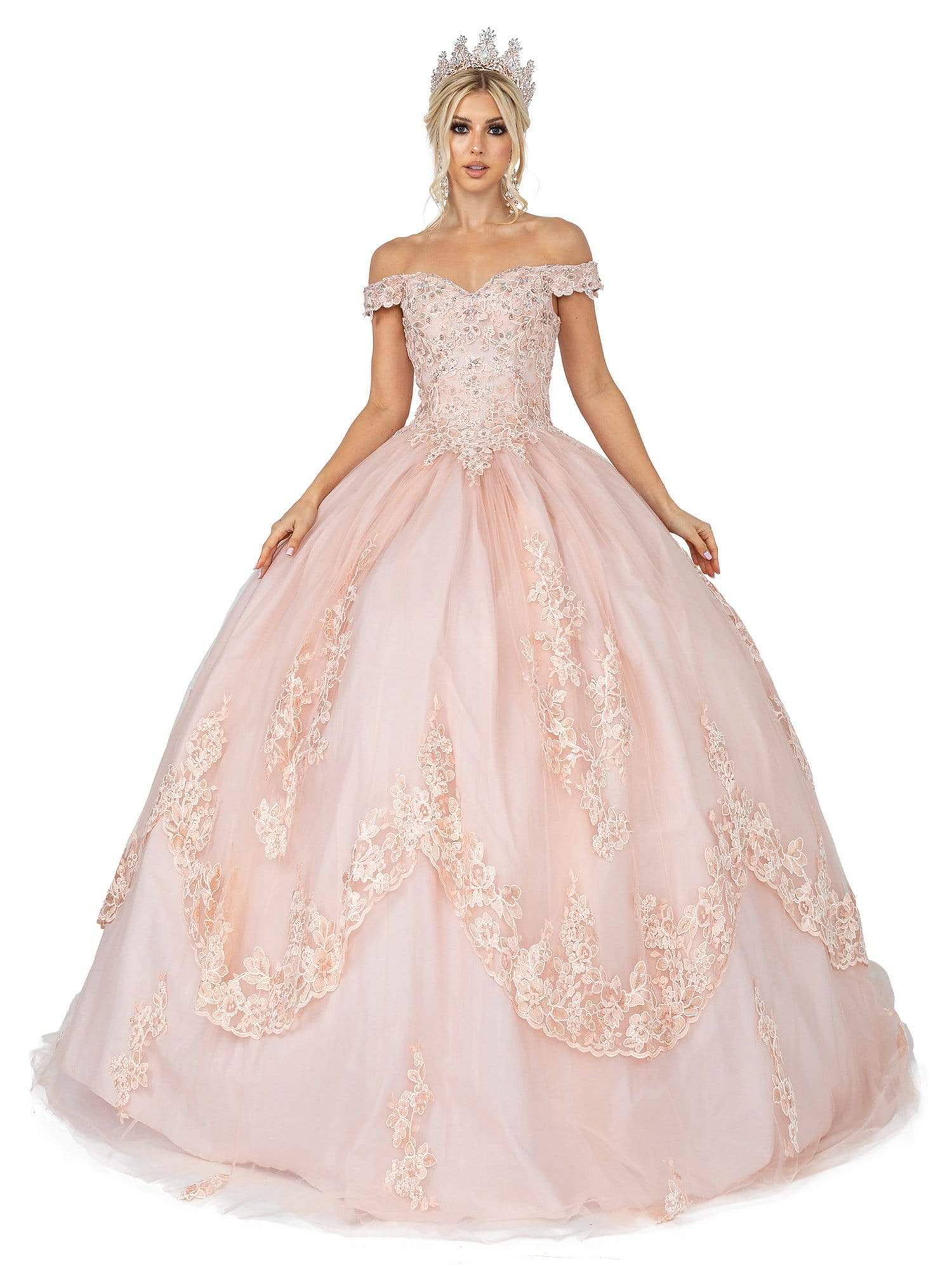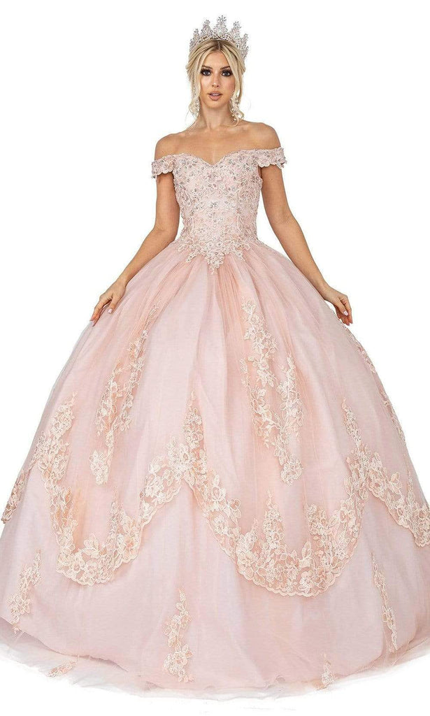 Shimmer with utter beauty all night long in this Dancing Queen 1575 creation. Embellished with rhinestones and floral embroidered details, this gown charms with an off shoulder neckline and a corset detail. Scalloped tiers forms a ballgown silhouette and a grandiose train. Leave them enchanted by the sheer iridescence of this Dancing Queen masterpiece.