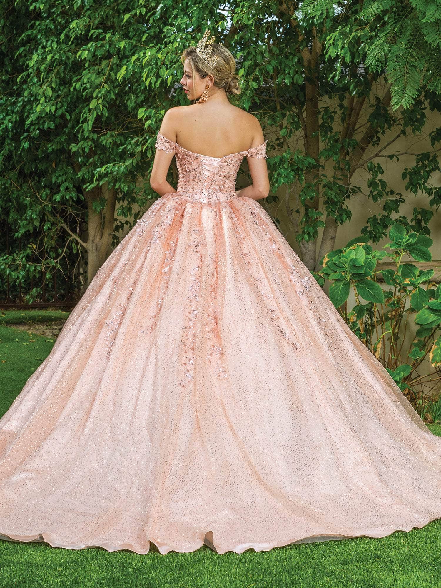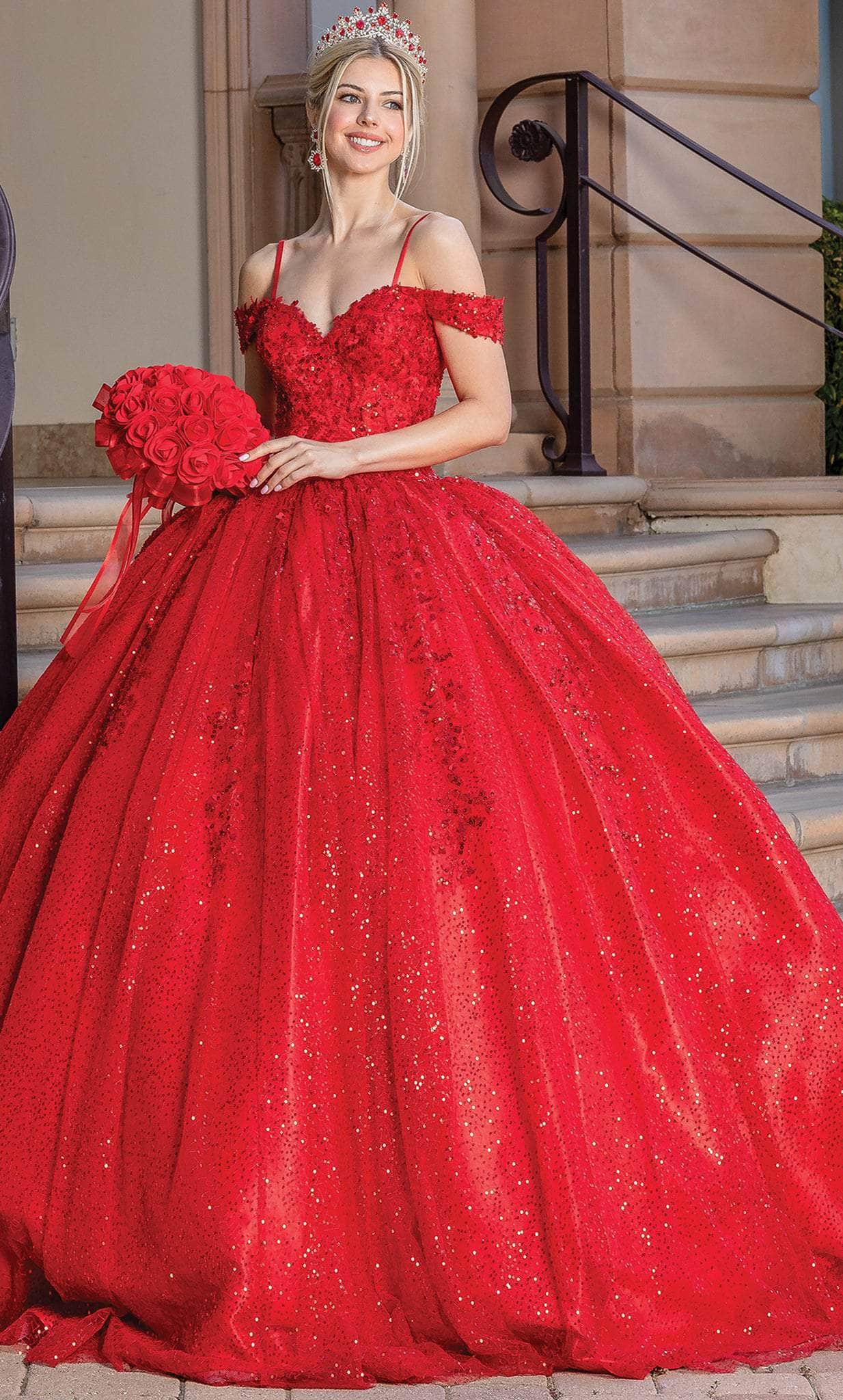 Have all eyes on you when you show up in this tantalizing Dancing Queen 1595 creation at your Quinceanera event. Flourishing a glitter crust shimmering on a tailored bodice, this stunner parades an off shoulder neckline with rhyming corset styled back. Beautifully ornamented with shimmering appliques and sumptuously layered, the ethereal skirt forms a ballgown silhouette with a sweeping denouement. Be the embodiment of perfection in this gorgeously styled Dancing Queen masterpiece. Models are wearing the Red and Rose Gold colors.