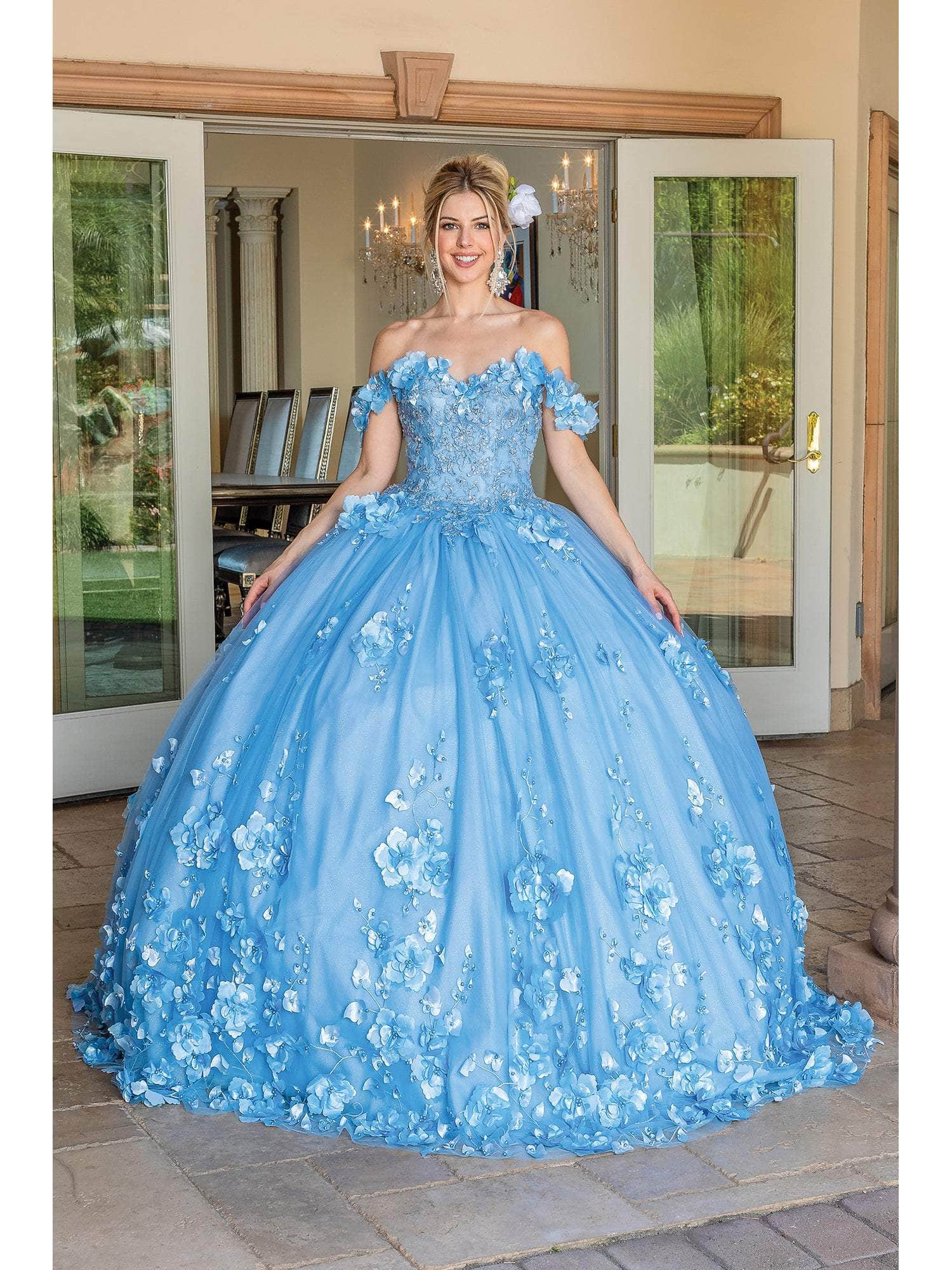 Glide into the room and glow in this exquisite Dancing Queen 1613 creation. Embellished with floral lace bodice and beadwork, the off shoulder gown is accented with floral details. Framed with a corset back, the gossamer skirt cascades into a floral appliqued design and train. Express pure opulence in this Dancing Queen masterpiece. Find more ball gowns.