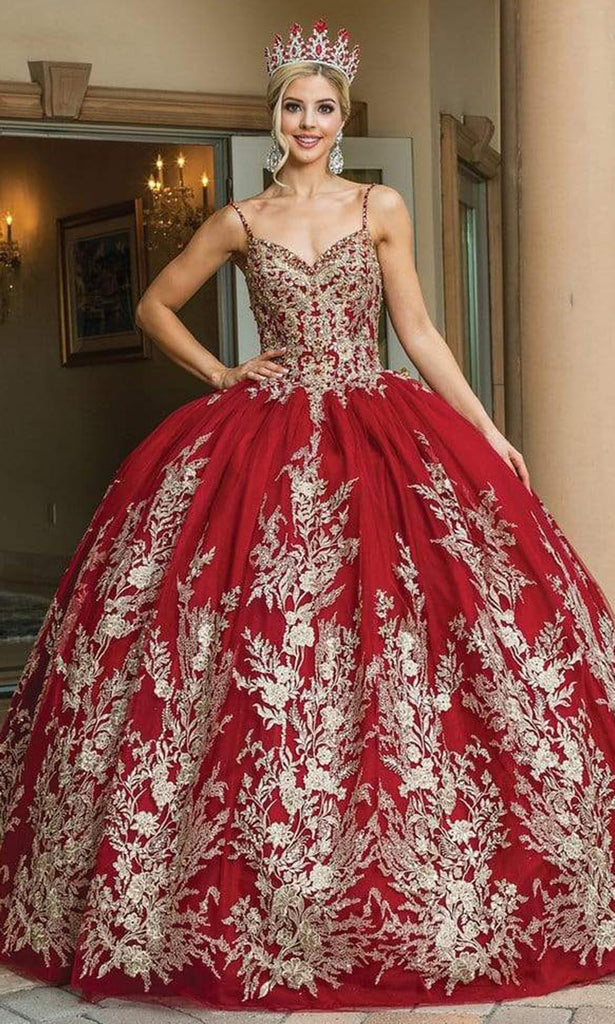 This enchanting Dancing Queen 1616 is sure to make you the center of everyones attention. Be confident as you face the crowd in this extravagant long ballgown. Embellished throughout, it gives you a royalty feeling effect with its striking details while uses sweetheart neckline and V cut back with lace-up tie for closure. Proceeds with a sweep train. Experience the outstanding effect in this dress by Dancing Queen. Find more Quinceanera Dresses.