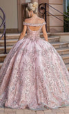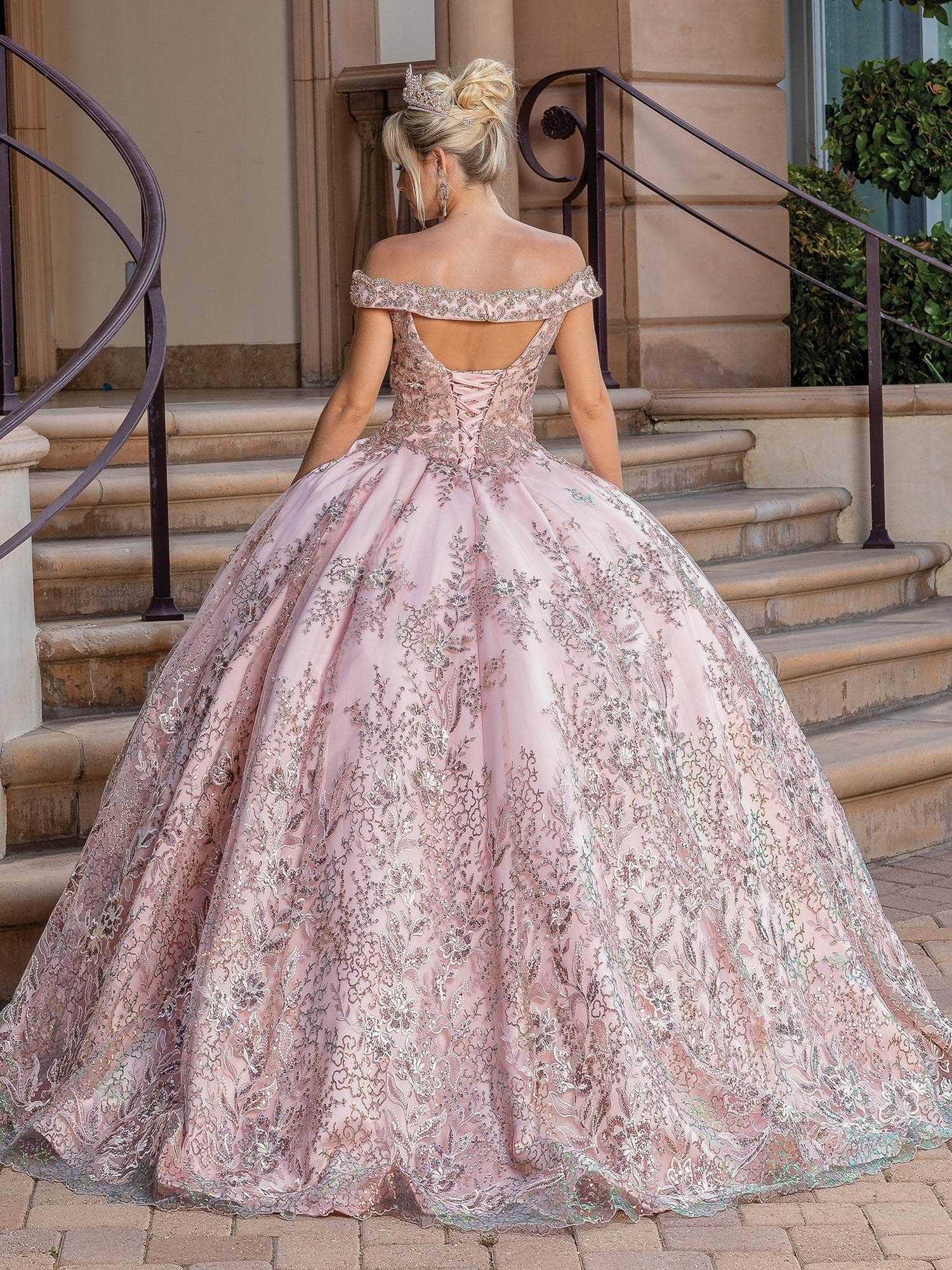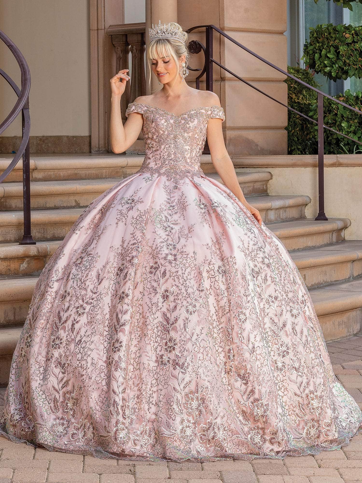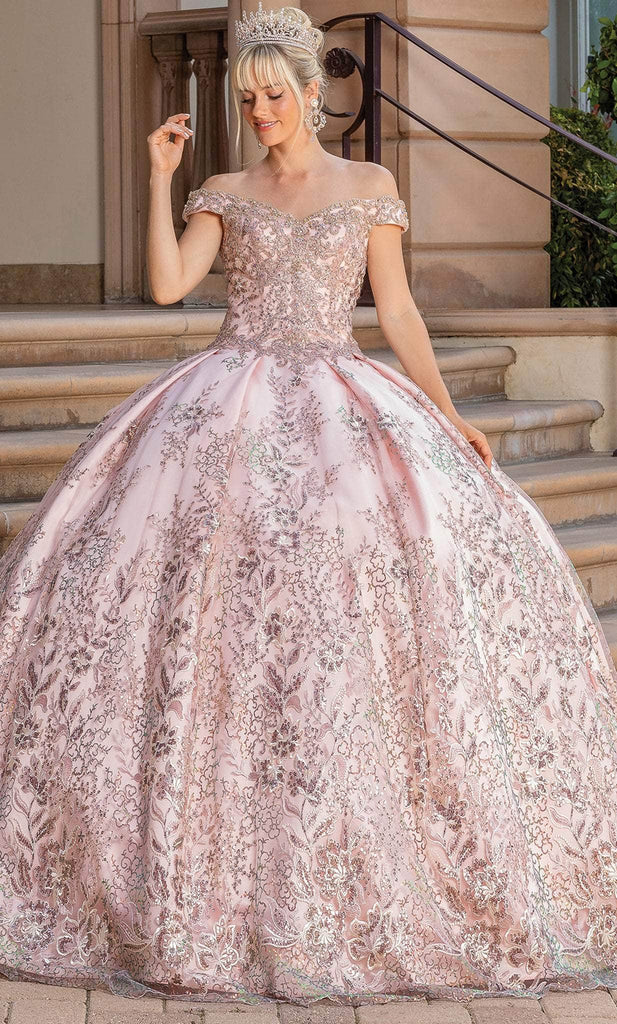 Bloom with loveliness in this detailed creation from Dancing Queen 1666. Show-stopping sequin, beadwork, and lace applique are adorned entirely throughout the silhouette. The gown has an off-shoulder sweetheart neckline, cap sleeves, and an enticing cutout back with a corset lace-up tie design. Highlighted with box pleated, the ballgown skirt flows from the natural waist to the full length hem and scalloped sweep train. Shine with the glow of ever after in this mesmerizingly Dancing Queen 1666 gown. Model is wearing the Rose Gold color.