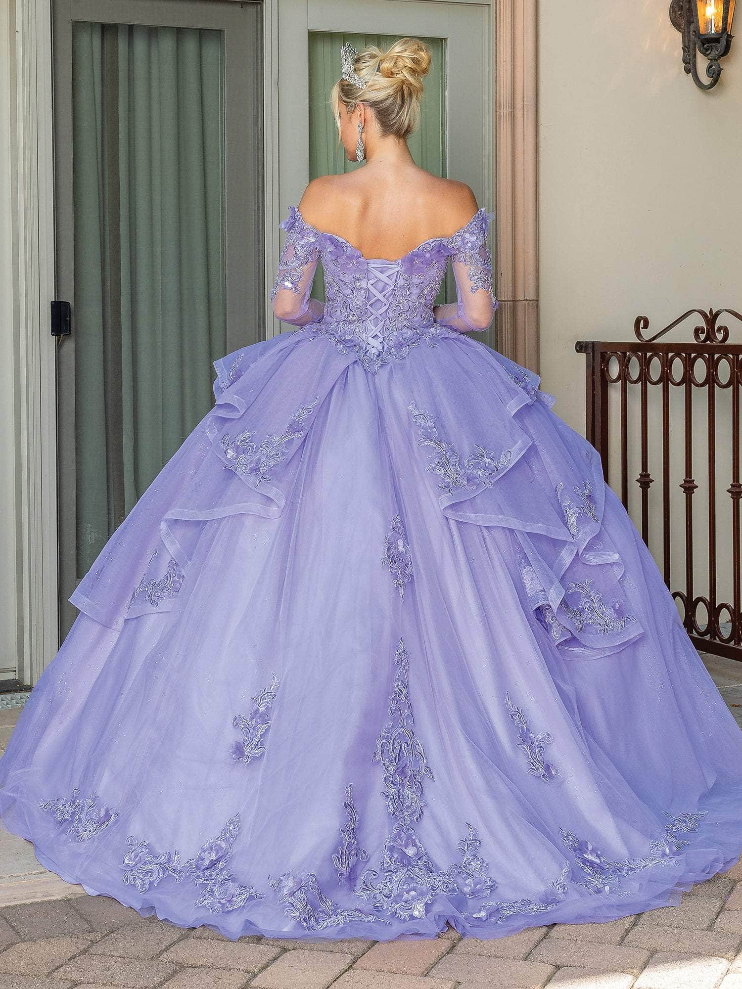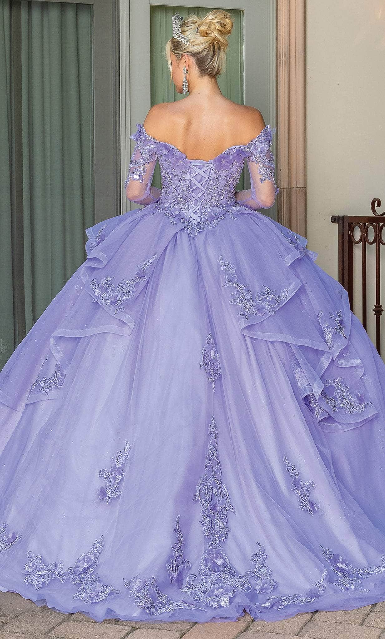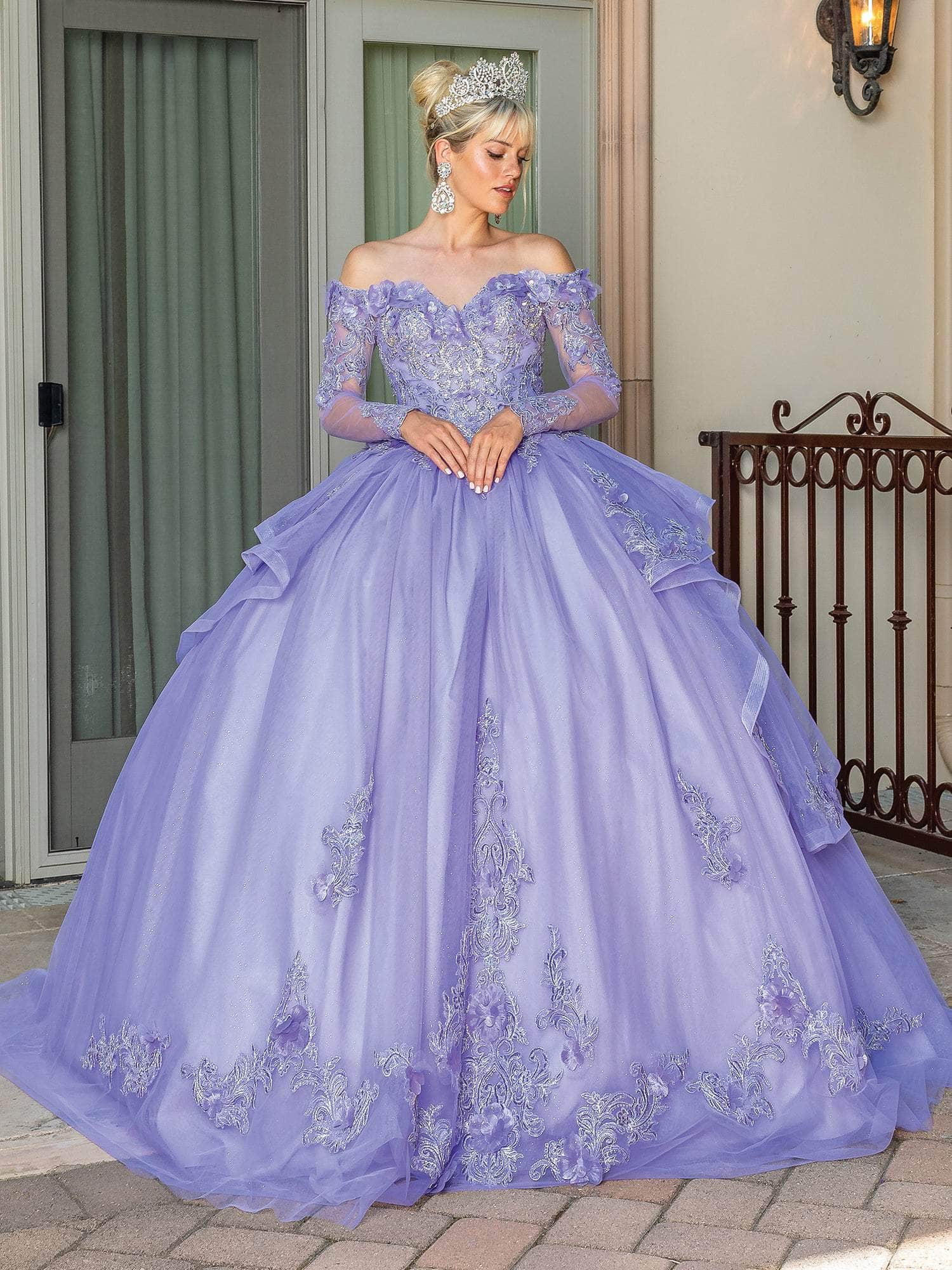 Embrace a sophistication like any other in this exceptionally made Dancing Queen 1667 creation. Stunningly festooned with lace embellishments and rhinestone ornaments, this mesmerizing piece features an off shoulder neckline with blossom ornaments. Styled with sheer long sleeves and graced with a corset back, the ruffled tiers cascade into a ballgown silhouette with a sweeping denouement. Bestow a touch of vibrant interest into a room when you walk in in this Dancing Queen masterpiece. Models are wearing the Bahama Blue, Lilac and Rose Gold colors.