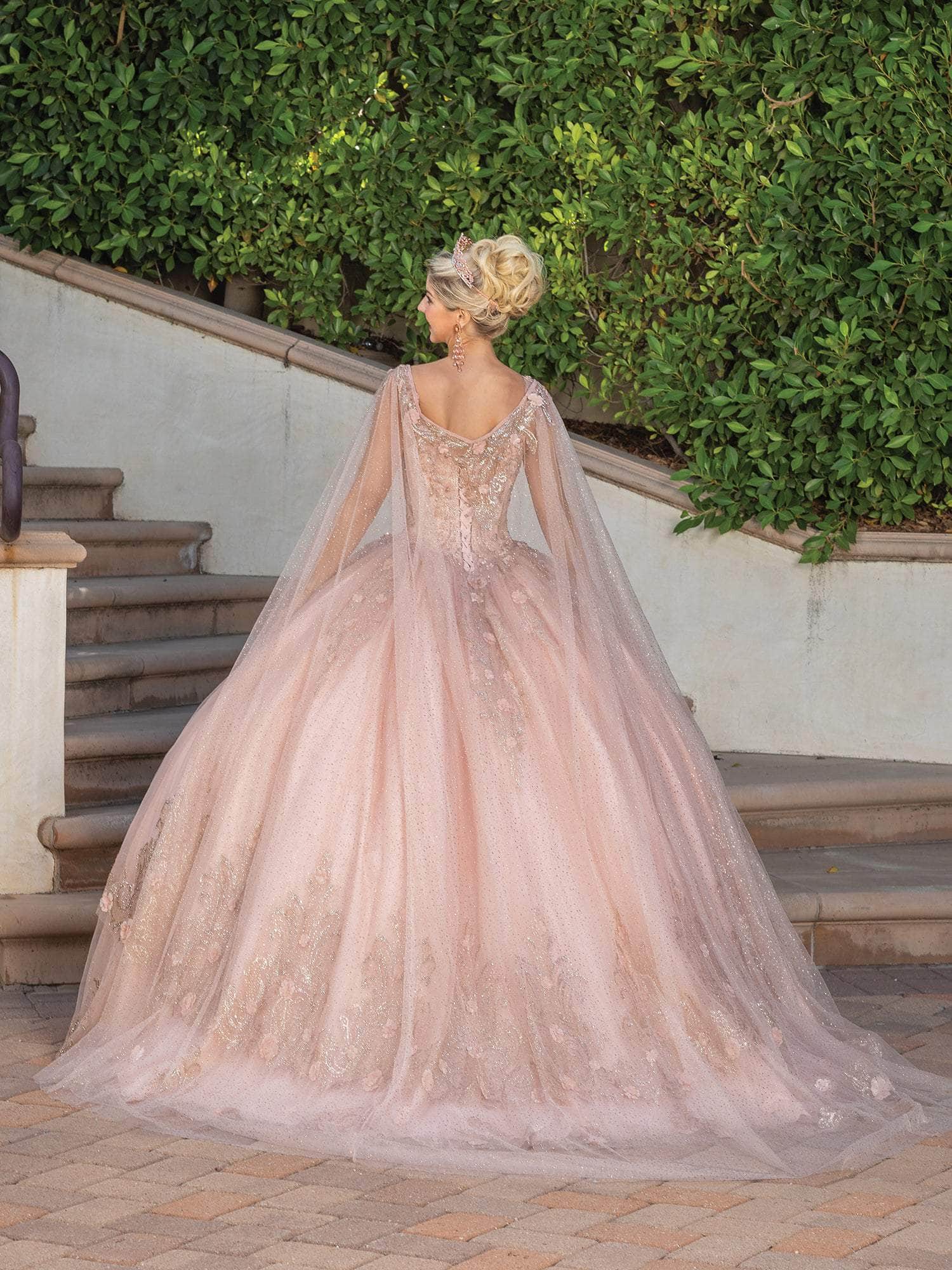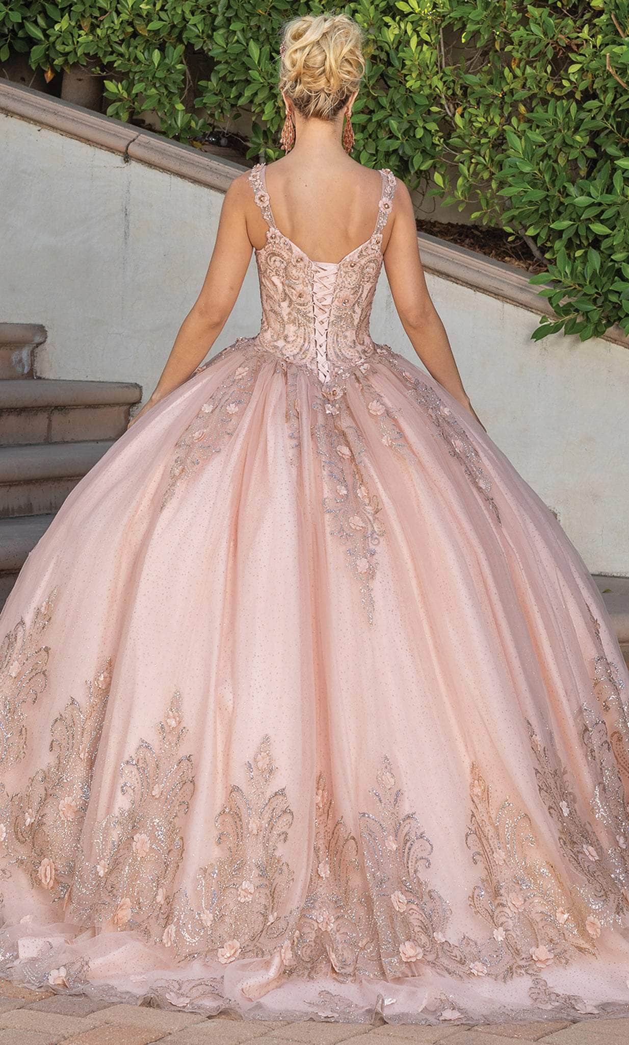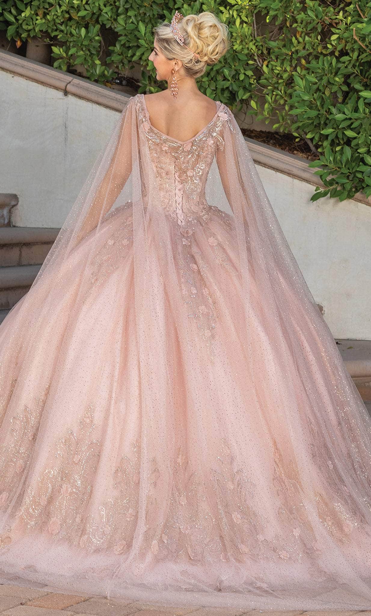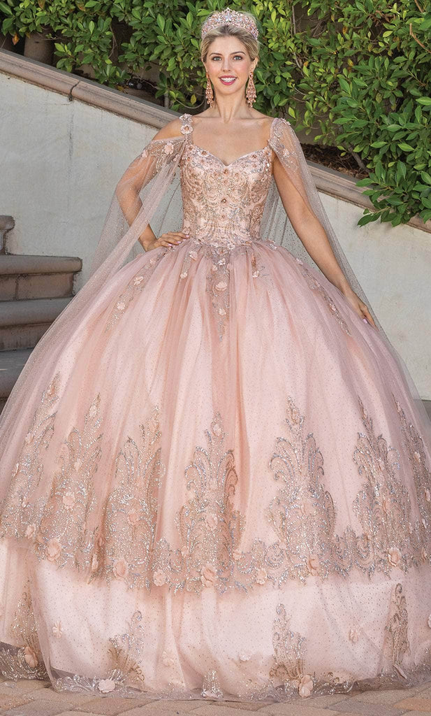 Embrace that inner style star in you when you don this exquisite Dancing Queen 1676 creation at your Quinceanera event. Festooned with glistening glitter print embellishments and accented with 3D blossoms, this gown parades a v-neckline with adorned straps. Charmed with a corset styled back and glistening with ornaments, the voluminous skirt reveals a ballgown silhouette with a sweeping denouement. A sheer cape with glittering florals drapes the shoulders. Unveil the free spirit in you when you look so beautiful in this Dancing Queen masterpiece. Model is wearing the Rose Gold color.
