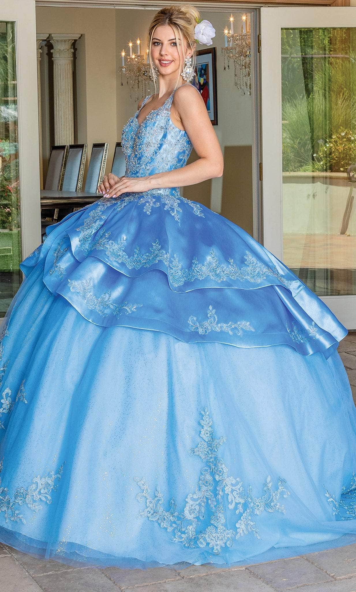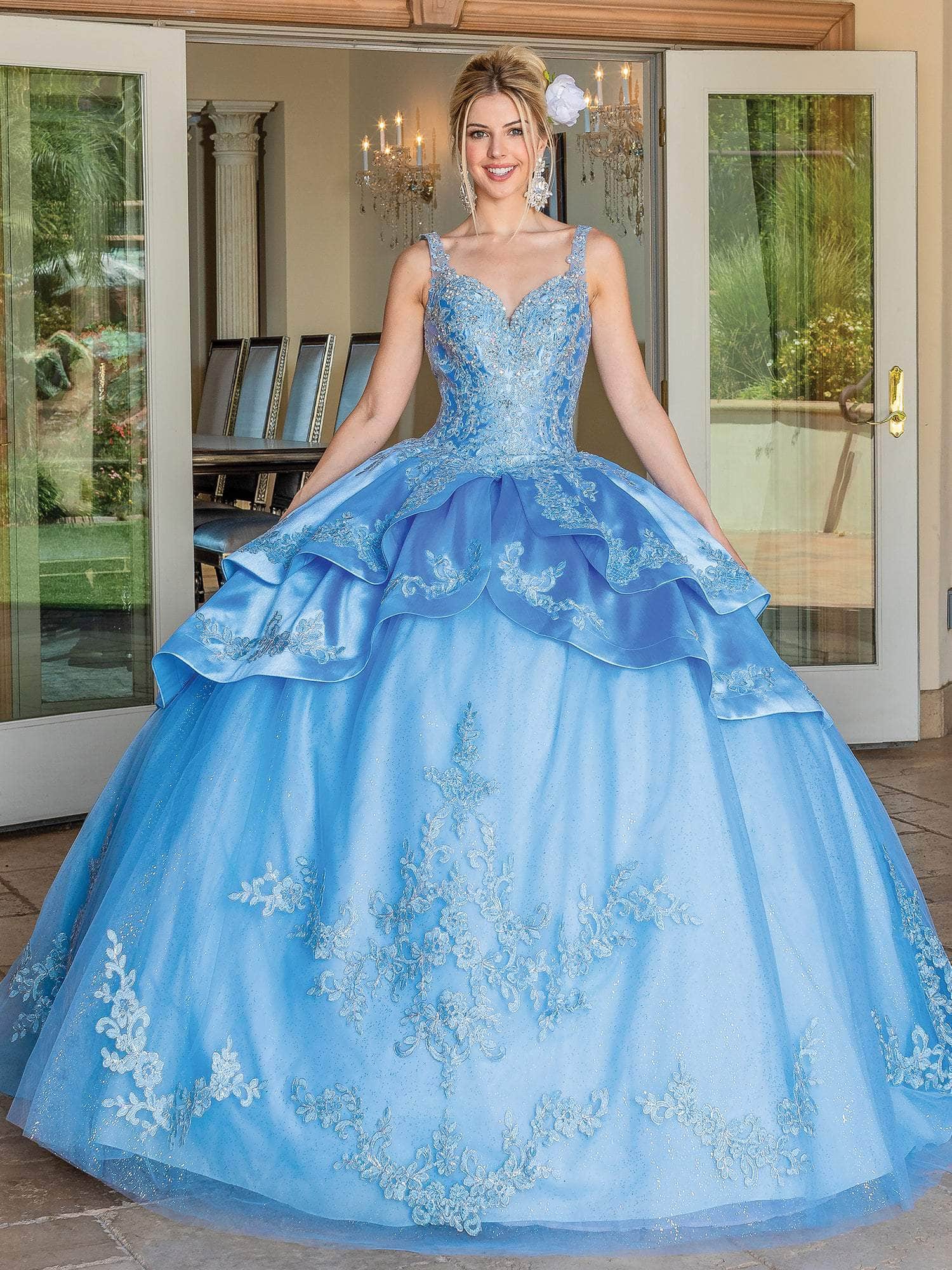 Put a sparkle on everyone’s eyes when you show up at your Quinceanera in this Dancing Queen 1682 creation. Beautifully textured with foliage motif lace appliques and faceted stones, this inspired piece flatters with a sweetheart neckline and embellished shoulder straps. Riddled with sumptuous embellishments and styled with a low scoop back and corset, lavishly layered peplum accent wraps the waist. The beautifully styled skirt is accented with embroidered details as it touches the floor with a sweeping denouement. Embrace that inner style star in you when you don this exquisite Dancing Queen masterpiece. Models are wearing the Bahama Blue and Rose Gold colors.