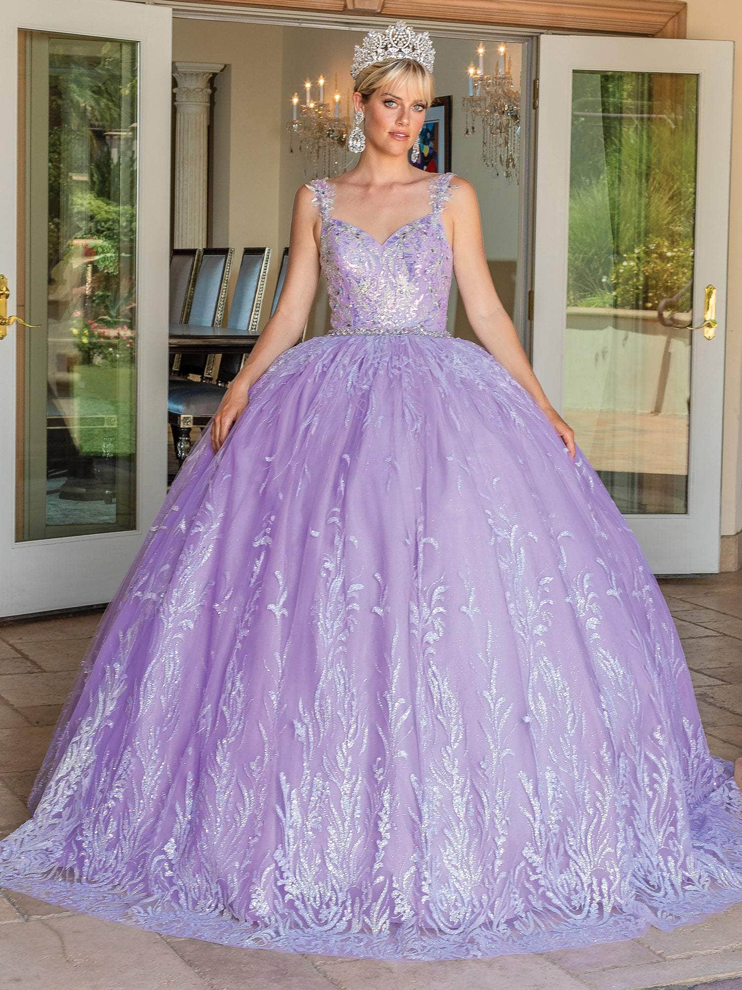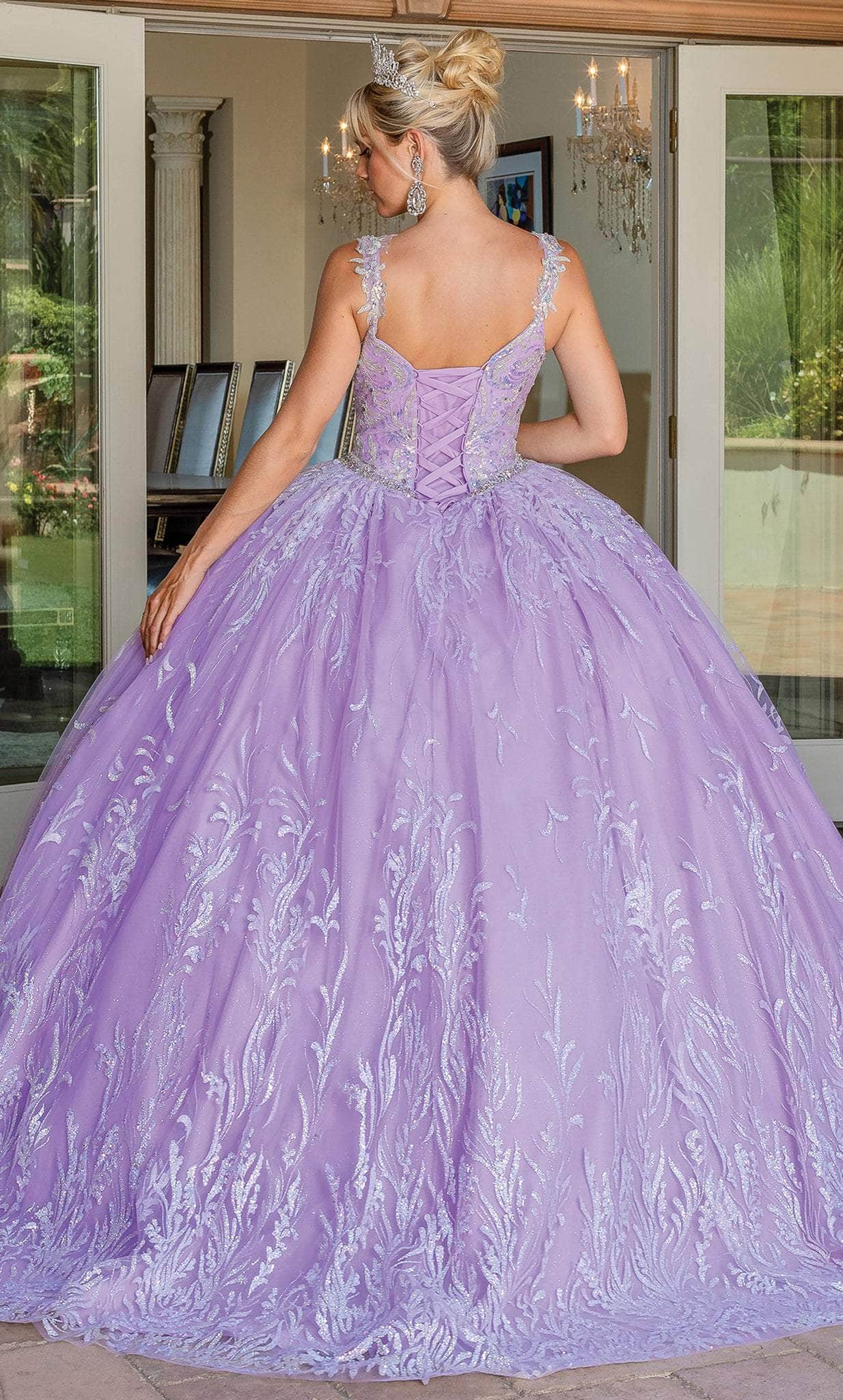 Embrace a style that is immaculately divine as you glam up in this Dancing Queen 1685 creation for your Quinceanera event. Beautifully embellished with shimmering sequin details on the sculpted bodice, this gown parades a sweetheart neckline with lace applique straps. Encircled with an embellished waist and defined with a corset styled scoop back, the ornate skirt reveals trailing ornaments as it forms a ballgown design with a sweeping denouement. Reveal a daring sense of style in this inspired Dancing Queen masterpiece. Model is wearing the Lilac color.