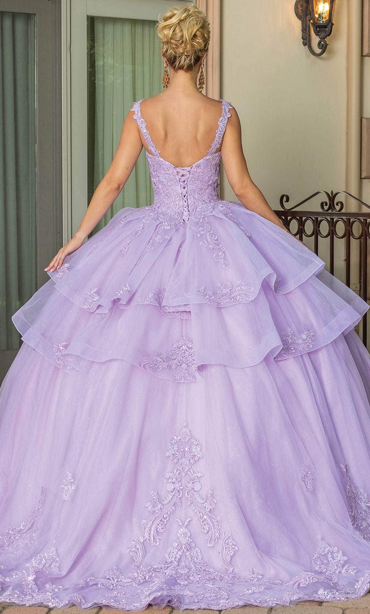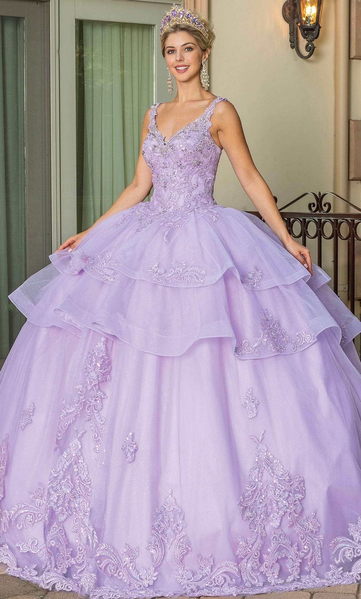 Walk into the ballroom in a grandiose sophistication in this Dancing Queen 1686 masterpiece. This lovely gown is embellished with sparkling beads and embroidery that will have everyone looking at you. It consists of a sleeveless bodice topped by a deep v-neckline, wide shoulder straps and a corset lace-up back. This style is completed in a full length ballgown silhouette with tiered details, a horsehair hem and a sweeping train. Another great creation by Dancing Queen 1686. Model is wearing the Lilac color.