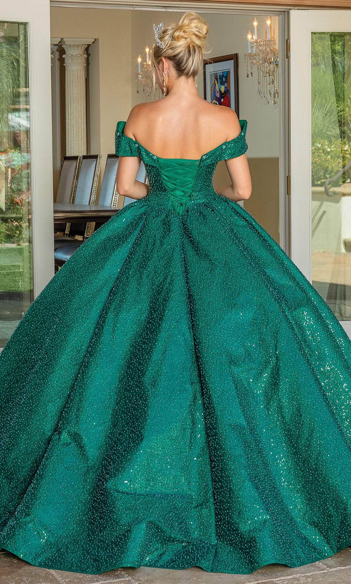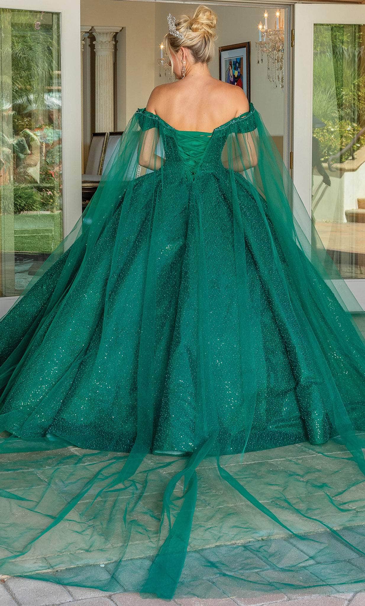 Glide with an ethereal style that is amazingly glamorous in this Dancing Queen 1700 creation at your Quinceanera event. Fully textured with adornments allover its sleek styled length, this stunner features an off shoulder neckline with a foldover sweetheart design. Styled with an open back and a corset design, this gorgeous piece has a sheer cascading cape. The voluminous skirt forms a gorgeous ballgown silhouette as it drapes into a sweeping denouement. Shroud yourself in a dazzling elegance bestowed by this exquisite Dancing Queen masterpiece. Models are wearing the Black and Hunter Green colors.