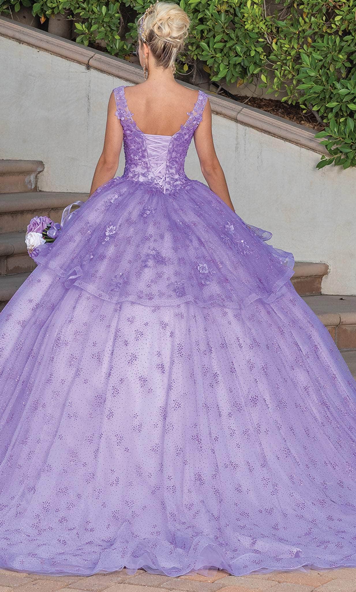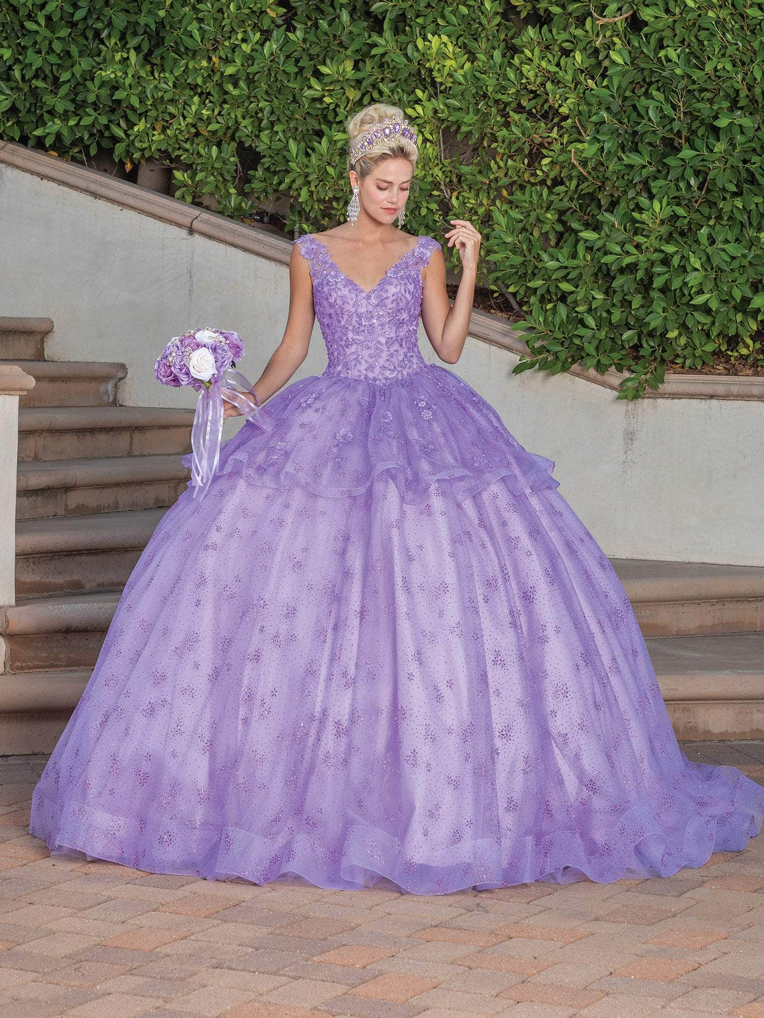 Capture the interest of the opulent crowd in this stylishly made Dancing Queen 1702 creation. Festooned with glimmering rhinestone details and sewn with embroidered details, this inspire piece features a v-neckline and sheer straps. Festooned with 3D floral details and a corset cinched back, the waist is draped with a ruffled peplum, the glitter embellished skirt forms a ballgown silhouette with a sweeping denouement. This ensemble parades a sheer embellished cape. Exude an exceptional elegance that will mesmerize them in this Dancing Queen masterpiece. Models are wearing the Bahama Blue and Lilac colors.