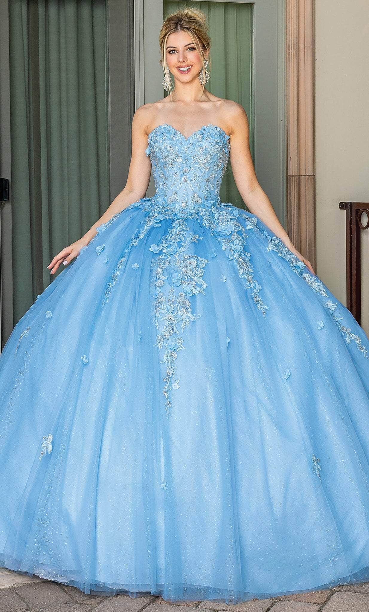 Draw out the princess in you with this Dancing Queen 1717 creation. Presenting a sweetheart neckline that is complemented by a corset lace-up back, this strapless gown can capture everyone's eyes. It is beautifully embellished with beadwork, embroidery, and 3D floral appliques. The voluminous glittering skirt moulds a ballgown silhouette that trickles onto the full length hem and sweeping train. This Dancing Queen 1717 masterpiece is truly a definition of glamour. Model is wearing the Bahama Blue color.