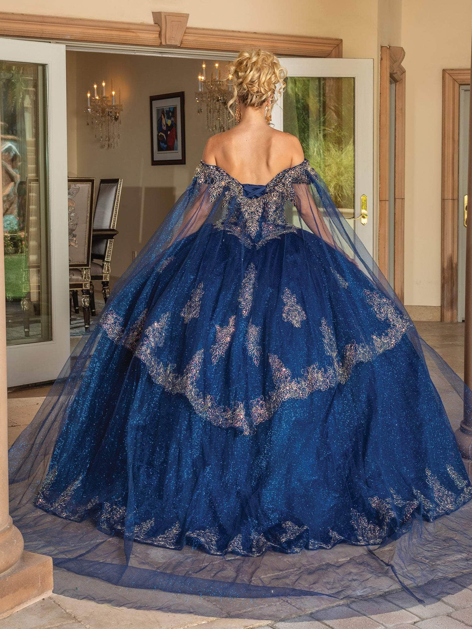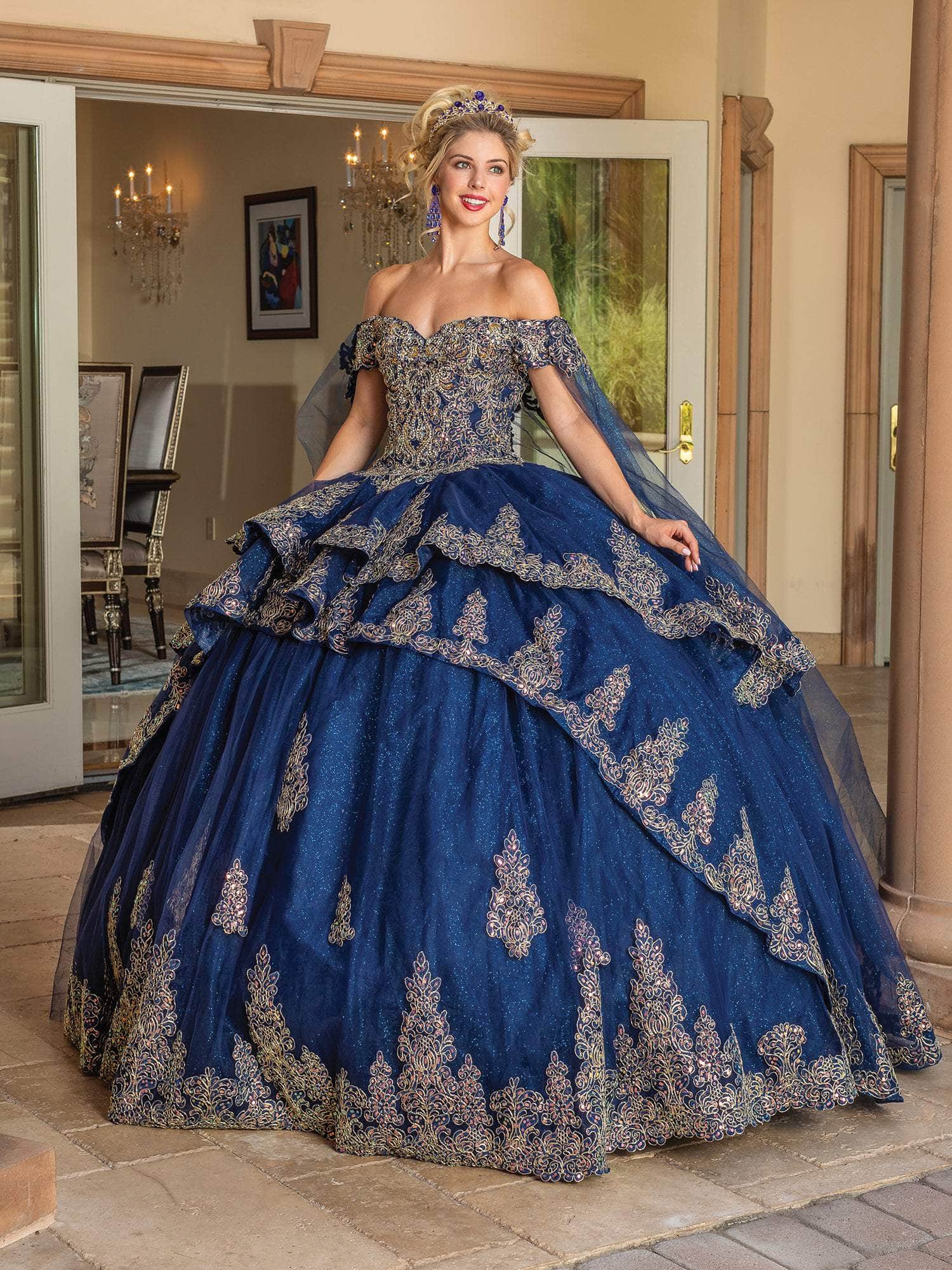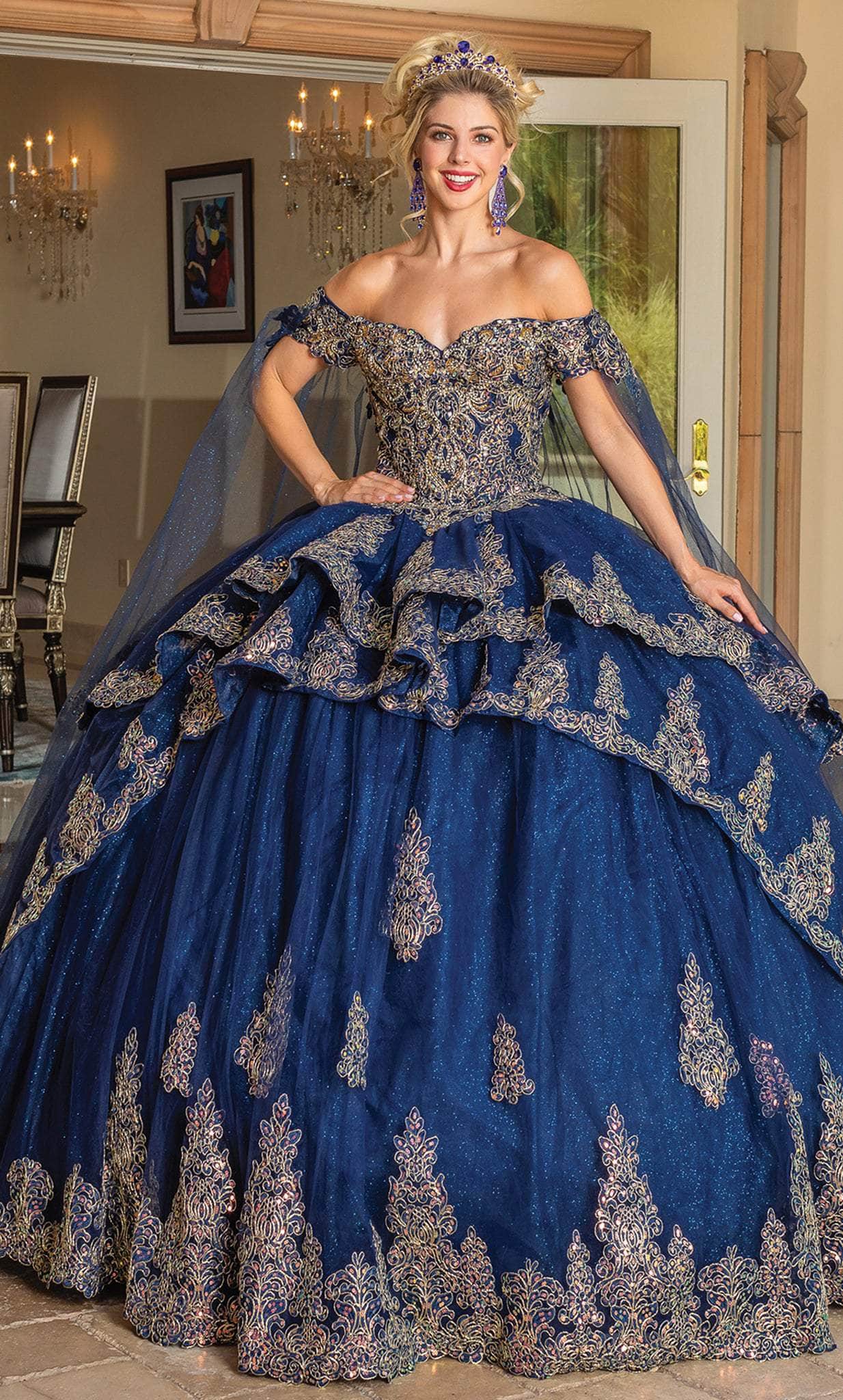 Leave everyone transfixed on you in this impeccably made Dancing Queen 1723 creation. Eloquently detailed with gleaming beadwork and metallic lace appliques, this gown flaunts an off shoulder neckline with a sweetheart notch. Dripping with lace accents and a an open back with a corset detail, a sheer matching cape cascades beautifully from the back. Sumptuous ruffled layers wrap the waist as the skirt shows a lace trimmed design. The voluminously layered skirt forms a ballgown silhouette with a sweeping train. Fall in love with the romantic flair and beauty of this stylish Dancing Queen masterpiece. Model is wearing the Navy color.