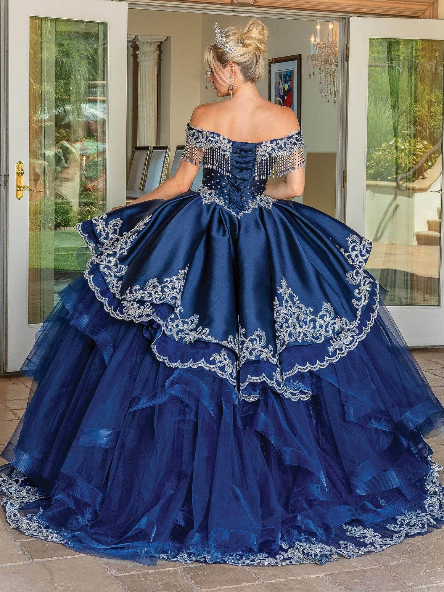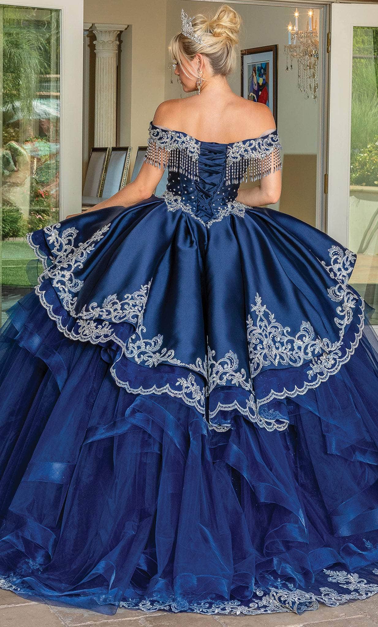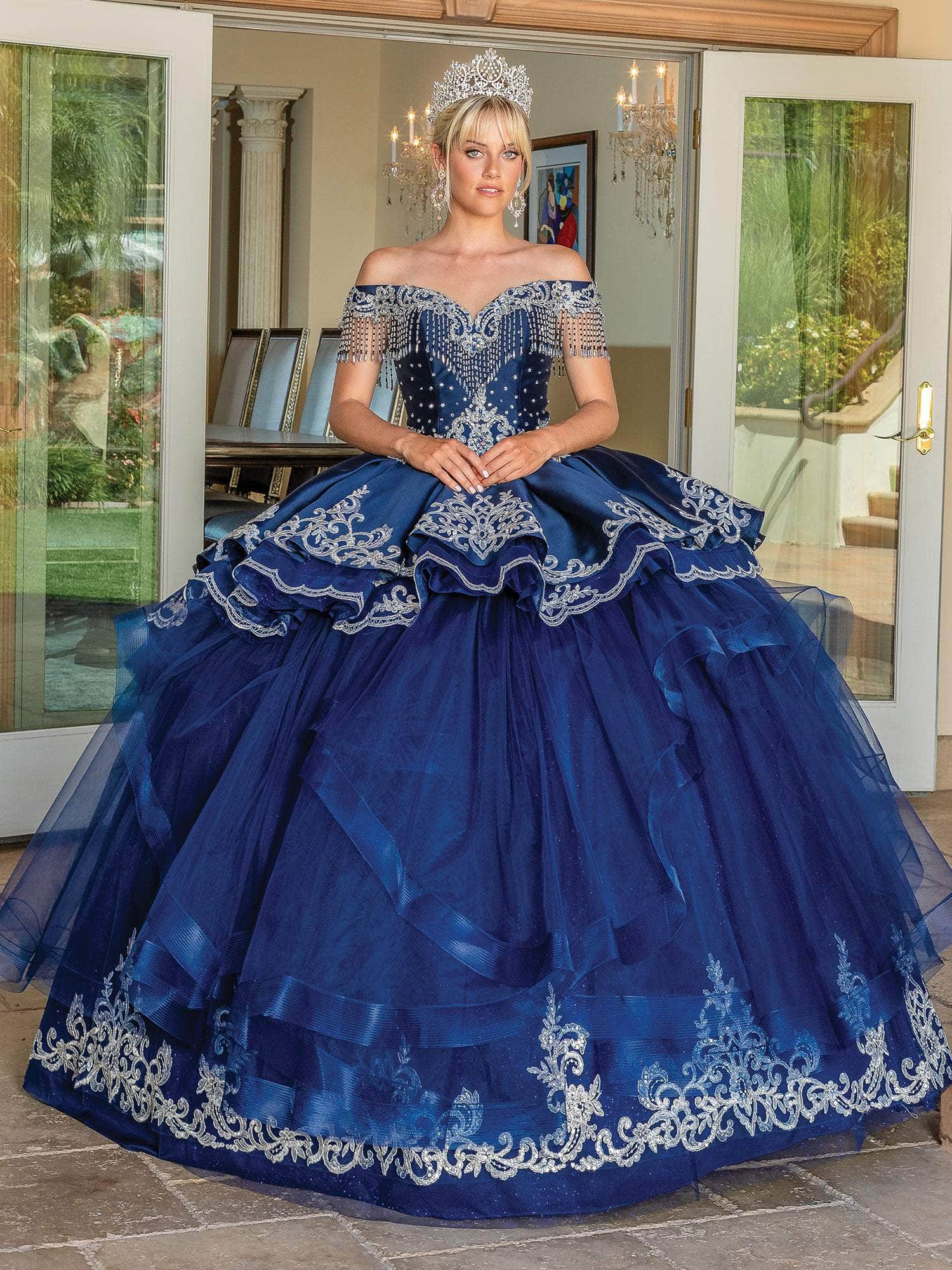 Enter the ballroom with poise and beauty in Dancing Queen 1724 masterpiece. This spectacular silhouette is embellished with sparkling beadwork and lace appliques. Perfectly trimmed with beaded fringes, the bodice has an off-shoulder sweetheart neckline and a lovely corset lace-up back. The skirt highlights the ruffled tiered layers and horsehair hem that adds volume to the ballgown silhouette, completed with an eye-catching sweep train. This Dancing Queen 1724 style will definitely bring out the royalty in you! Model is wearing the Navy color.