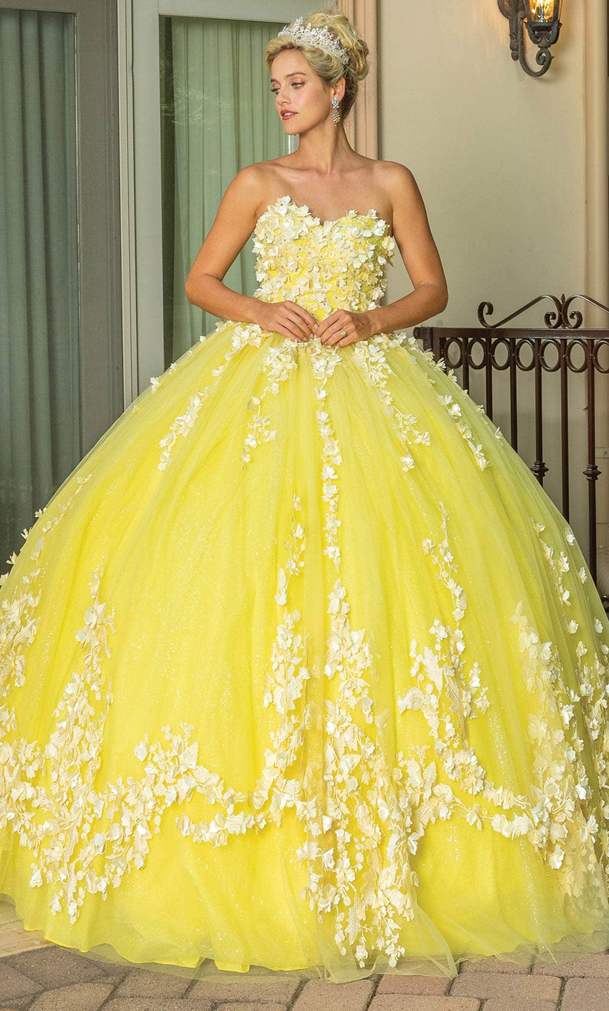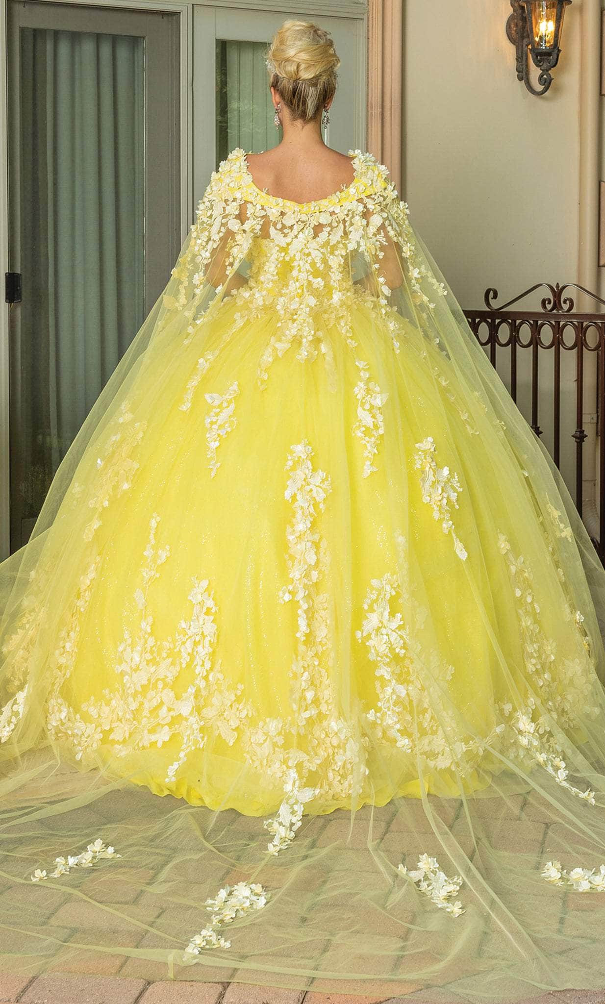Create a perfect memory for your next special event by wearing this elegant Dancing Queen 1725. Structured with a sculpted bodice rendered with floral applique details and gleaming bead adornments, this beauty features a strapless bodice with a sweetheart neckline. Styled with a long cape, the sumptuously layered skirt is festooned with blossoms as it forms a ballgown silhouette with a train. This Dancing Queen 1725 definition of simpleness and sophistication will make you feel classy and elegant. Model is wearing Yellow color.