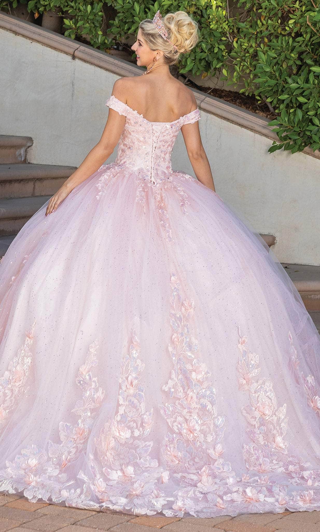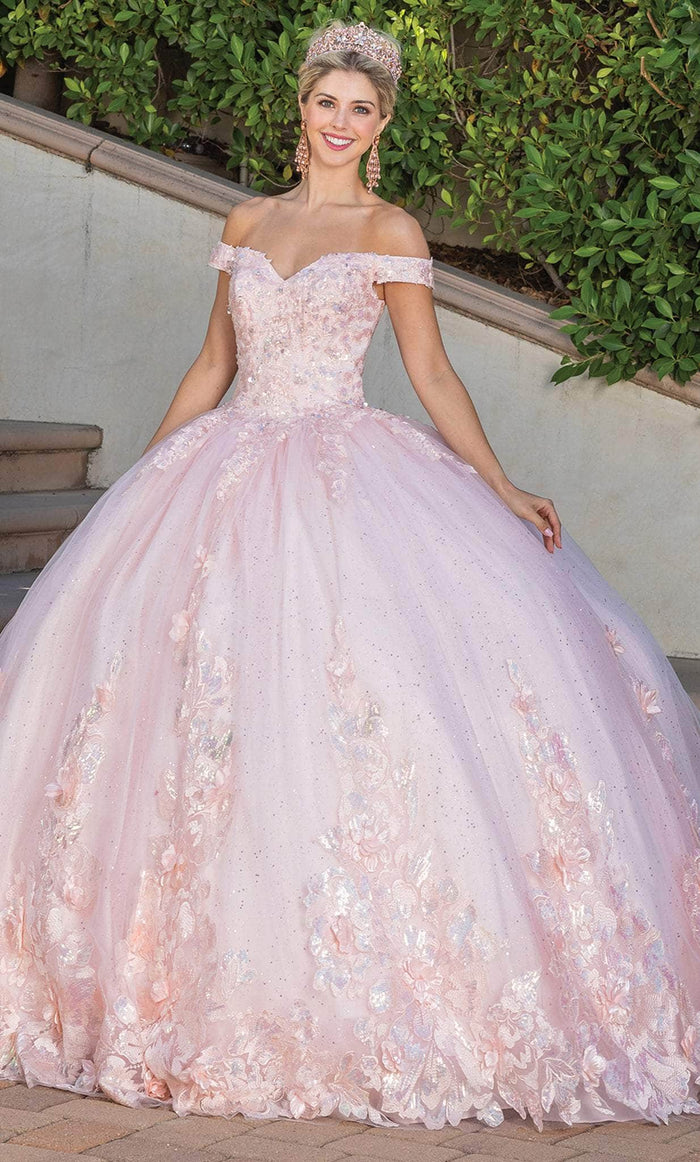 Everyone will be talking about you when you wear this masterpiece from Dancing Queen 1748. This winning piece will let everyone remember you as it charms with an off-shoulder bodice crowned with a V-neckline and embellished with shimmering rhinestones. For a snug fit, the back is detailed with a lace-up tie and the ballgown skirt with an overlay tulle trails down to a sweeping finish with 3d floral embellishment. In this Dancing Queen 1748, you can flaunt your best assets while enthralling the crowd. Model is wearing Blush colors.
