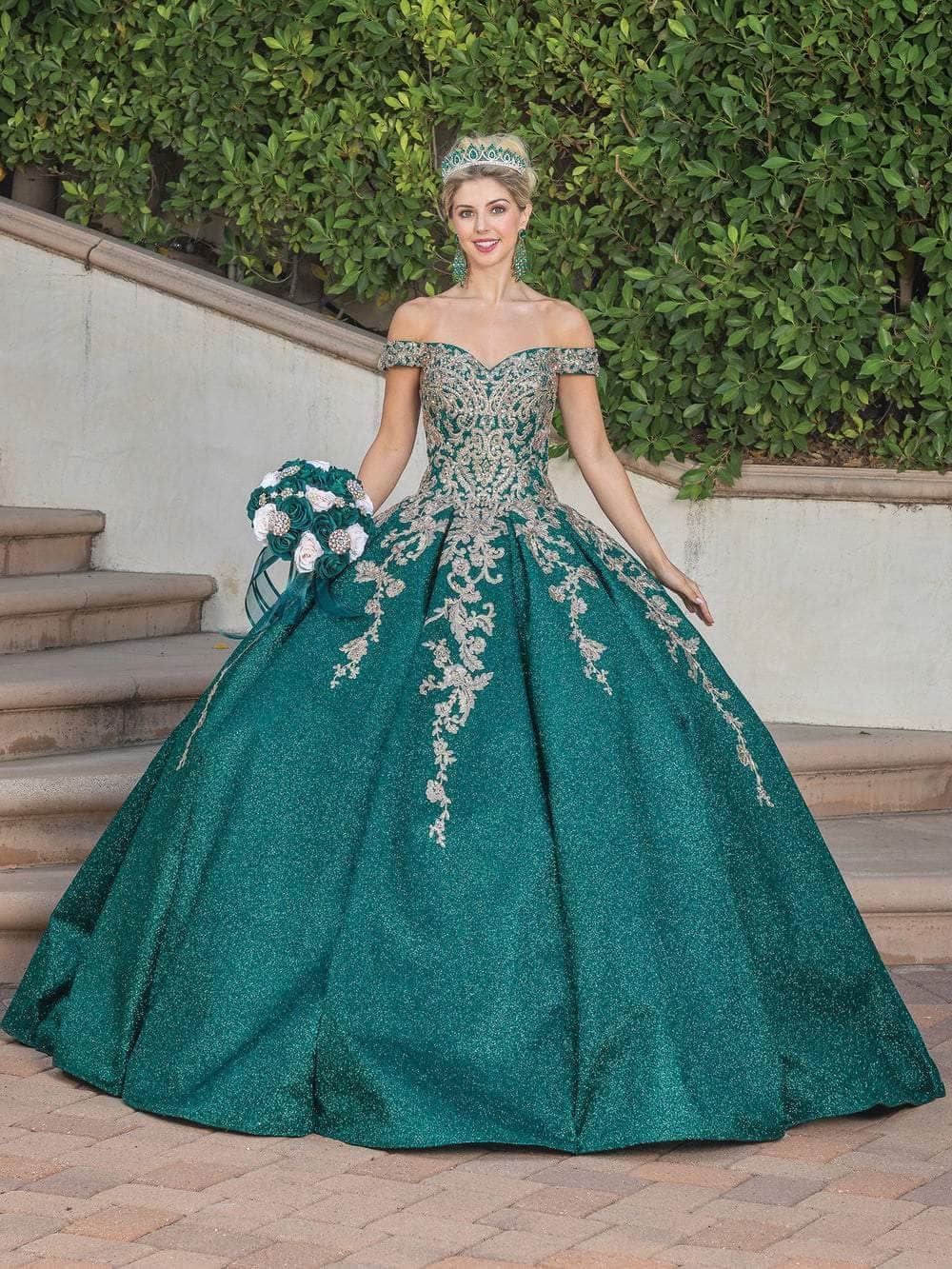 In this Dancing Queen 1753 creation, you'll leave a horde of admirers as you grace this impeccable occasion. With an off-the-shoulder neckline and rhinestone accents, this stunning garment, which is flatteringly tailored with a glitter-detailed fabric and metallic lace details, accentuates the female form. The bodice descends to a dropped waist and is adorned with a lace-up accent at the back. The elaborate pleated skirt with its trailing train sweeps like a ballgown silhouette. With this Dancing Queen 1753 masterpiece, you can let your wardrobe choices express your impeccable taste and stylish flair. Model is wearing the Hunter Green color.