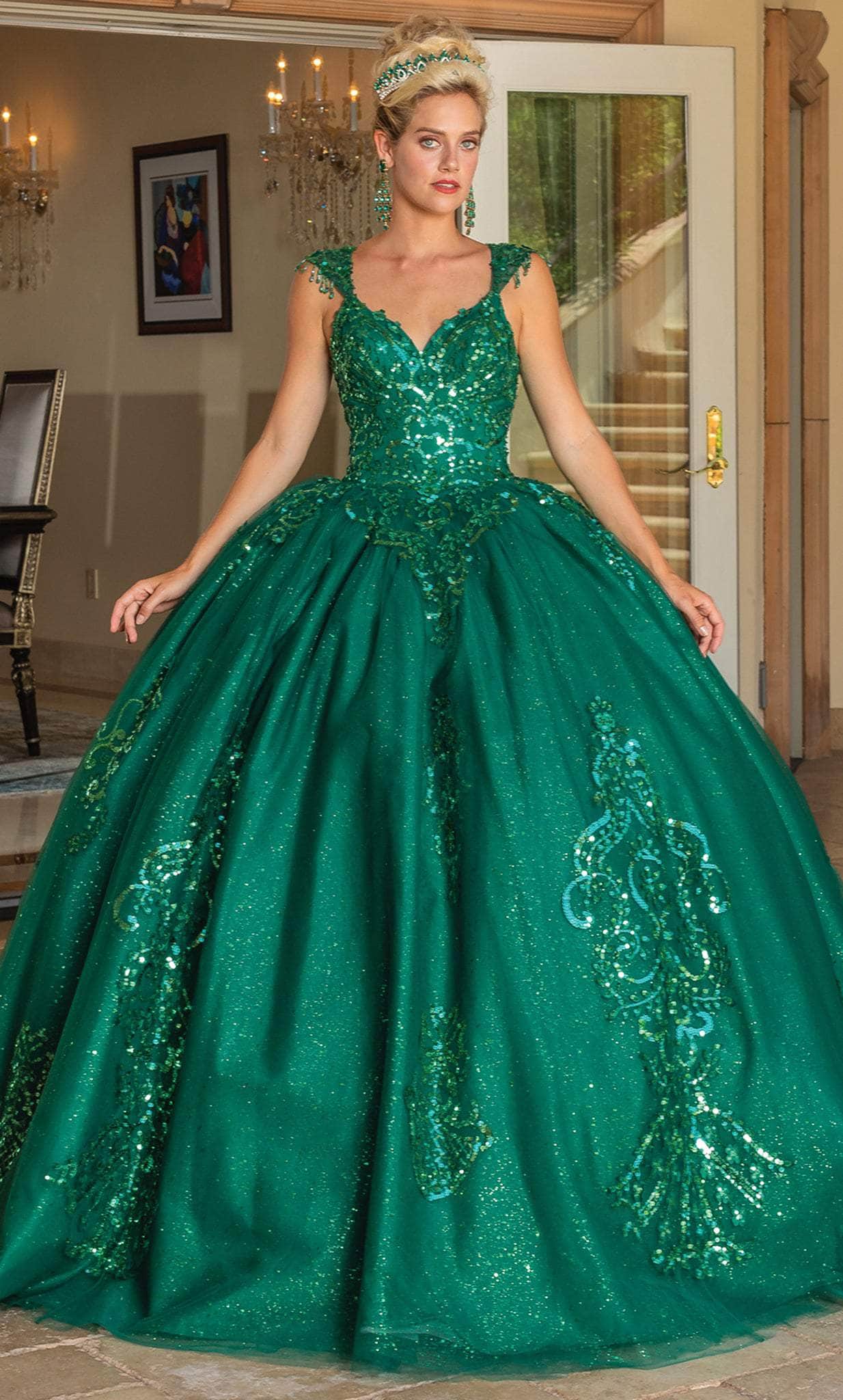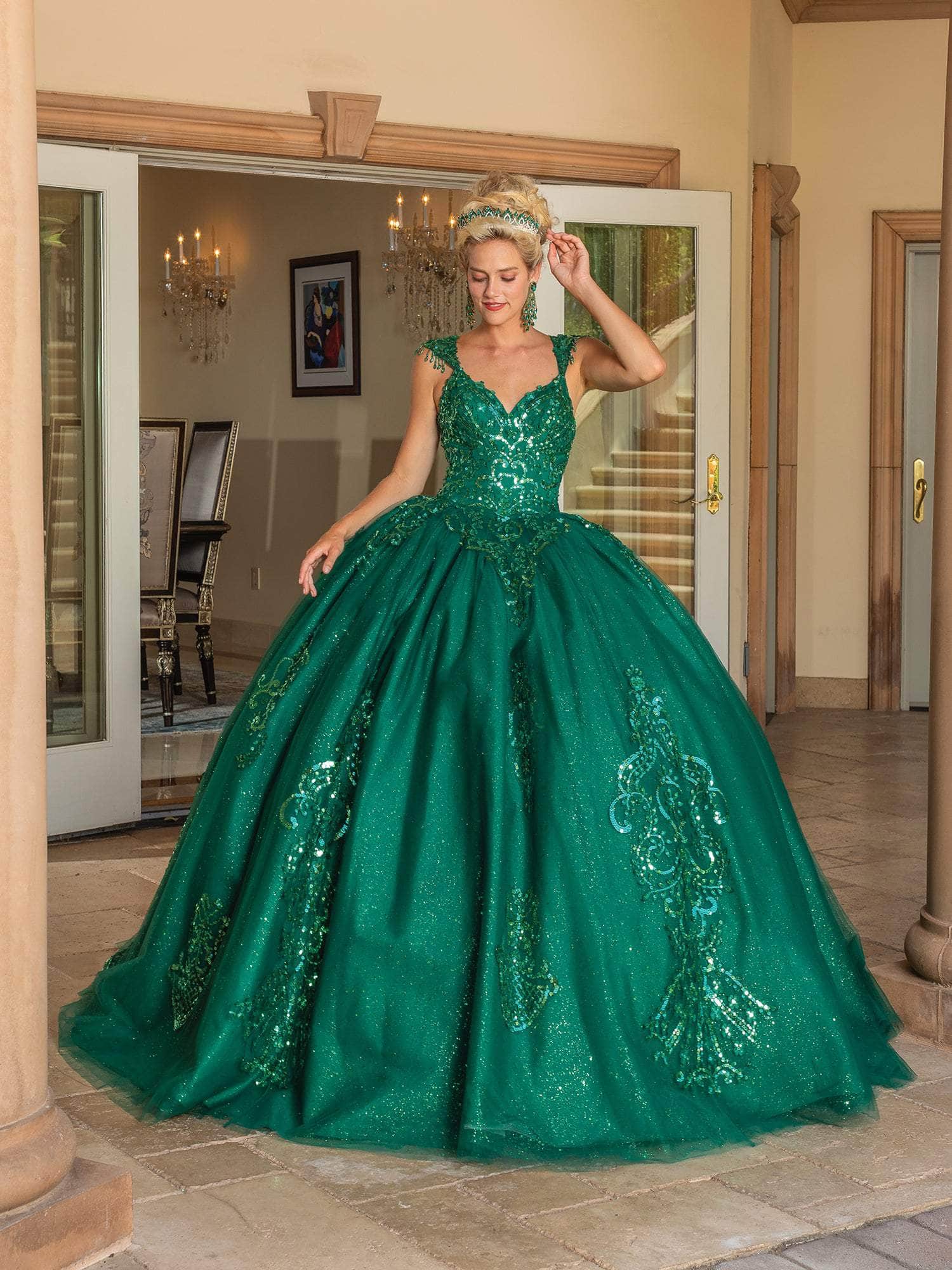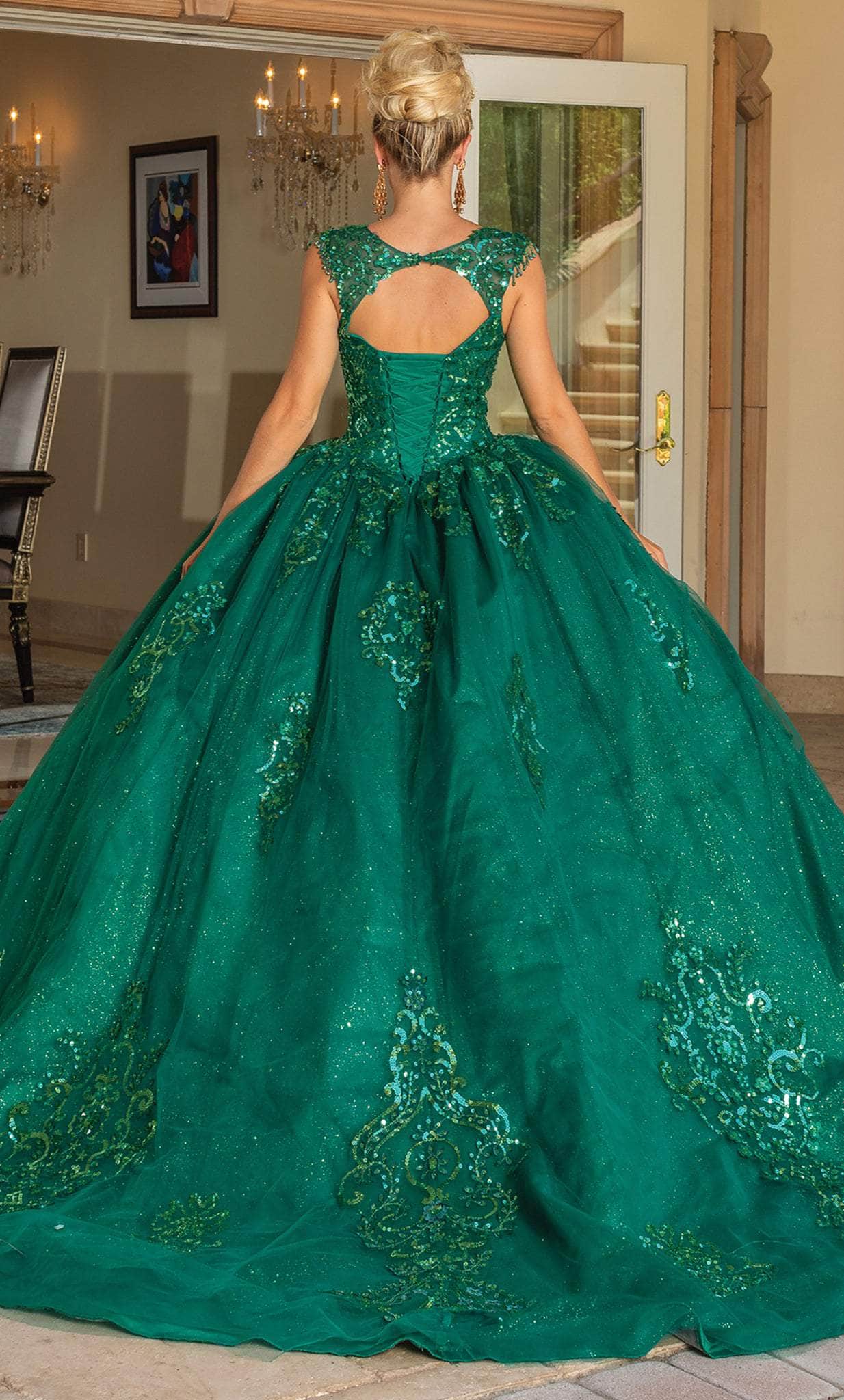 Exude a charm that is meant to mesmerize the elite crowd in this gorgeous Dancing Queen 1758 creation. Amazingly festooned with shimmering sequins, this outfit flaunts a sweetheart neckline and cap sleeves with playful beaded fringes. With its cutout design, the back reveals a glimpse of skin and is secured by a corset lace-up tie closure. It has a voluminous ballgown skirt that cascades in full length hem and dramatic sweep train. This Dancing Queen 1758 gown is an absolutely breathtaking look. Model is wearing the Hunter Green color.