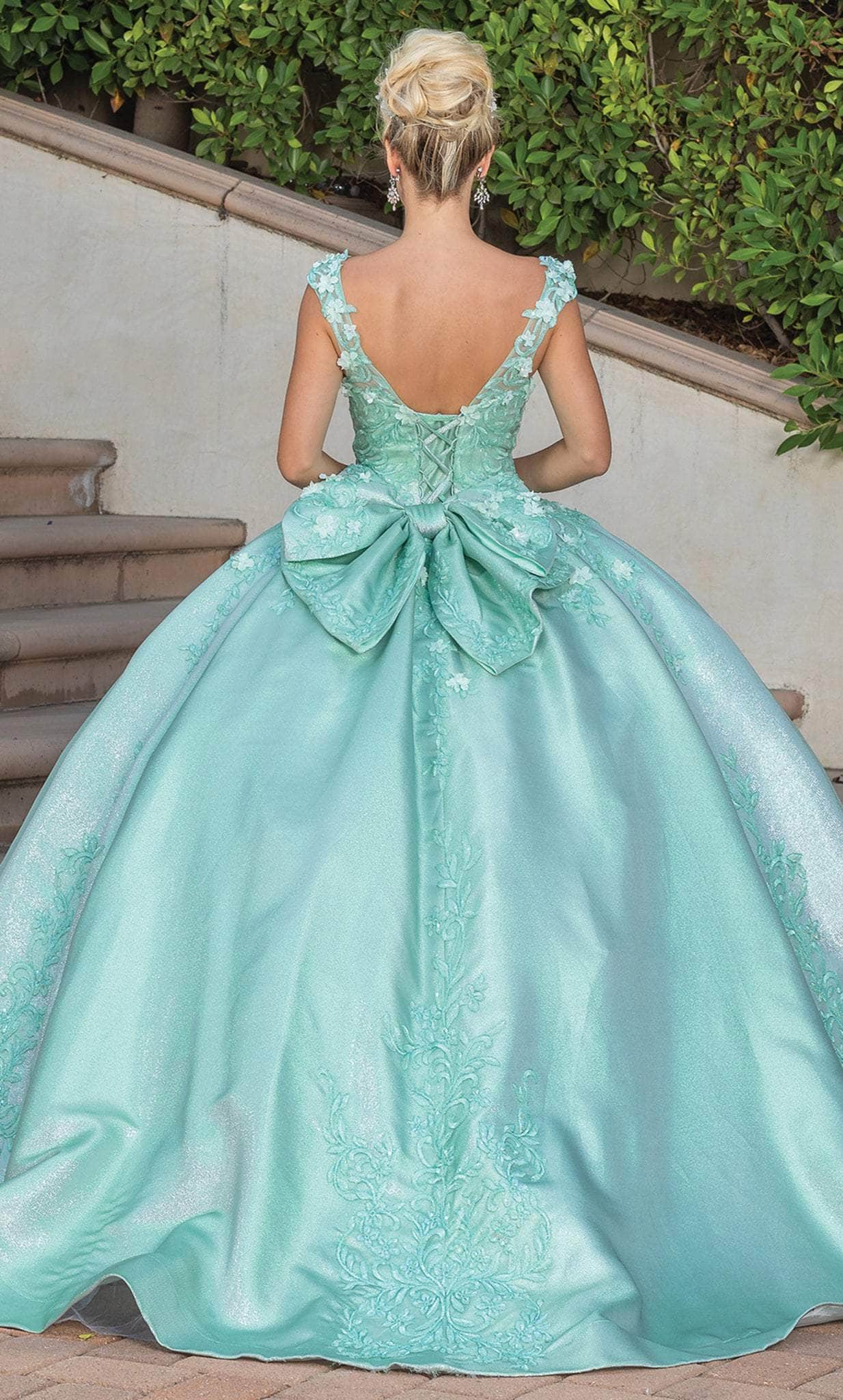 Every detail of this Dancing Queen 1762 gown is dripping with faultless charm. This fairy tale style is embellished with beautiful 3D floral appliques, embroidery and studded beads. Showcases in a v-neckline and cap sleeves as well as an open back with a stunning large bow accent and lace-up tie closure. Sculpted with box pleated, the ballgown skirt gracefully cascades to the floor length hem and sweeping train. You are sure to turn heads in this Dancing Queen 1762 masterpiece. Model is wearing the Sage color.
