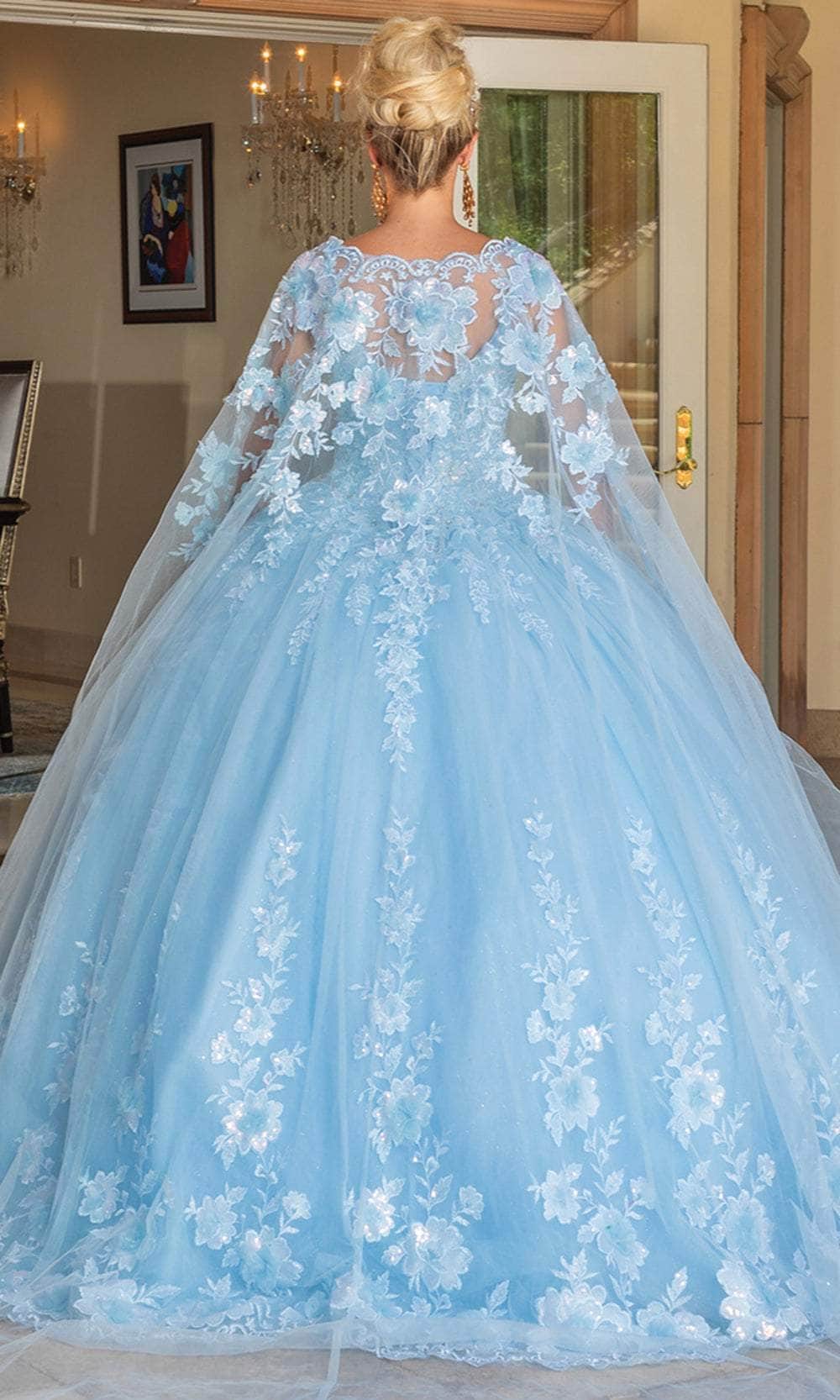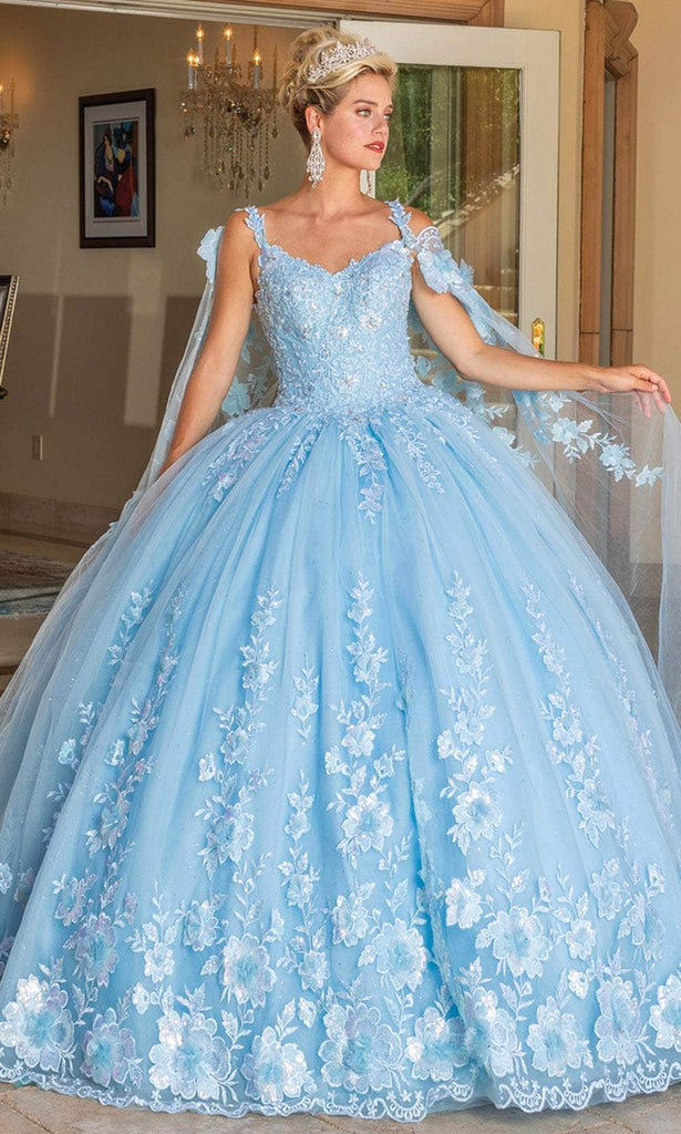 In this Dancing Queen Quinceanera Dresses 1778, exude an air of pure feminine flair. With its gorgeous floral embroidery, sparkling beads, and scalloped details, the sleeveless gown is sure to turn heads. Along with a classic mid-open lace-up back, it features a sweetheart neckline and laced shoulder straps. A long, stunningly sheer cape slinks to the cathedral train for a dramatic finale. A full-length, voluptuous ballgown silhouette is carved into the gathered skirt. In this stunning design by Dancing Queen Quinceanera Dresses 1778, you're sure to turn heads. Model is wearing the Sky Blue color.