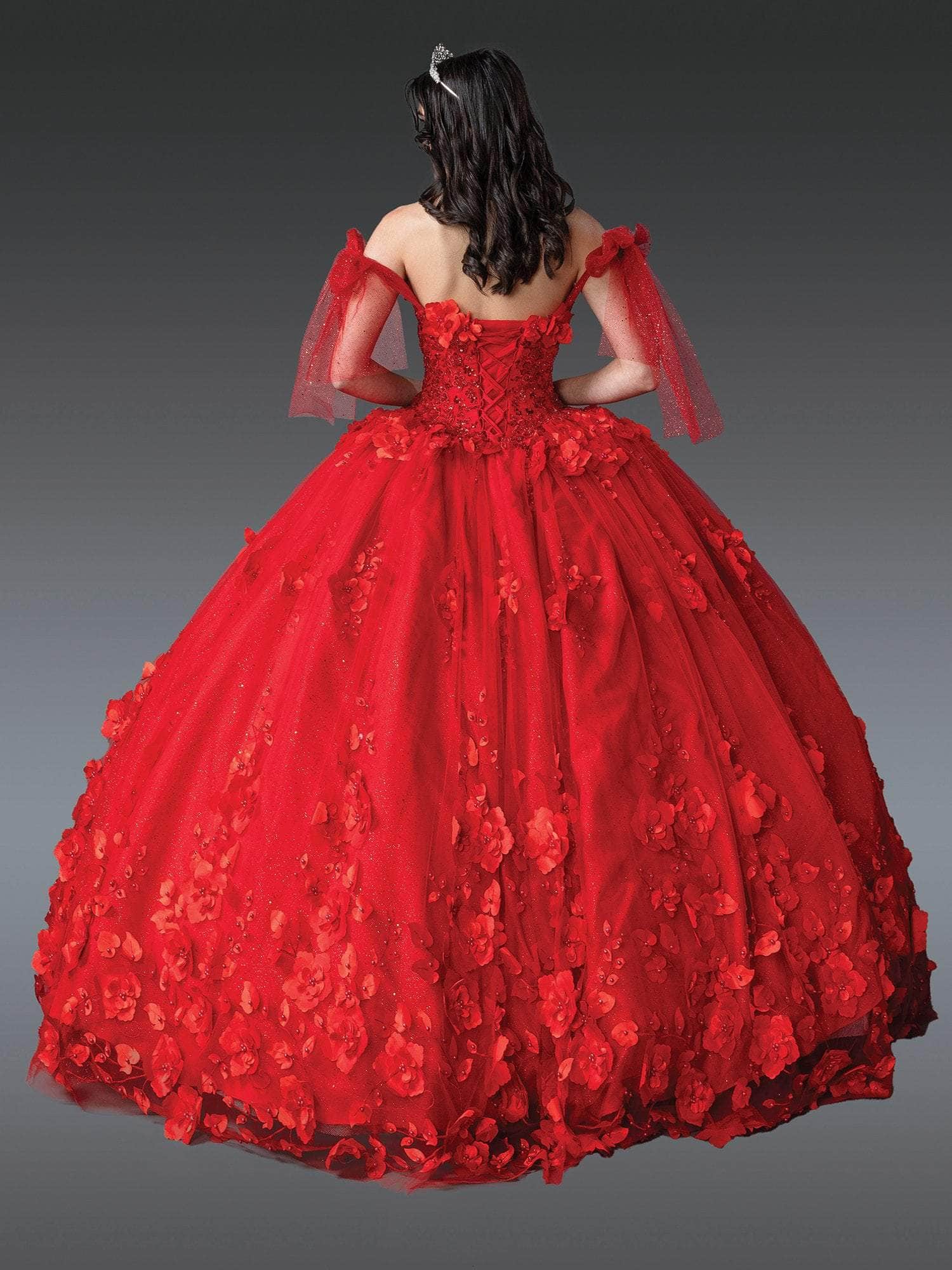 Step into a realm of enchantment with the Dancing Queen 1792, designed to make your dreams come true. This gown boasts an alluring sweetheart neckline paired with whimsical sheer bow off-shoulder sleeves and a voluminous ballgown silhouette. Intricate beading and 3D floral details enhance its silhouette, adding depth and charm. Whether it is a quinceanera or a grand gala, the Dancing Queen 1792 promises to capture hearts and turn every step into a magical moment to remember. Model is wearing Red color.