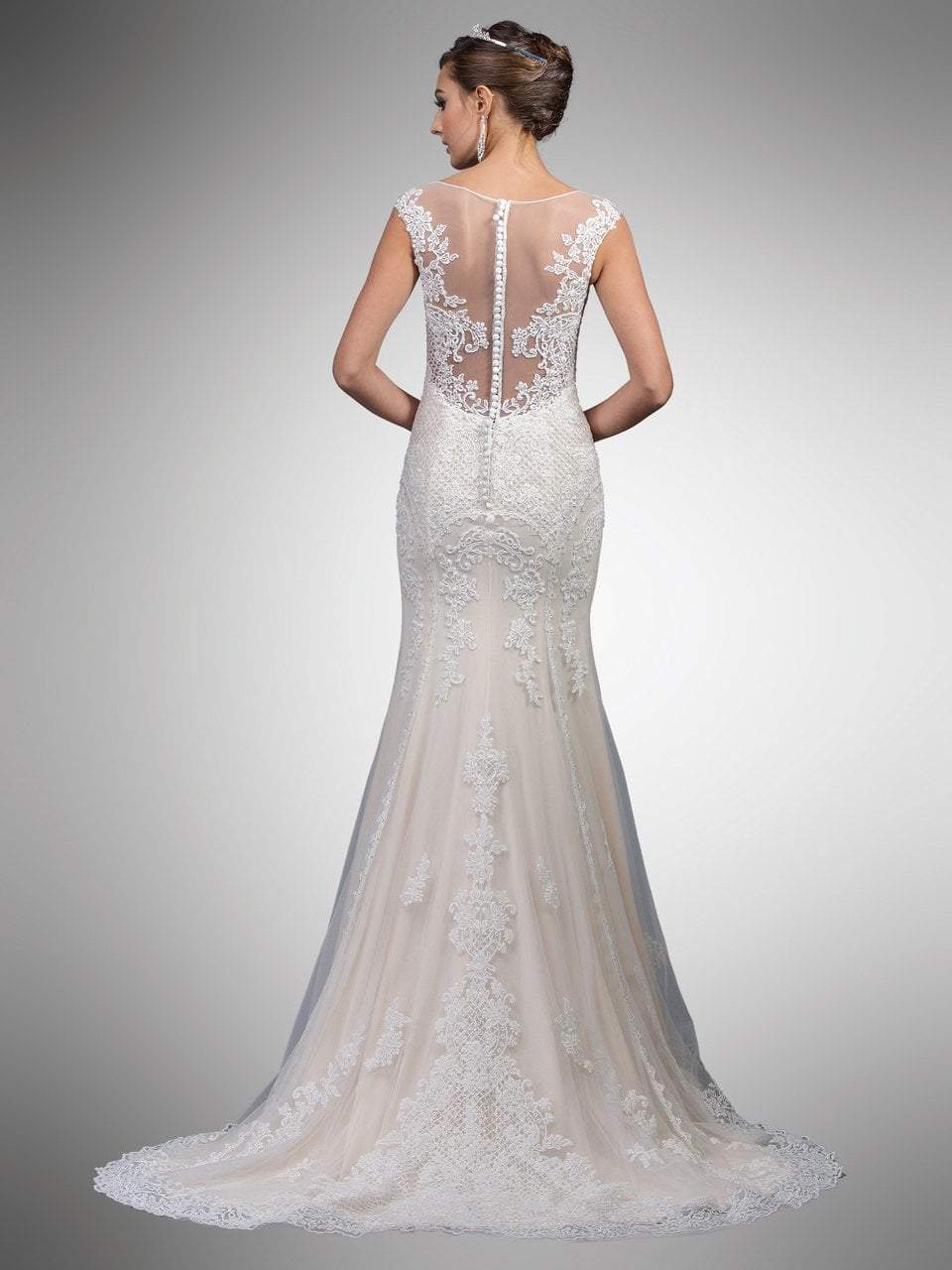 Enter the hall with grace and beauty in Dancing Queen 0018. This charming gown features an illusion bateau neckline with cap sleeves. Floral lace appliques accent the fitted sweetheart lined bodice. The back is designed with trail of buttons while the skirt flows towards the floor in a trumpet silhouette and finishes in a sweep train. This Dancing Queen gown is a timeless look suited for your special occasion.