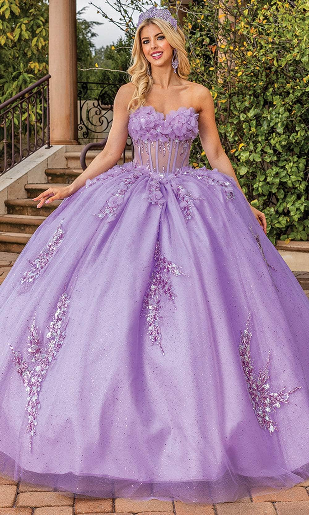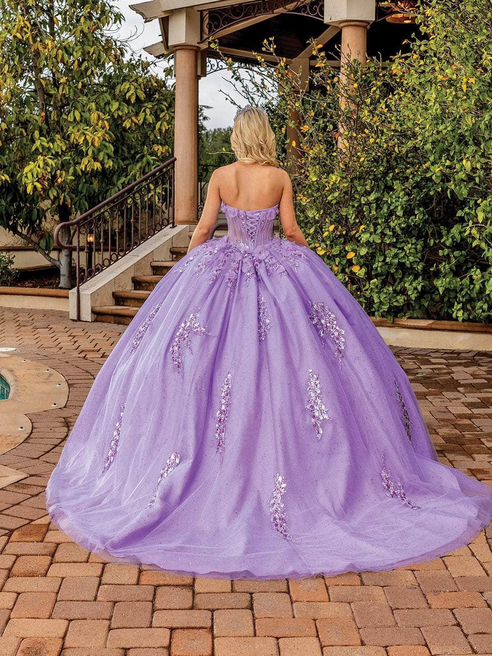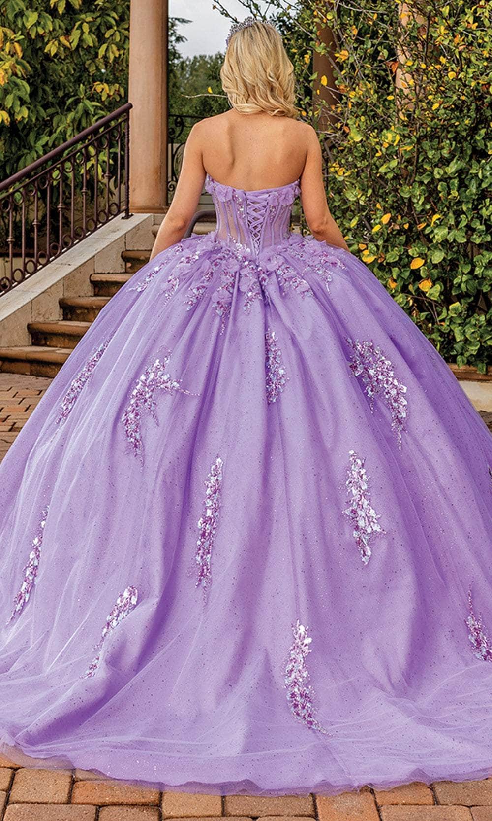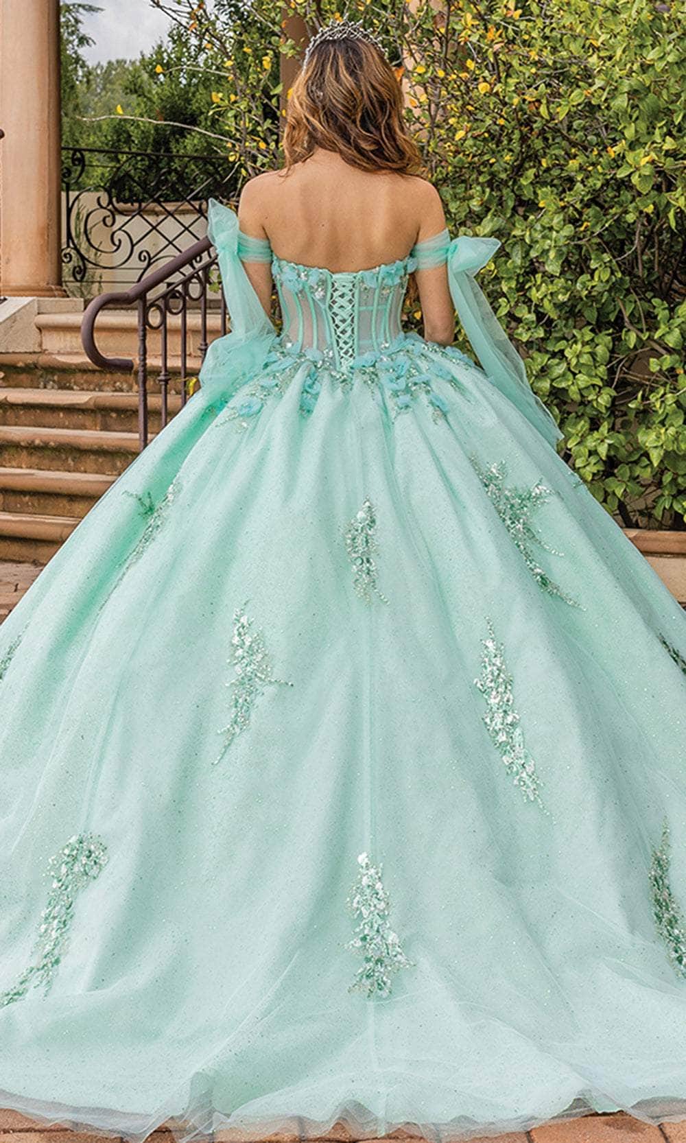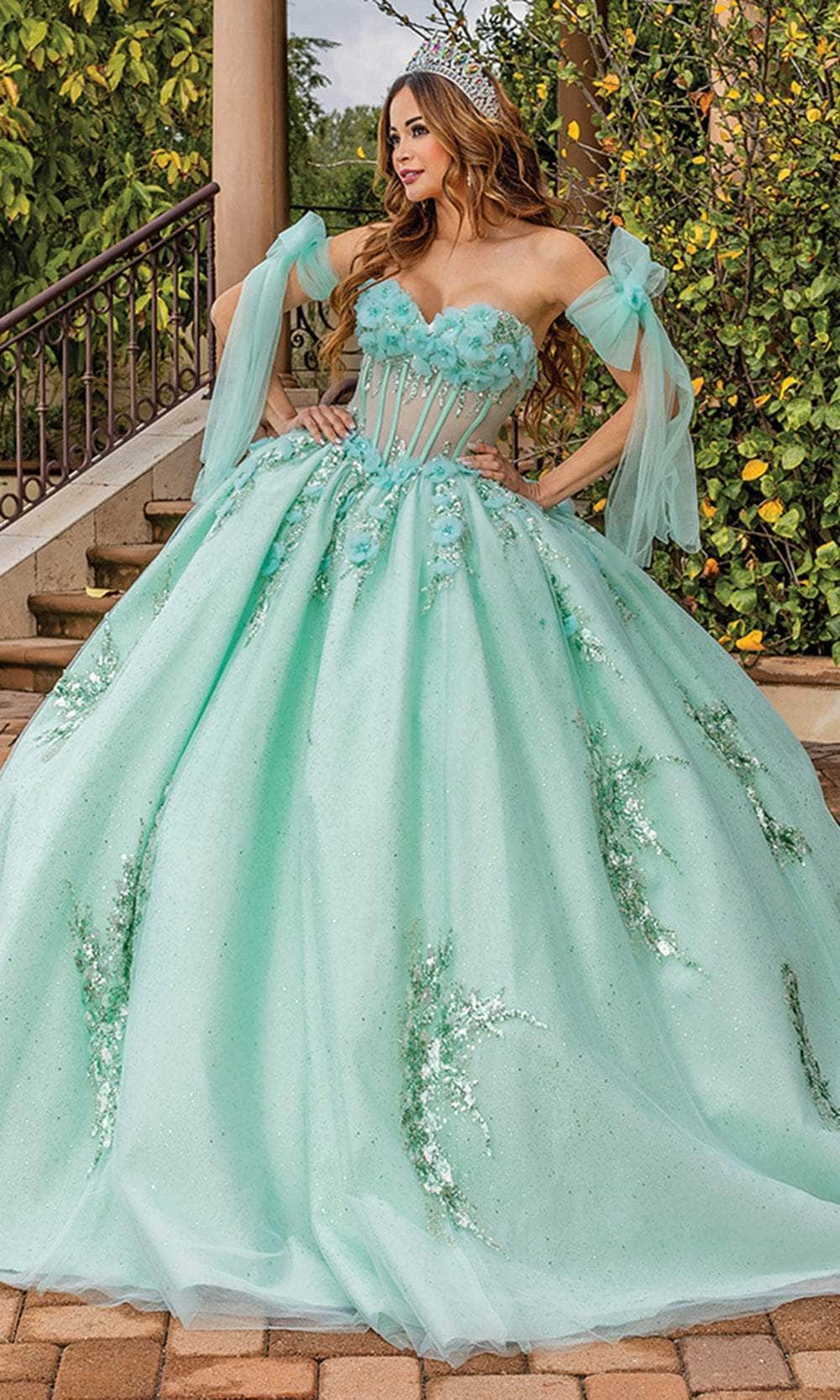 Show off your extreme decadence in this exquisitely decorated Dancing Queen 1813 piece. This attractive garment showcases a sweetheart neckline with a strapless design, perfectly adorned with a layer of floral appliques along the bust. Detachable bows and elaborate sashes cascade to the floor, revealing the corset boning beneath a sheer midriff that adds glitz to the whole look. With a trailing train that creates a ballgown silhouette, the opulent skirt displays lavish embellishments and a sheer corset that is laced back and nipped at the waist. At your next get-together, make a splash by wearing the stunning Dancing Queen 1813 masterpiece. Models are wearing the Lilac and Mint colors.