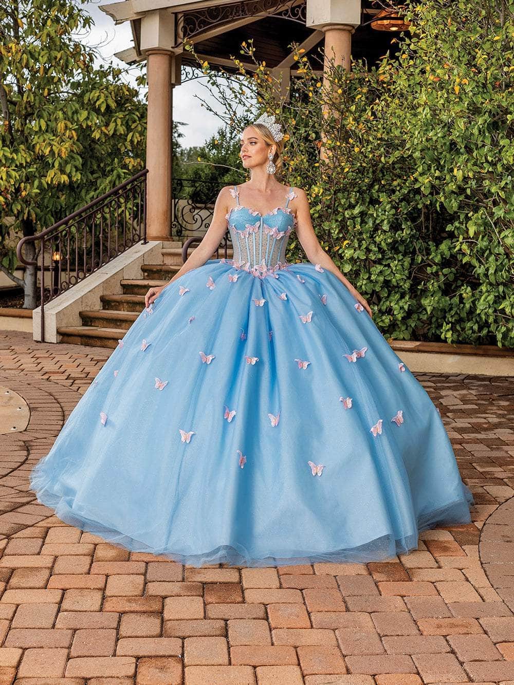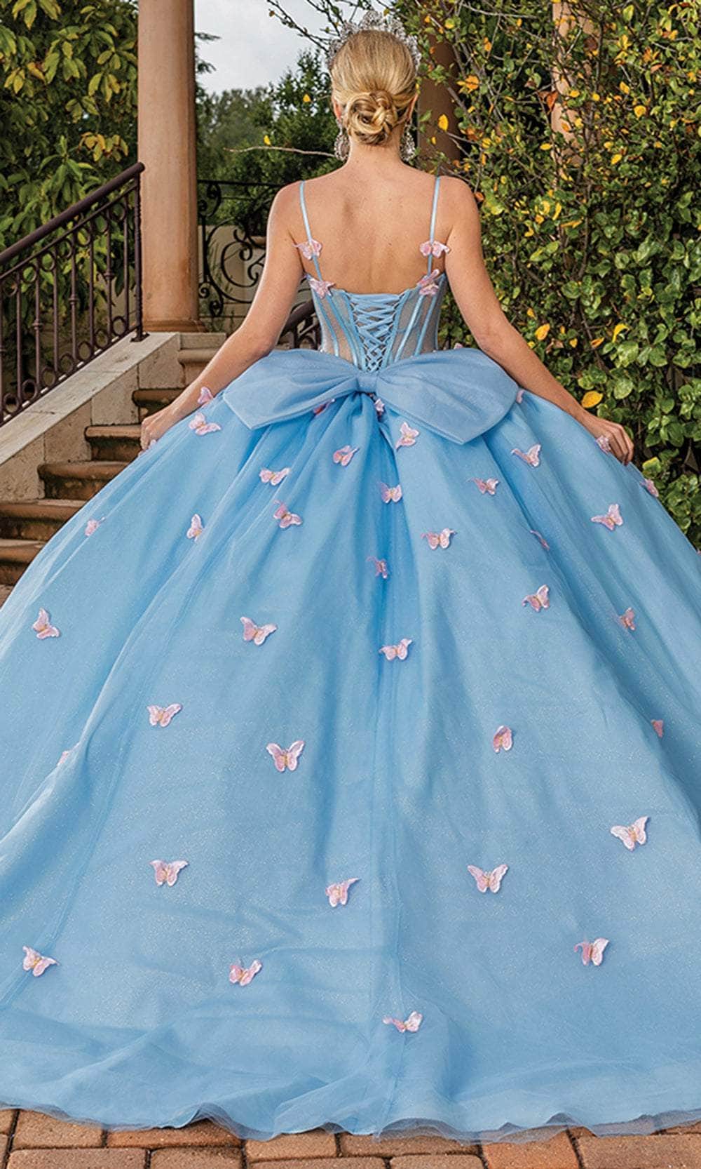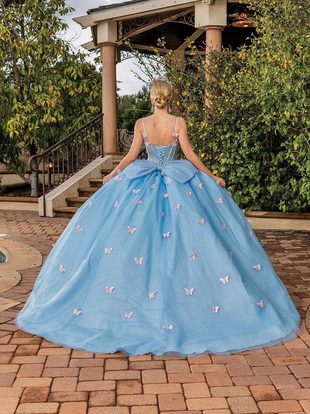 Wear this enticingly whimsical Dancing Queen 1815 creation to exude elegance and allure throughout the event. This magnificent garment has a sweetheart neckline with spaghetti straps and is tailored with a glittering fabric that forms a bustier bodice. corset boning and shimmering decorations on a sheer midriff that reach the basque waist. This stunning dress features an illusion back, lace-up design, and butterflies that accentuate its ballgown silhouette, oversized bow, and trailing denouement. In this captivating Dancing Queen 1815 masterpiece, walk with glitz and turn heads wherever you go. Models are wearing the Bahama Blue and Champagne/Gold colors.