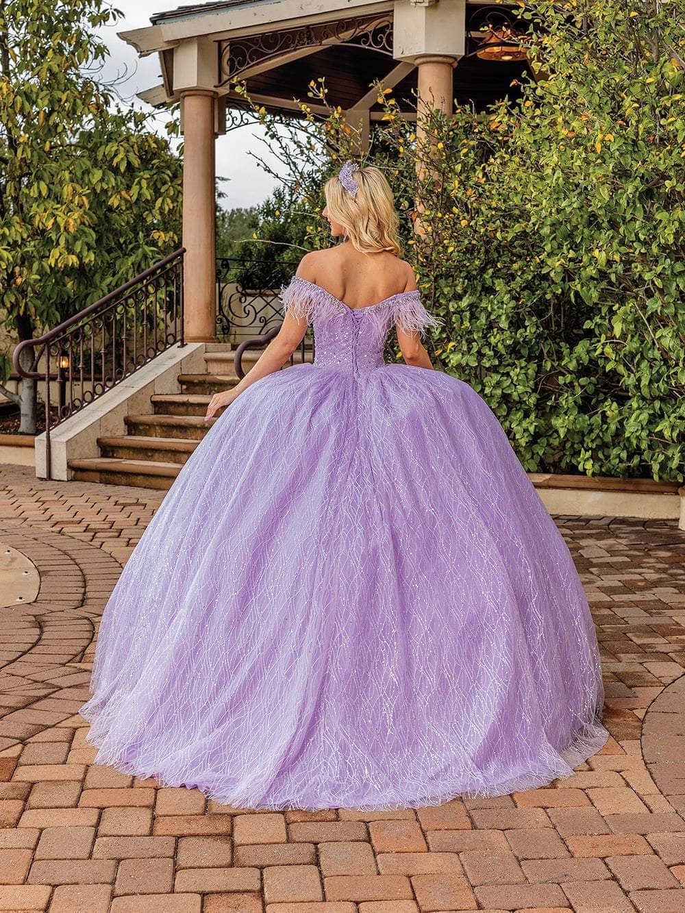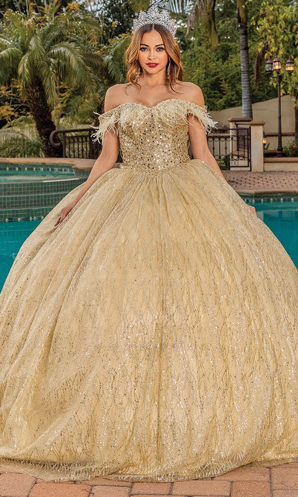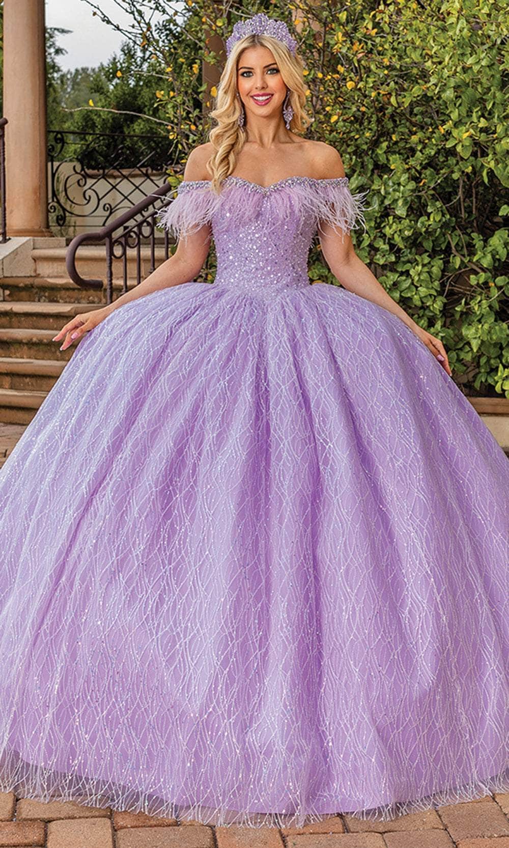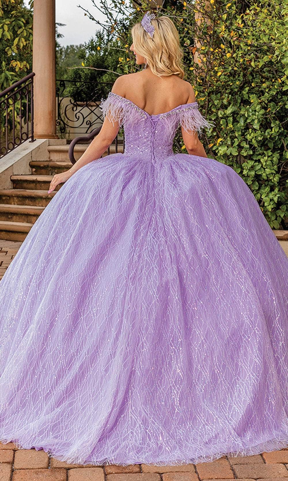 In this exquisitely crafted Dancing Queen 1829 creation, sparkle like never before. This stunning piece has an off-the-shoulder neckline embellished with feather fringes and beadwork, and it shimmers with elaborate sequin-like embellishments along a tailored bodice. The sparkling line-accented fabric layers into a ballgown silhouette with a graceful trailing hem, and the ensemble is further enhanced by an exquisitely fastened corset-style closure at the back. In this utterly captivating Dancing Queen 1829 masterpiece, radiate grace and allure throughout the occasion. Models are wearing the Gold and Lilac colors.
