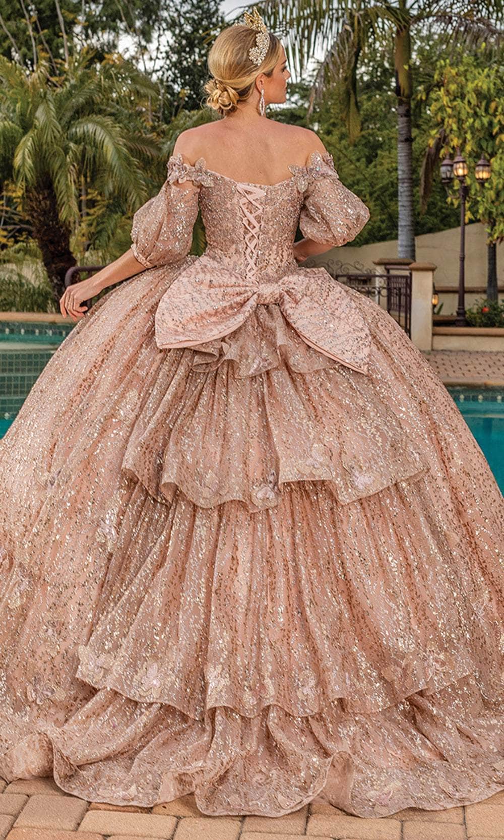 In this beautifully crafted Dancing Queen 1877 creation, embrace your inner goddess. This gown, with its off-the-shoulder neckline and sweetheart bodice, embraces the feminine form and displays a complex spectacle of glittering details. The wonderfully elaborate skirt creates a voluminous silhouette with a tiered ruffled back panel and an oversized bow accent. It is crafted with a lace up back and trimmed with butterfly appliques along the trim of the balloon sleeve. Plan a moment when you can steal the show in this magnificent Dancing Queen 1877 work. Model is wearing the Rose Gold color.