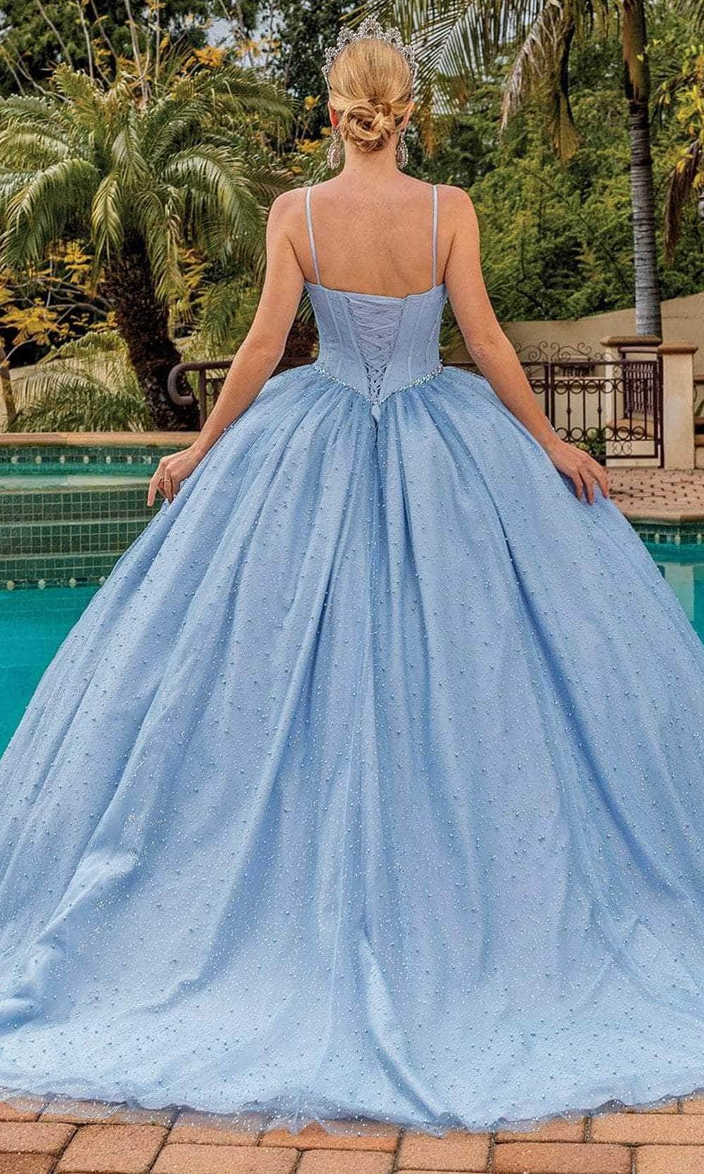 Indulge your inner fairytale side with this Dancing Queen 1891 masterpiece. Fashioned from glitter tulle and adorned with beadwork, the sleeveless gown radiates glamour and charm. Stringed with spaghetti straps, the sweetheart neckline and midrise lace-up back adds a touch of romance. The corset bodice boning details provide a flattering fit. Cinched with a Basque waist, the skirt reveals gathered details and flares out a magnificent voluminous ballgown silhouette that pools into a sweeping train. When you don an amazing gown from Dancing Queen 1891, everyone will be envy. Model is wearing Dusty Blue color.