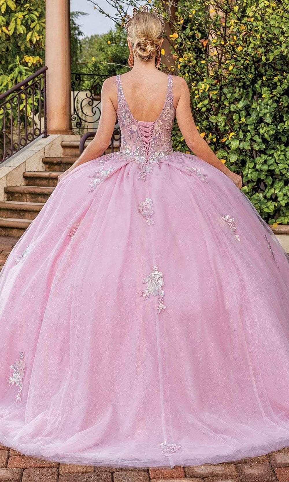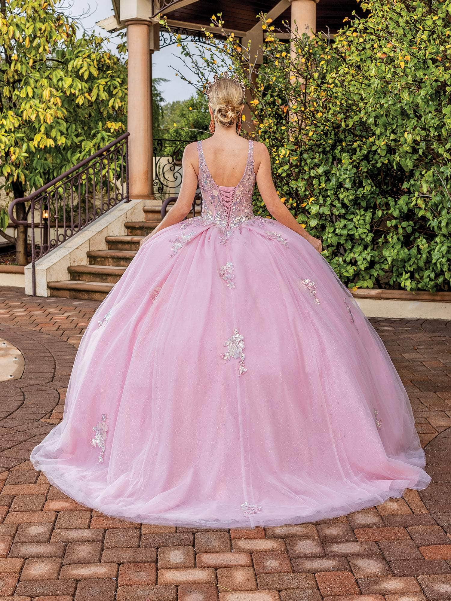 Capture everyone attention in the room with this Dancing Queen 1896 masterpiece. This exquisite sleeveless gown is artfully adorned with shimmering sequins and floral lace appliques. The illusion top bodice displays a plunging v-neckline and exposed boning details for a flattering fit. It also includes a low V-shaped back with a lace-up tie closure to customize the fit. The ballgown skirt is voluminous and unveils a box pleated detail for added allure. Completing the ensemble is the dramatic sweeping train that follows from behind. Bring out your inner princess in the Dancing Queen 1896 gown. Model is wearing Blush color.