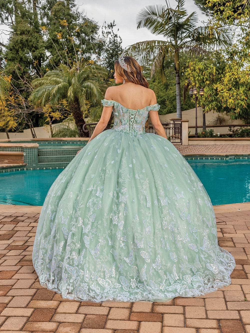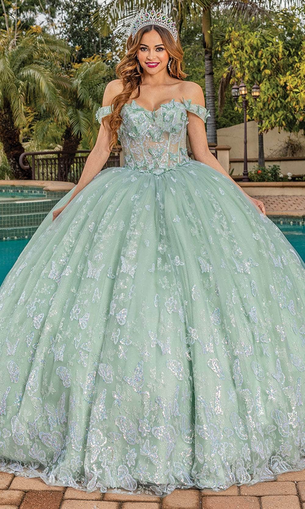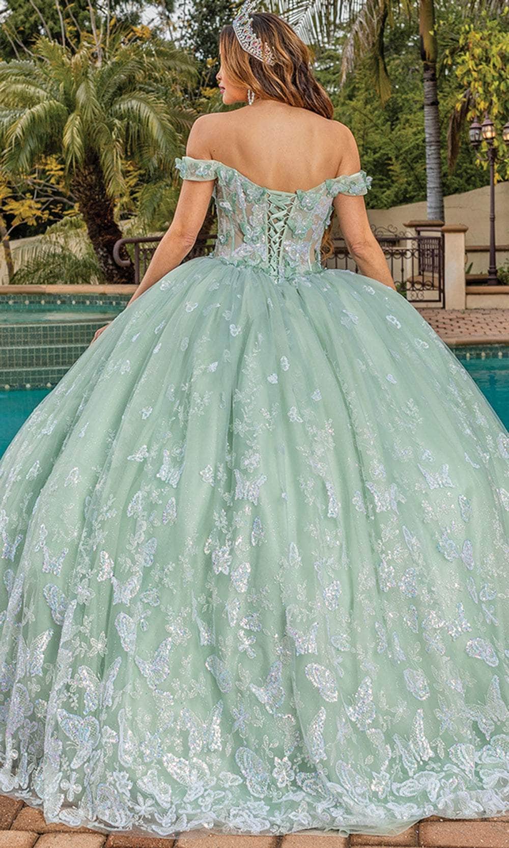 With this exquisitely crafted Dancing Queen 1897 creation, you can embrace your inner goddess. This dress, which features an off-the-shoulder neckline and a sweetheart bodice, is exquisitely detailed to sculpt the female form with an alluring array of dazzling details. The back is designed with a lace-up back and adorned straps, and it is highlighted with butterfly appliques and a sheer corset boned midriff. A gorgeous display of shimmering butterfly embellishments and a graceful train highlight the intricately adorned skirt, which creates a voluminous silhouette. Create a moment in this remarkable Dancing Queen 1897 work of art that allows you to shine. Model is wearing the Sage color.