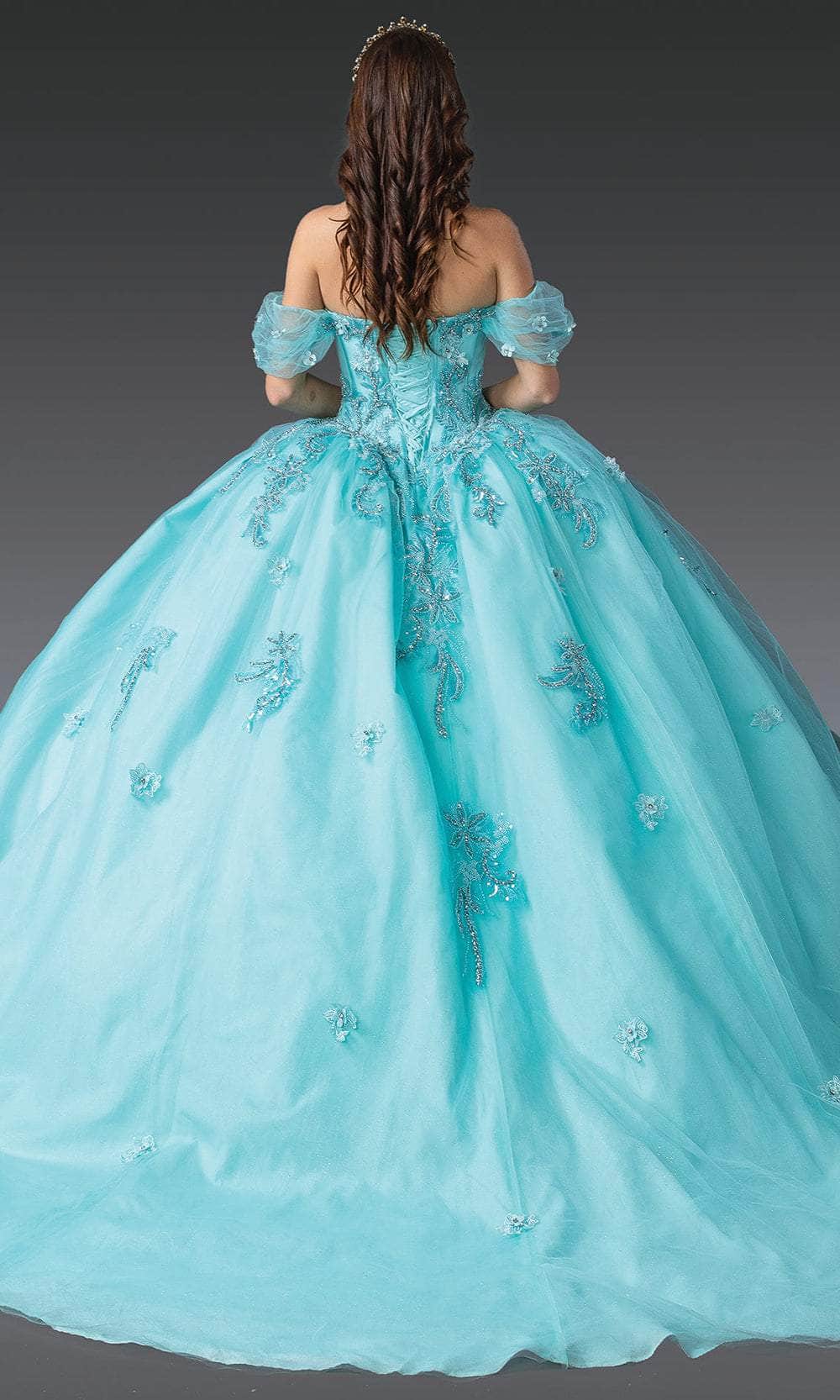 Exude whimsical beauty in the Dancing Queen 1903 gown, a masterpiece of intricate beadworks and floral embroidery. Designed with a corset boned bodice, sweetheart neckline and sheer off-shoulder puff sleeves, this ballgown adds texture and romance to your look. The voluminous skirt cascades beautifully to the floor, making every step feel magical. Let the Dancing Queen 1903 be the perfect gown to celebrate your special event with fairytale elegance and sophistication. Model is wearing Aqua color.